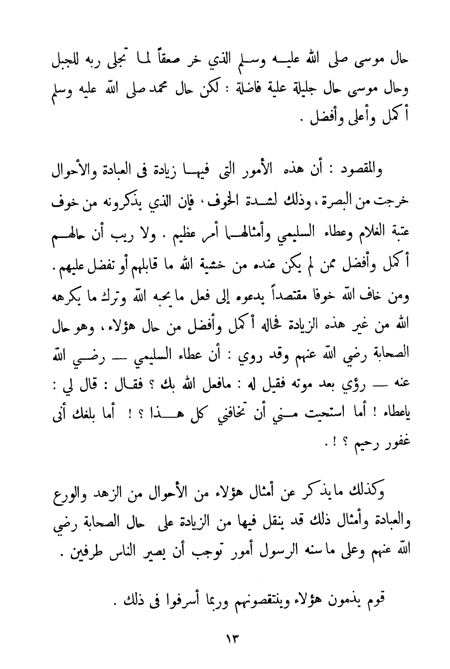 حَالِ مُوسَى صَلَّى اللَّهُ عَلَيْهِ وَسَلَّمَ الَّذِي خَرَّ صَعِقًا لَمَّا تَجَلَّى رَبُّهُ لِلْجَبَلِ وَحَالُ مُوسَى حَالٌ جَلِيلَةٌ عَلِيَّةٌ فَاضِلَةٌ: لَكِنَّ حَالَ مُحَمَّدٍ صَلَّى اللَّهُ عَلَيْهِ وَسَلَّمَ أَكْمَلُ وَأَعْلَى وَأَفْضَلُ. وَالْمَقْصُودُ: أَنَّ هَذِهِ الْأُمُورَ الَّتِي فِيهَا زِيَادَةٌ فِي الْعِبَادَةِ وَالْأَحْوَالِ خَرَجَتْ مِنْ الْبَصْرَةِ وَذَلِكَ لِشِدَّةِ الْخَوْفِ فَإِنَّ الَّذِي يَذْكُرُونَهُ مِنْ خَوْفِ عَتَبَةِ الْغُلَامِ وَعَطَاءِ السُّلَيْمِيِّ وَأَمْثَالِهِمَا أَمْرٌ عَظِيمٌ. وَلَا رَيْبَ أَنَّ حَالَهُمْ أَكْمَلُ وَأَفْضَلُ مِمَّنْ لَمْ يَكُنْ عِنْدَهُ مِنْ خَشْيَةِ اللَّهِ مَا قَابَلَهُمْ أَوْ تَفَضَّلَ عَلَيْهِمْ. وَمَنْ خَافَ اللَّهَ خَوْفًا مُقْتَصِدًا يَدْعُوهُ إلَى فِعْلِ مَا يُحِبُّهُ اللَّهُ وَتَرْكِ مَا يَكْرَهُهُ اللَّهُ مِنْ غَيْرِ هَذِهِ الزِّيَادَةِ فَحَالُهُ أَكْمَلُ وَأَفْضَلُ مِنْ حَالِ هَؤُلَاءِ وَهُوَ حَالُ الصَّحَابَةِ رَضِيَ اللَّهُ عَنْهُمْ وَقَدْ رُوِيَ: أَنَّ عَطَاءً السُّلَيْمِيَّ - رَضِيَ اللَّهُ عَنْهُ - رُئِيَ بَعْدَ مَوْتِهِ فَقِيلَ لَهُ: مَا فَعَلَ اللَّهُ بِك؟ فَقَالَ: قَالَ لِي: يَا عَطَاءُ أَمَا اسْتَحْيَتْ مِنِّي أَنْ تَخَافَنِي كُلَّ هَذَا أَمَا بَلَغَك أَنِّي غَفُورٌ رَحِيمٌ. وَكَذَلِكَ مَا يُذْكَرُ عَنْ أَمْثَالِ هَؤُلَاءِ مِنْ الْأَحْوَالِ مِنْ الزُّهْدِ وَالْوَرَعِ وَالْعِبَادَةِ وَأَمْثَالِ ذَلِكَ قَدْ يُنْقَلُ فِيهَا مِنْ الزِّيَادَةِ عَلَى حَالِ الصَّحَابَةِ رَضِيَ اللَّهُ عَنْهُمْ وَعَلَى مَا سَنَّهُ الرَّسُولُ أُمُورٌ تُوجِبُ أَنْ يَصِيرَ النَّاسُ طَرَفَيْنِ. قَوْمٌ يَذُمُّونَ هَؤُلَاءِ وينتقصونهم وَرُبَّمَا أَسْرَفُوا فِي ذَلِكَ.
