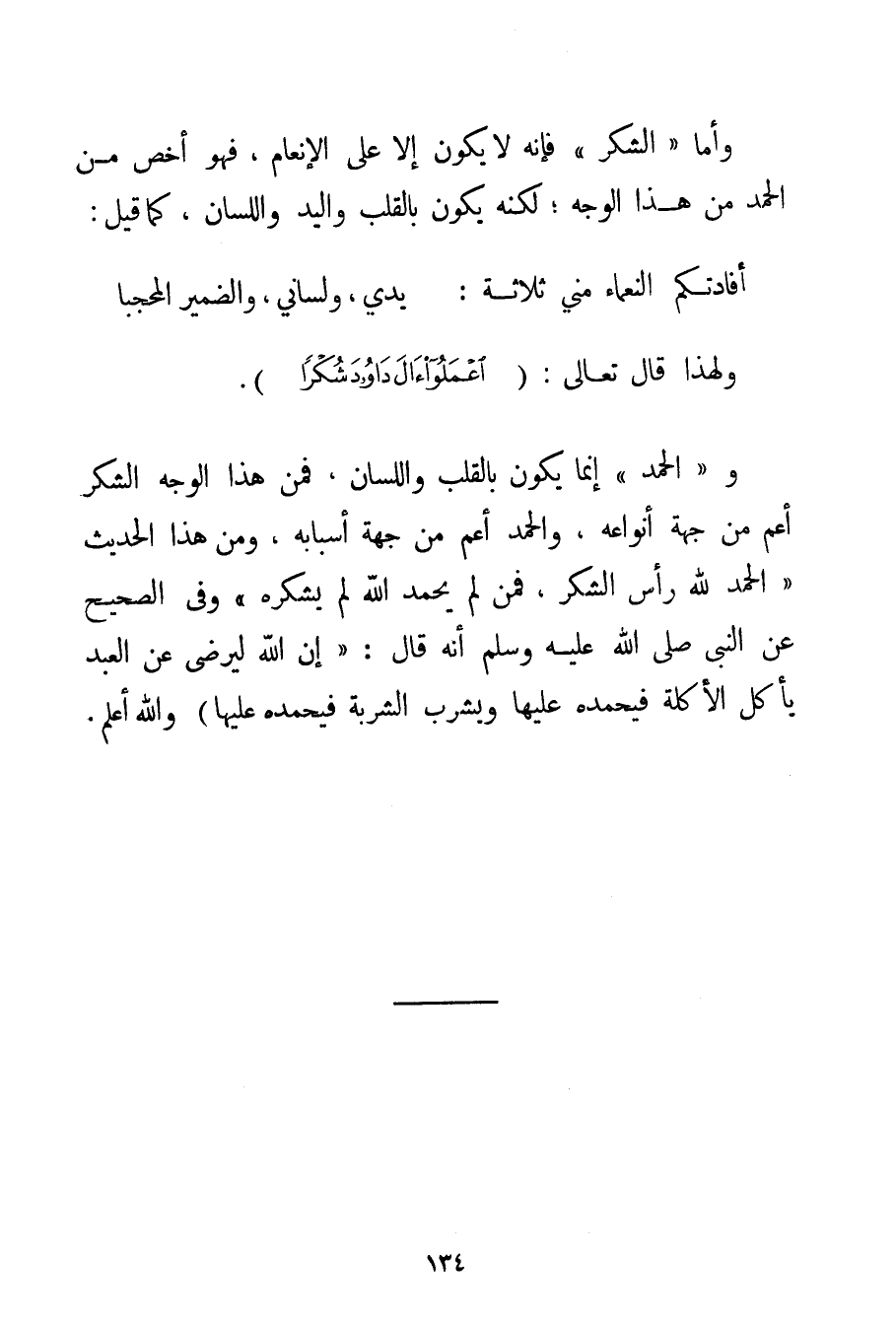 وَأَمَّا " الشُّكْرُ " فَإِنَّهُ لَا يَكُونُ إلَّا عَلَى الْإِنْعَامِ فَهُوَ أَخَصُّ مِنْ الْحَمْدِ مِنْ هَذَا الْوَجْهِ؛ لَكِنَّهُ يَكُونُ بِالْقَلْبِ وَالْيَدِ وَاللِّسَانِ كَمَا قِيلَ: أَفَادَتْكُمْ النَّعْمَاءُ مِنِّي ثَلَاثَةً: يَدِي وَلِسَانِي وَالضَّمِيرَ الْمُحَجَّبَا وَلِهَذَا قَالَ تَعَالَى: {اعْمَلُوا آلَ دَاوُدَ شُكْرًا} . وَ " الْحَمْدُ " إنَّمَا يَكُونُ بِالْقَلْبِ وَاللِّسَانِ فَمِنْ هَذَا الْوَجْهِ الشُّكْرُ أَعَمُّ مِنْ جِهَةِ أَنْوَاعِهِ وَالْحَمْدُ أَعَمُّ مِنْ جِهَةِ أَسْبَابِهِ وَمِنْ هَذَا الْحَدِيثِ {الْحَمْدُ لِلَّهِ رَأْسُ الشُّكْرِ فَمَنْ لَمْ يَحْمَدْ اللَّهَ لَمْ يَشْكُرْهُ} وَفِي الصَّحِيحِ عَنْ النَّبِيِّ صَلَّى اللَّهُ عَلَيْهِ وَسَلَّمَ أَنَّهُ قَالَ: {إنَّ اللَّهَ لَيَرْضَى عَنْ الْعَبْدِ يَأْكُلُ الْأَكْلَةَ فَيَحْمَدَهُ عَلَيْهَا وَيَشْرَبُ الشَّرْبَةَ فَيَحْمَدَهُ عَلَيْهَا} وَاَللَّهُ أَعْلَمُ.