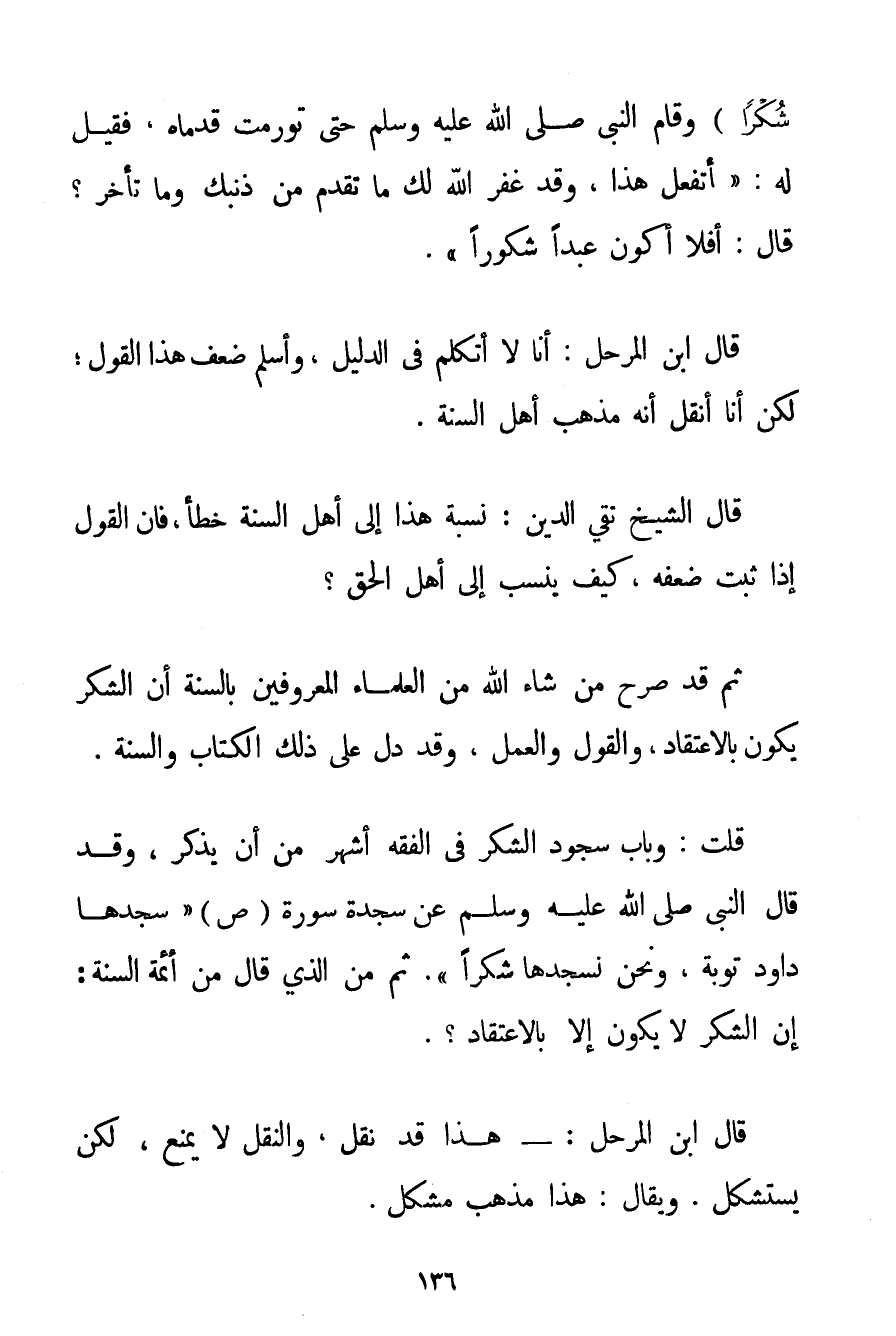 شُكْرًا} {وَقَامَ النَّبِيُّ صَلَّى اللَّهُ عَلَيْهِ وَسَلَّمَ حَتَّى تَوَرَّمَتْ قَدَمَاهُ فَقِيلَ لَهُ: أَتَفْعَلُ هَذَا وَقَدْ غَفَرَ اللَّهُ لَك مَا تَقَدَّمَ مِنْ ذَنْبِك وَمَا تَأَخَّرَ؟ قَالَ: أَفَلَا أَكُونُ عَبْدًا شَكُورًا} . قَالَ ابْنُ الْمُرَحَّلِ: أَنَا لَا أَتَكَلَّمُ فِي الدَّلِيلِ وَأُسَلِّمُ ضَعْفَ هَذَا الْقَوْلِ؛ لَكِنْ أَنَا أَنْقُلُ أَنَّهُ مَذْهَبُ أَهْلِ السُّنَّةِ. قَالَ الشَّيْخُ تَقِيُّ الدِّينِ: نِسْبَةُ هَذَا إلَى أَهْلِ السُّنَّةِ خَطَأٌ فَإِنَّ الْقَوْلَ إذَا ثَبَتَ ضَعْفُهُ كَيْفَ يُنْسَبُ إلَى أَهْلِ الْحَقِّ؟ ثُمَّ قَدْ صَرَّحَ مَنْ شَاءَ اللَّهُ مِنْ الْعُلَمَاءِ الْمَعْرُوفِينَ بِالسُّنَّةِ أَنَّ الشُّكْرَ يَكُونُ بِالِاعْتِقَادِ وَالْقَوْلِ وَالْعَمَلِ وَقَدْ دَلَّ عَلَى ذَلِكَ الْكِتَابُ وَالسُّنَّةُ. قُلْت: وَبَابُ سُجُودِ الشُّكْرِ فِي الْفِقْهِ أَشْهَرُ مِنْ أَنْ يُذْكَرَ وَقَدْ {قَالَ النَّبِيُّ صَلَّى اللَّهُ عَلَيْهِ وَسَلَّمَ عَنْ سَجْدَةِ سُورَةِ ص سَجَدَهَا دَاوُد تَوْبَةً وَنَحْنُ نَسْجُدُهَا شُكْرًا} . ثُمَّ مَنْ الَّذِي قَالَ مِنْ أَئِمَّةِ السُّنَّةِ: إنَّ الشُّكْرَ لَا يَكُونُ إلَّا بِالِاعْتِقَادِ؟ . قَالَ ابْنُ الْمُرَحَّلِ: - هَذَا قَدْ نُقِلَ وَالنَّقْلُ لَا يُمْنَعُ لَكِنْ يُسْتَشْكَلُ. وَيُقَالُ: هَذَا مَذْهَبٌ مُشْكِلٌ.