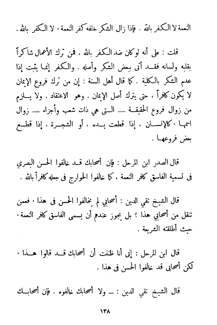 النِّعْمَةِ لَا الْكُفْرُ بِاَللَّهِ. قُلْت: عَلَى أَنَّهُ لَوْ كَانَ ضِدَّ الْكُفْرِ بِاَللَّهِ فَمَنْ تَرَكَ الْأَعْمَالَ شَاكِرًا بِقَلْبِهِ وَلِسَانِهِ فَقَدْ أَتَى بِبَعْضِ الشُّكْرِ وَأَصْلِهِ. وَالْكُفْرُ إنَّمَا يَثْبُتُ إذَا عُدِمَ الشُّكْرُ بِالْكُلِّيَّةِ. كَمَا قَالَ أَهْلُ السُّنَّةِ: إنَّ مَنْ تَرَكَ فُرُوعَ الْإِيمَانِ لَا يَكُونُ كَافِرًا حَتَّى يَتْرُكَ أَصْلَ الْإِيمَانِ. وَهُوَ الِاعْتِقَادُ. وَلَا يَلْزَمُ مِنْ زَوَالِ فُرُوعِ الْحَقِيقَةِ - الَّتِي هِيَ ذَاتُ شُعَبٍ وَأَجْزَاءٍ - زَوَالُ اسْمِهَا كَالْإِنْسَانِ إذَا قُطِعَتْ يَدُهُ أَوْ الشَّجَرَةِ إذَا قُطِعَ بَعْضُ فُرُوعِهَا. قَالَ الصَّدْرُ ابْنُ الْمُرَحَّلِ: فَإِنَّ أَصْحَابَك قَدْ خَالَفُوا الْحَسَنَ الْبَصْرِيَّ فِي تَسْمِيَةِ الْفَاسِقِ كَافِرَ النِّعْمَةِ كَمَا خَالَفُوا الْخَوَارِجَ فِي جَعْلِهِ كَافِرًا بِاَللَّهِ. قَالَ الشَّيْخُ تَقِيُّ الدِّينِ: أَصْحَابِي لَمْ يُخَالِفُوا الْحَسَنَ فِي هَذَا فَعَمَّنْ تَنْقُلُ مِنْ أَصْحَابِي هَذَا؟ بَلْ يَجُوزُ عِنْدَهُمْ أَنْ يُسَمَّى الْفَاسِقُ كَافِرَ النِّعْمَةِ حَيْثُ أَطْلَقَتْهُ الشَّرِيعَةُ. قَالَ ابْنُ الْمُرَحَّلِ: إنِّي أَنَا ظَنَنْت أَنَّ أَصْحَابَك قَدْ قَالُوا هَذَا لَكِنَّ أَصْحَابِي قَدْ خَالَفُوا الْحَسَنَ فِي هَذَا. قَالَ الشَّيْخُ تَقِيُّ الدِّينِ: - وَلَا أَصْحَابُك خَالَفُوهُ. فَإِنَّ أَصْحَابَك