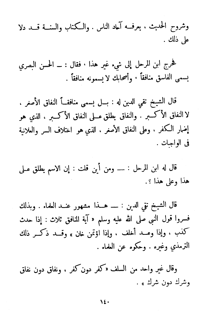 وَشُرُوحِ الْحَدِيثِ يَعْرِفُهُ آحَادُ النَّاسِ. وَالْكِتَابُ وَالسُّنَّةُ قَدْ دَلَّا عَلَى ذَلِكَ. فَخَرَجَ ابْنُ الْمُرَحَّلِ إلَى شَيْءٍ غَيْرِ هَذَا فَقَالَ: - الْحَسَنُ الْبَصْرِيُّ يُسَمَّى الْفَاسِقُ مُنَافِقًا وَأَصْحَابُك لَا يُسَمُّونَهُ مُنَافِقًا. قَالَ الشَّيْخُ تَقِيُّ الدِّينِ لَهُ: بَلْ يُسَمَّى مُنَافِقًا النِّفَاقَ الْأَصْغَرَ لَا النِّفَاقَ الْأَكْبَرَ. وَالنِّفَاقُ يُطْلَقُ عَلَى النِّفَاقِ الْأَكْبَرِ الَّذِي هُوَ إضْمَارُ الْكُفْرِ وَعَلَى النِّفَاقِ الْأَصْغَرِ الَّذِي هُوَ اخْتِلَافُ السِّرِّ وَالْعَلَانِيَةِ فِي الْوَاجِبَاتِ. قَالَ لَهُ ابْنُ الْمُرَحَّلِ: - وَمِنْ أَيْنَ قُلْت: إنَّ الِاسْمَ يُطْلَقُ عَلَى هَذَا وَعَلَى هَذَا؟ . قَالَ الشَّيْخُ تَقِيُّ الدِّينِ: - هَذَا مَشْهُورٌ عِنْدَ الْعُلَمَاءِ. وَبِذَلِكَ فَسَّرُوا قَوْلَ النَّبِيِّ صَلَّى اللَّهُ عَلَيْهِ وَسَلَّمَ {آيَةُ الْمُنَافِقِ ثَلَاثٌ: إذَا حَدَّثَ كَذَبَ وَإِذَا وَعَدَ أَخْلَفَ وَإِذَا اُؤْتُمِنَ خَانَ} وَقَدْ ذَكَرَ ذَلِكَ التِّرْمِذِيُّ وَغَيْرُهُ. وَحَكَوْهُ عَنْ الْعُلَمَاءِ. وَقَالَ غَيْرُ وَاحِدٍ مِنْ السَّلَفِ " كُفْرٌ دُونَ كُفْرٍ وَنِفَاقٌ دُونَ نِفَاقٍ وَشِرْكٌ دُونَ شِرْكٍ ". وَإِذَا كَانَ النِّفَاقُ جِنْسًا تَحْتَهُ نَوْعَانِ فَالْفَاسِقُ دَاخِلٌ فِي أَحَدِ نَوْعَيْهِ.