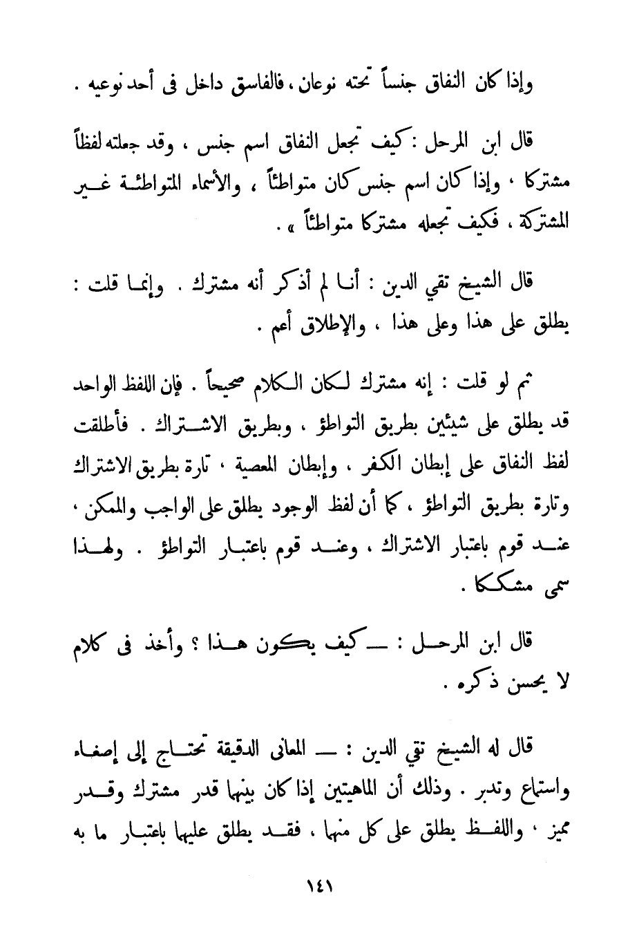 قَالَ ابْنُ الْمُرَحَّلِ: كَيْفَ تَجْعَلُ النِّفَاقَ اسْمَ جِنْسٍ وَقَدْ جَعَلْته لَفْظًا مُشْتَرَكًا وَإِذَا كَانَ اسْمَ جِنْسٍ كَانَ مُتَوَاطِئًا وَالْأَسْمَاءُ الْمُتَوَاطِئَةُ غَيْرُ الْمُشْتَرَكَةِ فَكَيْفَ تَجْعَلُهُ مُشْتَرَكًا مُتَوَاطِئًا ". قَالَ الشَّيْخُ تَقِيُّ الدِّينِ: أَنَا لَمْ أَذْكُرْ أَنَّهُ مُشْتَرَكٌ. وَإِنَّمَا قُلْت: يُطْلَقُ عَلَى هَذَا وَعَلَى هَذَا وَالْإِطْلَاقُ أَعَمُّ. ثُمَّ لَوْ قُلْت: إنَّهُ مُشْتَرَكٌ لَكَانَ الْكَلَامُ صَحِيحًا. فَإِنَّ اللَّفْظَ الْوَاحِدَ قَدْ يُطْلَقُ عَلَى شَيْئَيْنِ بِطَرِيقِ التَّوَاطُؤِ وَبِطَرِيقِ الِاشْتِرَاكِ. فَأَطْلَقْت لَفْظَ النِّفَاقِ عَلَى إبِطَانِ الْكُفْرِ وَإِبِطَانِ الْمَعْصِيَةِ تَارَةً بِطَرِيقِ الِاشْتِرَاكِ وَتَارَةً بِطَرِيقِ التَّوَاطُؤِ كَمَا أَنَّ لَفْظَ الْوُجُودِ يُطْلَقُ عَلَى الْوَاجِبِ وَالْمُمْكِنِ عِنْدَ قَوْمٍ بِاعْتِبَارِ الِاشْتِرَاكِ وَعِنْدَ قَوْمٍ بِاعْتِبَارِ التَّوَاطُؤِ. وَلِهَذَا سُمِّيَ مُشَكِّكًا. قَالَ ابْنُ الْمُرَحَّلِ: - كَيْفَ يَكُونُ هَذَا؟ وَأَخَذَ فِي كَلَامٍ لَا يَحْسُنُ ذِكْرُهُ. قَالَ لَهُ الشَّيْخُ تَقِيُّ الدِّينِ: - الْمَعَانِي الدَّقِيقَةُ تَحْتَاجُ إلَى إصْغَاءٍ وَاسْتِمَاعٍ وَتَدَبُّرٍ. وَذَلِكَ أَنَّ الْمَاهِيَّتَيْنِ إذَا كَانَ بَيْنَهُمَا قَدْرٌ مُشْتَرَكٌ وَقَدْرٌ مُمَيَّزٌ وَاللَّفْظُ يُطْلَقُ عَلَى كُلٍّ مِنْهُمَا فَقَدْ يُطْلَقُ عَلَيْهِمَا بِاعْتِبَارِ مَا بِهِ