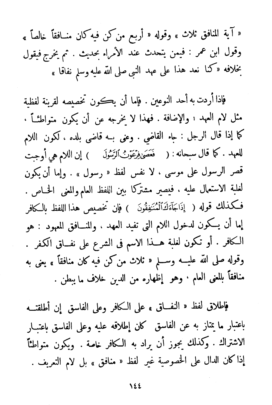 {آيَةُ الْمُنَافِقِ ثَلَاثٌ} وَقَوْلُهُ {أَرْبَعٌ مَنْ كُنَّ فِيهِ كَانَ مُنَافِقًا خَالِصًا} وَقَوْلُ ابْنِ عُمَرَ: فِيمَنْ يَتَحَدَّثُ عِنْدَ الْأُمَرَاءِ بِحَدِيثِ. ثُمَّ يَخْرُجُ فَيَقُولُ بِخِلَافِهِ " كُنَّا نَعُدُّ هَذَا عَلَى عَهْدِ النَّبِيِّ صَلَّى اللَّهُ عَلَيْهِ وَسَلَّمَ نِفَاقًا " فَإِذَا أَرَدْت بِهِ أَحَدَ النَّوْعَيْنِ. فَإِمَّا أَنْ يَكُونَ تَخْصِيصُهُ لِقَرِينَةٍ لَفْظِيَّةٍ مِثْلِ لَامِ الْعَهْدِ؛ وَالْإِضَافَةِ. فَهَذَا لَا يُخْرِجُهُ عَنْ أَنْ يَكُونَ مُتَوَاطِئًا كَمَا إذَا قَالَ الرَّجُلُ: جَاءَ الْقَاضِي. وَعَنَى بِهِ قَاضِيَ بَلَدِهِ لِكَوْنِ اللَّامِ لِلْعَهْدِ. كَمَا قَالَ سُبْحَانَهُ: {فَعَصَى فِرْعَوْنُ الرَّسُولَ} أَنَّ اللَّامَ هِيَ أَوْجَبَتْ قَصْرَ الرَّسُولِ عَلَى مُوسَى لَا نَفْسِ لَفْظِ " رَسُولٍ ". وَإِمَّا أَنْ يَكُونَ لِغَلَبَةِ الِاسْتِعْمَالِ عَلَيْهِ فَيَصِيرُ مُشْتَرَكًا بَيْنَ اللَّفْظِ الْعَامِّ وَالْمَعْنَى الْخَاصِّ. فَكَذَلِكَ قَوْلُهُ {إذَا جَاءَكَ الْمُنَافِقُونَ} فَإِنَّ تَخْصِيصَ هَذَا اللَّفْظِ بِالْكَافِرِ إمَّا أَنْ يَكُونَ لِدُخُولِ اللَّامِ الَّتِي تُفِيدُ الْعَهْدَ وَالْمُنَافِقُ الْمَعْهُودُ: هُوَ الْكَافِرُ. أَوْ تَكُونُ لِغَلَبَةِ هَذَا الِاسْمِ فِي الشَّرْعِ عَلَى نِفَاقِ الْكُفْرِ. وَقَوْلُهُ صَلَّى اللَّهُ عَلَيْهِ وَسَلَّمَ {ثَلَاثٌ مَنْ كُنَّ فِيهِ كَانَ مُنَافِقًا} يَعْنِي بِهِ مُنَافِقًا بِالْمَعْنَى الْعَامِّ وَهُوَ إظْهَارُهُ مِنْ الدِّينِ خِلَافَ مَا يُبْطِنُ. فَإِطْلَاقُ لَفْظِ " النِّفَاقِ " عَلَى الْكَافِرِ وَعَلَى الْفَاسِقِ إنْ أَطْلَقْته بِاعْتِبَارِ مَا يَمْتَازُ بِهِ عَنْ الْفَاسِقِ. كَانَ إطْلَاقُهُ عَلَيْهِ وَعَلَى الْفَاسِقِ بِاعْتِبَارِ الِاشْتِرَاكِ. وَكَذَلِكَ يَجُوزُ أَنْ يُرَادَ بِهِ الْكَافِرُ خَاصَّةً. وَيَكُونُ مُتَوَاطِئًا إذَا كَانَ الدَّالُّ عَلَى الْخُصُوصِيَّةِ غَيْرَ لَفْظِ " مُنَافِقٍ " بَلْ لَامُ التَّعْرِيفِ.