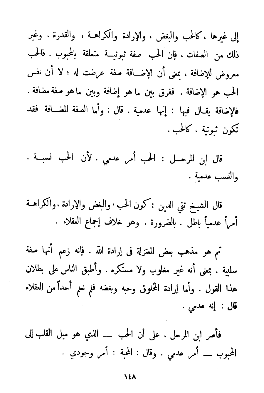 إلَى غَيْرِهَا كَالْحُبِّ وَالْبُغْضِ وَالْإِرَادَةِ وَالْكَرَاهَةِ وَالْقُدْرَةِ وَغَيْرِ ذَلِكَ مِنْ الصِّفَاتِ فَإِنَّ الْحُبَّ صِفَةٌ ثُبُوتِيَّةٌ مُتَعَلِّقَةٌ بِالْمَحْبُوبِ. فَالْحُبُّ مَعْرُوضٌ لِلْإِضَافَةِ بِمَعْنَى أَنَّ الْإِضَافَةَ صِفَةٌ عَرَضَتْ لَهُ؛ لَا أَنَّ نَفْسَ الْحُبِّ هُوَ الْإِضَافَةُ. فَفَرْقٌ بَيْنَ مَا هُوَ إضَافَةٌ وَبَيْنَ مَا هُوَ صِفَةٌ مُضَافَةٌ. فَالْإِضَافَةُ يُقَالُ فِيهَا: إنَّهَا عَدَمِيَّةٌ. قَالَ: وَأَمَّا الصِّفَةُ الْمُضَافَةُ فَقَدْ تَكُونُ ثُبُوتِيَّةً كَالْحُبِّ. قَالَ ابْنُ الْمُرَحَّلِ: الْحُبُّ أَمْرٌ عَدَمِيٌّ. لِأَنَّ الْحُبَّ نِسْبَةٌ وَالنِّسَبَ عَدَمِيَّةٌ. قَالَ الشَّيْخُ تَقِيُّ الدِّينِ: كَوْنُ الْحُبِّ وَالْبُغْضِ وَالْإِرَادَةِ وَالْكَرَاهَةِ أَمْرًا عَدَمِيًّا بَاطِلٌ. بِالضَّرُورَةِ. وَهُوَ خِلَافُ إجْمَاعِ الْعُقَلَاءِ. ثُمَّ هُوَ مَذْهَبُ بَعْضِ الْمُعْتَزِلَةِ فِي إرَادَةِ اللَّهِ. فَإِنَّهُ زَعَمَ أَنَّهَا صِفَةٌ سَلْبِيَّةٌ. بِمَعْنَى أَنَّهُ غَيْرُ مَغْلُوبٍ وَلَا مُسْتَكْرَهٍ. وَأَطْبَقَ النَّاسُ عَلَى بُطْلَانِ هَذَا الْقَوْلِ. وَأَمَّا إرَادَةُ الْمَخْلُوقِ وَحُبُّهُ وَبُغْضُهُ فَلَمْ نَعْلَمْ أَحَدًا مِنْ الْعُقَلَاءِ قَالَ: إنَّهُ عَدَمِيٌّ. فَأَصَرَّ ابْنُ الْمُرَحَّلِ عَلَى أَنَّ الْحُبَّ - الَّذِي هُوَ مَيْلُ الْقَلْبِ إلَى الْمَحْبُوبِ - أَمْرٌ عَدَمِيٌّ. وَقَالَ: الْمَحَبَّةُ: أَمْرٌ وُجُودِيٌّ.