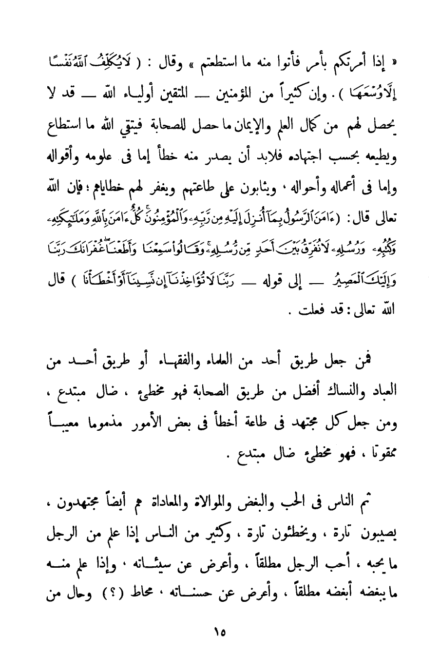 {إذَا أَمَرْتُكُمْ بِأَمْرِ فَأْتُوا مِنْهُ مَا اسْتَطَعْتُمْ} وَقَالَ: {لَا يُكَلِّفُ اللَّهُ نَفْسًا إلَّا وُسْعَهَا} . وَإِنَّ كَثِيرًا مِنْ الْمُؤْمِنِينَ - الْمُتَّقِينَ أَوْلِيَاءُ اللَّهِ - قَدْ لَا يَحْصُلُ لَهُمْ مِنْ كَمَالِ الْعِلْمِ وَالْإِيمَانِ مَا حَصَلَ لِلصَّحَابَةِ فَيَتَّقِي اللَّهَ مَا اسْتَطَاعَ وَيُطِيعُهُ بِحَسَبِ اجْتِهَادِهِ فَلَا بُدَّ أَنْ يَصْدُرَ مِنْهُ خَطَأٌ إمَّا فِي عُلُومِهِ وَأَقْوَالِهِ وَإِمَّا فِي أَعْمَالِهِ وَأَحْوَالِهِ وَيُثَابُونَ عَلَى طَاعَتِهِمْ وَيَغْفِرُ لَهُمْ خَطَايَاهُمْ؛ فَإِنَّ اللَّهَ تَعَالَى قَالَ: {آمَنَ الرَّسُولُ بِمَا أُنْزِلَ إلَيْهِ مِنْ رَبِّهِ وَالْمُؤْمِنُونَ كُلٌّ آمَنَ بِاللَّهِ وَمَلَائِكَتِهِ وَكُتُبِهِ وَرُسُلِهِ لَا نُفَرِّقُ بَيْنَ أَحَدٍ مِنْ رُسُلِهِ وَقَالُوا سَمِعْنَا وَأَطَعْنَا غُفْرَانَكَ رَبَّنَا وَإِلَيْكَ الْمَصِيرُ} - إلَى قَوْلِهِ - {رَبَّنَا لَا تُؤَاخِذْنَا إنْ نَسِينَا أَوْ أَخْطَأْنَا} قَالَ اللَّهُ تَعَالَى: قَدْ فَعَلْت. فَمَنْ جَعَلَ طَرِيقَ أَحَدٍ مِنْ الْعُلَمَاءِ وَالْفُقَهَاءِ أَوْ طَرِيقَ أَحَدٍ مِنْ الْعُبَّادِ وَالنُّسَّاكِ أَفْضَلَ مِنْ طَرِيقِ الصَّحَابَةِ فَهُوَ مُخْطِئٌ ضَالٌّ مُبْتَدِعٌ وَمَنْ جَعَلَ كُلَّ مُجْتَهِدٍ فِي طَاعَةٍ أَخْطَأَ فِي بَعْضِ الْأُمُورِ مَذْمُومًا مَعِيبًا مَمْقُوتًا فَهُوَ مُخْطِئٌ ضَالٌّ مُبْتَدِعٌ. ثُمَّ النَّاسُ فِي الْحُبِّ وَالْبُغْضِ وَالْمُوَالَاةِ وَالْمُعَادَاةِ هُمْ أَيْضًا مُجْتَهِدُونَ يُصِيبُونَ تَارَةً وَيُخْطِئُونَ تَارَةً [وَكَثِيرٌ مِنْ النَّاسِ إذَا عَلِمَ مِنْ الرَّجُلِ مَا يُحِبُّهُ أَحَبَّ الرَّجُلَ مُطْلَقًا وَأَعْرَضَ عَنْ سَيِّئَاتِهِ وَإِذَا عَلِمَ مِنْهُ مَا يُبْغِضُهُ أَبْغَضَهُ مُطْلَقًا وَأَعْرَضَ عَنْ حَسَنَاتِهِ مُحَاطٌ؟ وَحَالُ مَنْ