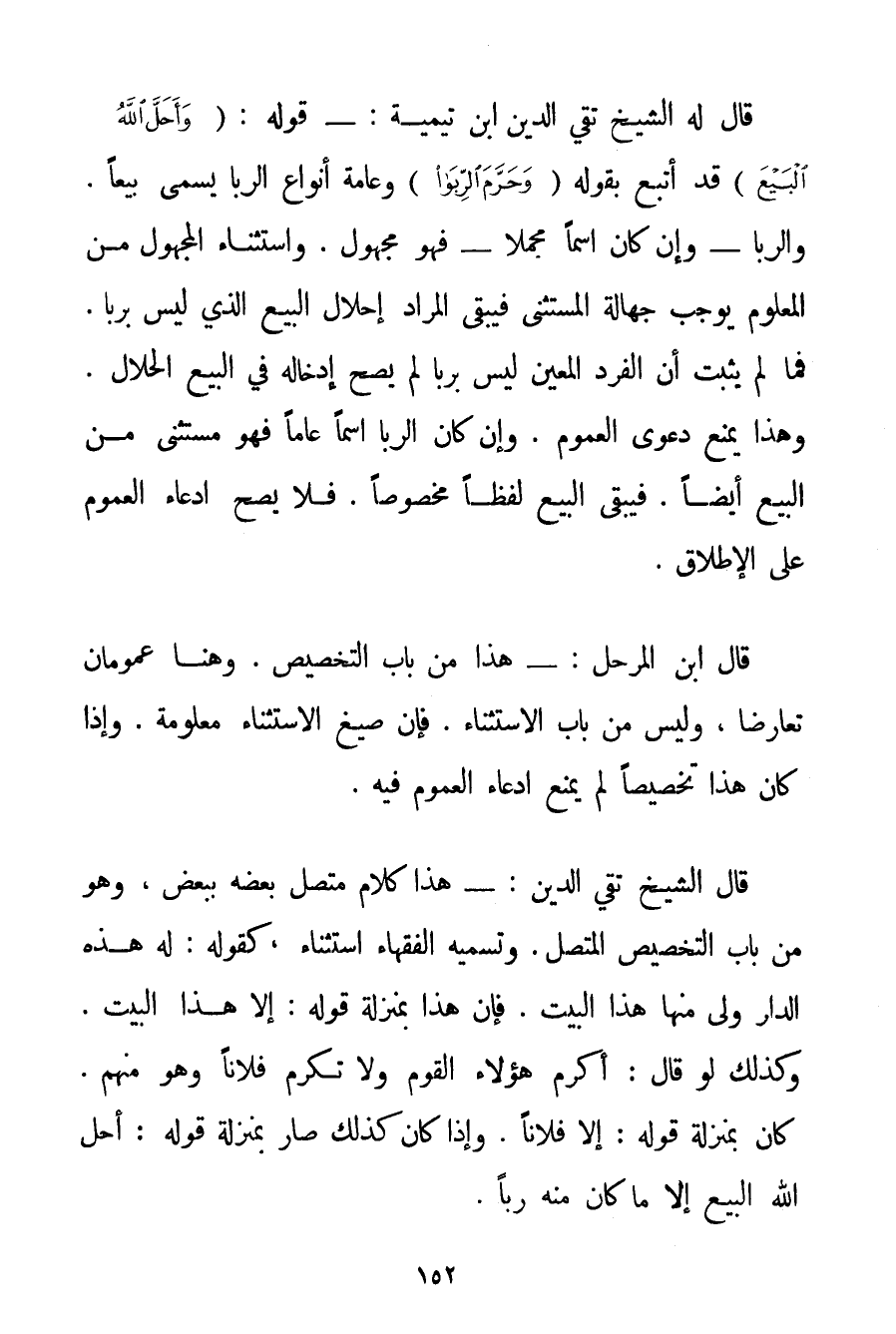قَالَ لَهُ الشَّيْخُ تَقِيُّ الدِّينِ ابْنُ تَيْمِيَّة: - قَوْلُهُ: {وَأَحَلَّ اللَّهُ الْبَيْعَ} قَدْ أُتْبِعَ بِقَوْلِهِ {وَحَرَّمَ الرِّبَا} وَعَامَّةُ أَنْوَاعِ الرِّبَا يُسَمَّى بَيْعًا. وَالرِّبَا - وَإِنْ كَانَ اسْمًا مُجْمَلًا - فَهُوَ مَجْهُولٌ. وَاسْتِثْنَاءُ الْمَجْهُولِ مِنْ الْمَعْلُومِ يُوجِبُ جَهَالَةَ الْمُسْتَثْنَى فَيَبْقَى الْمُرَادُ إحْلَالُ الْبَيْعِ الَّذِي لَيْسَ بِرِبَا. فَمَا لَمْ يَثْبُتْ أَنَّ الْفَرْدَ الْمُعَيَّنَ لَيْسَ بِرِبَا لَمْ يَصِحَّ إدْخَالُهُ فِي الْبَيْعِ الْحَلَالِ. وَهَذَا يَمْنَعُ دَعْوَى الْعُمُومِ. وَإِنْ كَانَ الرِّبَا اسْمًا عَامًّا فَهُوَ مُسْتَثْنًى مِنْ الْبَيْعِ أَيْضًا. فَيَبْقَى الْبَيْعُ لَفْظًا مَخْصُوصًا. فَلَا يَصِحُّ ادِّعَاءُ الْعُمُومِ عَلَى الْإِطْلَاقِ. قَالَ ابْنُ الْمُرَحَّلِ: - هَذَا مِنْ بَابِ التَّخْصِيصِ. وَهُنَا عمومان تَعَارَضَا وَلَيْسَ مِنْ بَابِ الِاسْتِثْنَاءِ. فَإِنَّ صِيَغَ الِاسْتِثْنَاءِ مَعْلُومَةٌ. وَإِذَا كَانَ هَذَا تَخْصِيصًا لَمْ يَمْنَعْ ادِّعَاءَ الْعُمُومِ فِيهِ. قَالَ الشَّيْخُ تَقِيُّ الدِّينِ: - هَذَا كَلَامٌ مُتَّصِلٌ بَعْضُهُ بِبَعْضِ وَهُوَ مِنْ بَابِ التَّخْصِيصِ الْمُتَّصِلِ. وَتُسَمِّيه الْفُقَهَاءُ اسْتِثْنَاءً كَقَوْلِهِ: لَهُ هَذِهِ الدَّارُ وَلِي مِنْهَا هَذَا الْبَيْتُ. فَإِنَّ هَذَا بِمَنْزِلَةِ قَوْلِهِ: إلَّا هَذَا الْبَيْتُ. وَكَذَلِكَ لَوْ قَالَ: أَكْرِمْ هَؤُلَاءِ الْقَوْمَ وَلَا تُكْرِمْ فُلَانًا وَهُوَ مِنْهُمْ. كَانَ بِمَنْزِلَةِ قَوْلِهِ: إلَّا فُلَانًا. وَإِذَا كَانَ كَذَلِكَ صَارَ بِمَنْزِلَةِ قَوْلِهِ: أَحَلَّ اللَّهُ الْبَيْعَ إلَّا مَا كَانَ مِنْهُ رِبًا.
