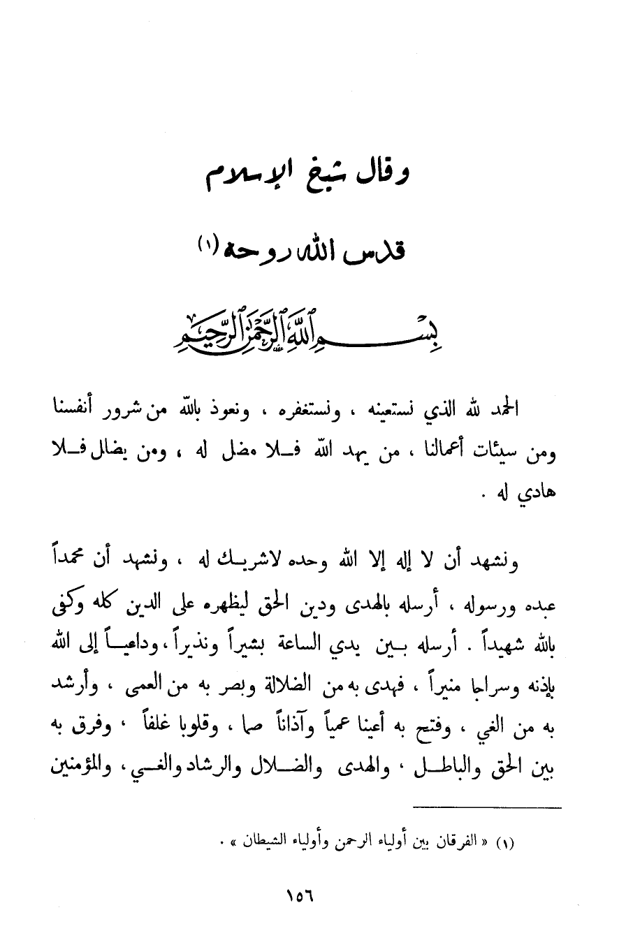 الْحَمْدُ لِلَّهِ الَّذِي نَسْتَعِينُهُ وَنَسْتَغْفِرُهُ وَنَعُوذُ بِاَللَّهِ مِنْ شُرُورِ أَنْفُسِنَا وَمِنْ سَيِّئَاتِ أَعْمَالِنَا مَنْ يَهْدِ اللَّهُ فَلَا مُضِلَّ لَهُ وَمَنْ يُضْلِلْ فَلَا هَادِيَ لَهُ. وَنَشْهَدُ أَنْ لَا إلَهَ إلَّا اللَّهُ وَحْدَهُ لَا شَرِيكَ لَهُ وَنَشْهَدُ أَنَّ مُحَمَّدًا عَبْدُهُ وَرَسُولُهُ أَرْسَلَهُ بِالْهُدَى وَدِينِ الْحَقِّ لِيُظْهِرَهُ عَلَى الدِّينِ كُلِّهِ وَكَفَى بِاَللَّهِ شَهِيدًا. أَرْسَلَهُ بَيْنَ يَدَيْ السَّاعَةِ بَشِيرًا وَنَذِيرًا وَدَاعِيًا إلَى اللَّهِ بِإِذْنِهِ وَسِرَاجًا مُنِيرًا فَهَدَى بِهِ مِنْ الضَّلَالَةِ وَبَصَّرَ بِهِ مِنْ الْعَمَى وَأَرْشَدَ بِهِ مِنْ الْغَيِّ وَفَتَحَ بِهِ أَعْيُنًا عُمْيًا وَآذَانًا صُمًّا وَقُلُوبًا غُلْفًا وَفَرَقَ بِهِ بَيْنَ الْحَقِّ وَالْبَاطِلِ وَالْهُدَى وَالضَّلَالِ وَالرَّشَادِ وَالْغَيِّ وَالْمُؤْمِنِينَ