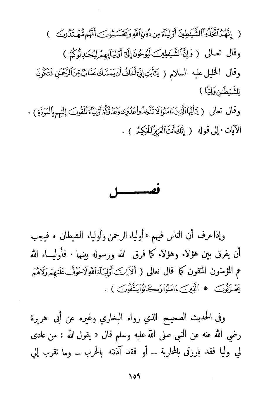 أَوْلِيَاءَهُ فَلَا تَخَافُوهُمْ وَخَافُونِ إنْ كُنْتُمْ مُؤْمِنِينَ} وَقَالَ تَعَالَى {إنَّا جَعَلْنَا الشَّيَاطِينَ أَوْلِيَاءَ لِلَّذِينَ لَا يُؤْمِنُونَ} {وَإِذَا فَعَلُوا فَاحِشَةً قَالُوا وَجَدْنَا عَلَيْهَا آبَاءَنَا} إلَى قَوْلِهِ {إنَّهُمُ اتَّخَذُوا الشَّيَاطِينَ أَوْلِيَاءَ مِنْ دُونِ اللَّهِ وَيَحْسَبُونَ أَنَّهُمْ مُهْتَدُونَ} وَقَالَ تَعَالَى {وَإِنَّ الشَّيَاطِينَ لَيُوحُونَ إلَى أَوْلِيَائِهِمْ لِيُجَادِلُوكُمْ} وَقَالَ الْخَلِيلُ عَلَيْهِ السَّلَامُ {يَا أَبَتِ إنِّي أَخَافُ أَنْ يَمَسَّكَ عَذَابٌ مِنَ الرَّحْمَنِ فَتَكُونَ لِلشَّيْطَانِ وَلِيًّا} وَقَالَ تَعَالَى {يَا أَيُّهَا الَّذِينَ آمَنُوا لَا تَتَّخِذُوا عَدُوِّي وَعَدُوَّكُمْ أَوْلِيَاءَ تُلْقُونَ إلَيْهِمْ بِالْمَوَدَّةِ} الْآيَاتِ إلَى قَوْلِهِ {إنَّكَ أَنْتَ الْعَزِيزُ الْحَكِيمُ} .