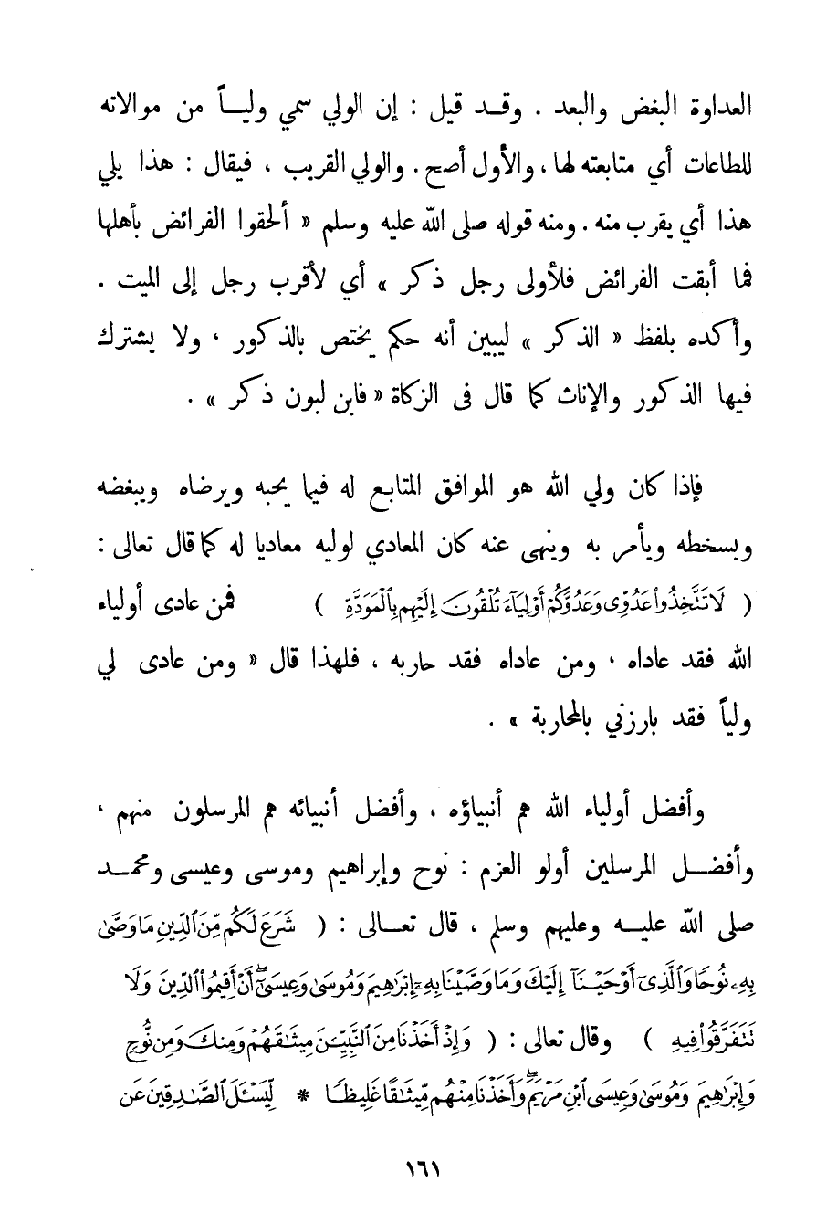 الْعَدَاوَةِ الْبُغْضُ وَالْبُعْدُ. وَقَدْ قِيلَ: إنَّ الْوَلِيَّ سُمِّيَ وَلِيًّا مِنْ مُوَالَاتِهِ لِلطَّاعَاتِ أَيْ مُتَابَعَتِهِ لَهَا وَالْأَوَّلُ أَصَحُّ. وَالْوَلِيُّ الْقَرِيبُ فَيُقَالُ: هَذَا يَلِي هَذَا أَيْ يَقْرُبُ مِنْهُ. وَمِنْهُ قَوْلُهُ صَلَّى اللَّهُ عَلَيْهِ وَسَلَّمَ {أَلْحِقُوا الْفَرَائِضَ بِأَهْلِهَا فَمَا أَبْقَتْ الْفَرَائِضُ فَلِأَوْلَى رَجُلٍ ذَكَرٍ} أَيْ لِأَقْرَبِ رَجُلٍ إلَى الْمَيِّتِ. وَأَكَّدَهُ بِلَفْظِ " الذَّكَرِ " لِيُبَيِّنَ أَنَّهُ حُكْمٌ يَخْتَصُّ بِالذُّكُورِ وَلَا يَشْتَرِكُ فِيهَا الذُّكُورُ وَالْإِنَاثُ كَمَا قَالَ فِي الزَّكَاةِ {فَابْنُ لَبُونٍ ذَكَرٍ} . فَإِذَا كَانَ وَلِيُّ اللَّهِ هُوَ الْمُوَافِقُ الْمُتَابِعُ لَهُ فِيمَا يُحِبُّهُ وَيَرْضَاهُ وَيُبْغِضُهُ وَيُسْخِطُهُ وَيَأْمُرُ بِهِ وَيَنْهَى عَنْهُ كَانَ الْمُعَادِي لِوَلِيِّهِ مُعَادِيًا لَهُ كَمَا قَالَ تَعَالَى: {لَا تَتَّخِذُوا عَدُوِّي وَعَدُوَّكُمْ أَوْلِيَاءَ تُلْقُونَ إلَيْهِمْ بِالْمَوَدَّةِ} فَمَنْ عَادَى أَوْلِيَاءَ اللَّهِ فَقَدْ عَادَاهُ وَمَنْ عَادَاهُ فَقَدْ حَارَبَهُ فَلِهَذَا قَالَ {وَمَنْ عَادَى لِي وَلِيًّا فَقَدْ بَارَزَنِي بِالْمُحَارَبَةِ} . وَأَفْضَلُ أَوْلِيَاءِ اللَّهِ هُمْ أَنْبِيَاؤُهُ وَأَفْضَلُ أَنْبِيَائِهِ هُمْ الْمُرْسَلُونَ مِنْهُمْ وَأَفْضَلُ الْمُرْسَلِينَ أُولُو الْعَزْمِ: نُوحٌ وَإِبْرَاهِيمُ وَمُوسَى وَعِيسَى وَمُحَمَّدٌ صَلَّى اللَّهُ عَلَيْهِ وَسَلَّمَ قَالَ تَعَالَى: {شَرَعَ لَكُمْ مِنَ الدِّينِ مَا وَصَّى بِهِ نُوحًا وَالَّذِي أَوْحَيْنَا إلَيْكَ وَمَا وَصَّيْنَا بِهِ إبْرَاهِيمَ وَمُوسَى وَعِيسَى أَنْ أَقِيمُوا الدِّينَ وَلَا تَتَفَرَّقُوا فِيهِ} وَقَالَ تَعَالَى: {وَإِذْ أَخَذْنَا مِنَ النَّبِيِّينَ مِيثَاقَهُمْ وَمِنْكَ وَمِنْ نُوحٍ وَإِبْرَاهِيمَ وَمُوسَى وَعِيسَى ابْنِ