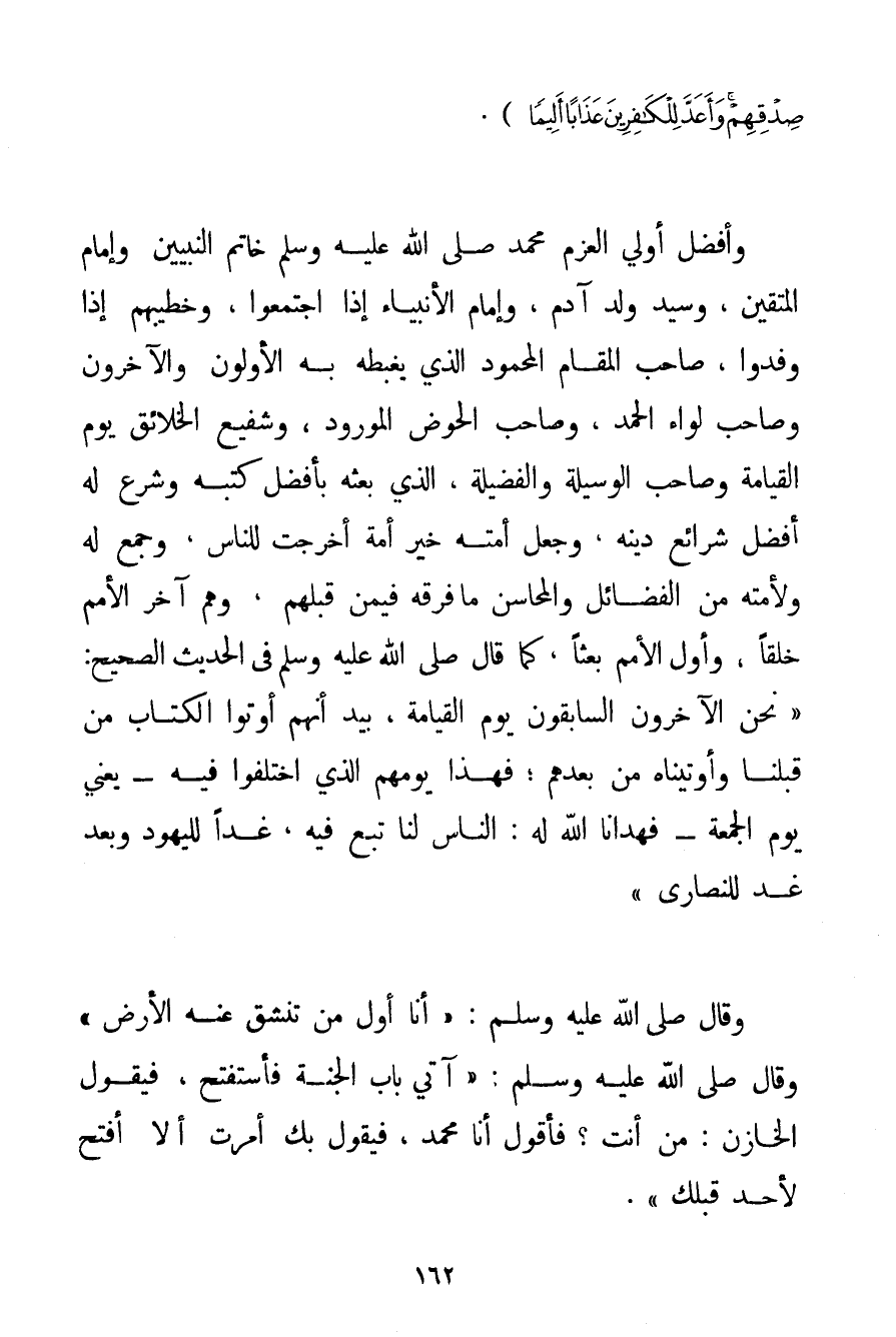 مَرْيَمَ وَأَخَذْنَا مِنْهُمْ مِيثَاقًا غَلِيظًا} {لِيَسْأَلَ الصَّادِقِينَ عَنْ صِدْقِهِمْ وَأَعَدَّ لِلْكَافِرِينَ عَذَابًا أَلِيمًا} . وَأَفْضَلُ أُولِي الْعَزْمِ مُحَمَّدٌ صَلَّى اللَّهُ عَلَيْهِ وَسَلَّمَ خَاتَمُ النَّبِيِّينَ وَإِمَامُ الْمُتَّقِينَ وَسَيِّدُ وَلَدِ آدَمَ وَإِمَامُ الْأَنْبِيَاءِ إذَا اجْتَمَعُوا وَخَطِيبُهُمْ إذَا وَفَدُوا صَاحِبُ الْمَقَامِ الْمَحْمُودِ الَّذِي يَغْبِطُهُ بِهِ الْأَوَّلُونَ وَالْآخَرُونَ وَصَاحِبُ لِوَاءِ الْحَمْدِ وَصَاحِبُ الْحَوْضِ الْمَوْرُودِ وَشَفِيعُ الْخَلَائِقِ يَوْمَ الْقِيَامَةِ وَصَاحِبُ الْوَسِيلَةِ وَالْفَضِيلَةِ الَّذِي بَعَثَهُ بِأَفْضَلِ كُتُبِهِ وَشَرَعَ لَهُ أَفْضَلَ شَرَائِعِ دِينِهِ وَجَعَلَ أُمَّتَهُ خَيْرَ أُمَّةٍ أُخْرِجَتْ لِلنَّاسِ وَجَمَعَ لَهُ وَلِأُمَّتِهِ مِنْ الْفَضَائِلِ وَالْمَحَاسِنِ مَا فَرَّقَهُ فِيمَنْ قَبْلَهُمْ وَهُمْ آخِرُ الْأُمَمِ خَلْقًا وَأَوَّلُ الْأُمَمِ بَعْثًا كَمَا قَالَ صَلَّى اللَّهُ عَلَيْهِ وَسَلَّمَ فِي الْحَدِيثِ الصَّحِيحِ: {نَحْنُ الْآخَرُونَ السَّابِقُونَ يَوْمَ الْقِيَامَةِ بَيْدَ أَنَّهُمْ أُوتُوا الْكِتَابَ مِنْ قَبْلِنَا وَأُوتِينَاهُ مِنْ بَعْدِهِمْ؛ فَهَذَا يَوْمُهُمْ الَّذِي اخْتَلَفُوا فِيهِ - يَعْنِي يَوْمَ الْجُمْعَةِ - فَهَدَانَا اللَّهُ لَهُ: النَّاسُ لَنَا تَبَعٌ فِيهِ غَدًا لِلْيَهُودِ وَبَعْدَ غَد لِلنَّصَارَى} . وَقَالَ صَلَّى اللَّهُ عَلَيْهِ وَسَلَّمَ {أَنَا أَوَّلُ مَنْ تَنْشَقُّ عَنْهُ الْأَرْضُ} وَقَالَ صَلَّى اللَّهُ عَلَيْهِ وَسَلَّمَ {آتِي بَابَ الْجَنَّةِ فَأَسْتَفْتِحُ فَيَقُولُ الْخَازِنُ: مَنْ أَنْتَ. فَأَقُولُ أَنَا مُحَمَّدٌ فَيَقُولُ بِك أُمِرْت أَلَّا أَفْتَحَ لِأَحَدِ قَبْلَك} .