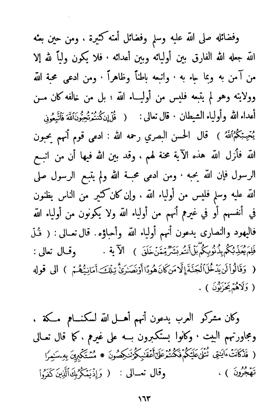 وَفَضَائِلُهُ صَلَّى اللَّهُ عَلَيْهِ وَسَلَّمَ وَفَضَائِلُ أُمَّتِهِ كَثِيرَةٌ وَمِنْ حِينِ بَعَثَهُ اللَّهُ جَعَلَهُ اللَّهُ الْفَارِقَ بَيْنَ أَوْلِيَائِهِ وَبَيْنَ أَعْدَائِهِ فَلَا يَكُونُ وَلِيًّا لِلَّهِ إلَّا مَنْ آمَنَ بِهِ وَبِمَا جَاءَ بِهِ وَاتَّبَعَهُ بَاطِنًا وَظَاهِرًا وَمَنْ ادَّعَى مَحَبَّةَ اللَّهِ وَوِلَايَتَهُ وَهُوَ لَمْ يَتْبَعْهُ فَلَيْسَ مِنْ أَوْلِيَاءِ اللَّهِ؛ بَلْ مَنْ خَالَفَهُ كَانَ مِنْ أَعْدَاءِ اللَّهِ وَأَوْلِيَاءِ الشَّيْطَانِ قَالَ تَعَالَى: {قُلْ إنْ كُنْتُمْ تُحِبُّونَ اللَّهَ فَاتَّبِعُونِي يُحْبِبْكُمُ اللَّهُ} قَالَ الْحَسَنُ الْبَصْرِيُّ رَحِمَهُ اللَّهُ ادَّعَى قَوْمٌ أَنَّهُمْ يُحِبُّونَ اللَّهَ فَأَنْزَلَ اللَّهُ هَذِهِ الْآيَةَ مِحْنَةً لَهُمْ وَقَدْ بَيَّنَ اللَّهُ فِيهَا أَنَّ مَنْ اتَّبَعَ الرَّسُولَ فَإِنَّ اللَّهَ يُحِبُّهُ وَمَنْ ادَّعَى مَحَبَّةَ اللَّهِ وَلَمْ يَتَّبِعْ الرَّسُولَ صَلَّى اللَّهُ عَلَيْهِ وَسَلَّمَ فَلَيْسَ مِنْ أَوْلِيَاءِ اللَّهِ وَإِنْ كَانَ كَثِيرٌ مِنْ النَّاسِ يَظُنُّونَ فِي أَنْفُسِهِمْ أَوْ فِي غَيْرِهِمْ أَنَّهُمْ مِنْ أَوْلِيَاءِ اللَّهِ وَلَا يَكُونُونَ مِنْ أَوْلِيَاءِ اللَّهِ فَالْيَهُودُ وَالنَّصَارَى يَدَّعُونَ أَنَّهُمْ أَوْلِيَاءُ اللَّهِ وَأَحِبَّاؤُهُ. قَالَ تَعَالَى: {قُلْ فَلِمَ يُعَذِّبُكُمْ بِذُنُوبِكُمْ بَلْ أَنْتُمْ بَشَرٌ مِمَّنْ خَلَقَ} الْآيَةَ. وَقَالَ تَعَالَى: {وَقَالُوا لَنْ يَدْخُلَ الْجَنَّةَ إلَّا مَنْ كَانَ هُودًا أَوْ نَصَارَى تِلْكَ أَمَانِيُّهُمْ} إلَى قَوْلِهِ {وَلَا هُمْ يَحْزَنُونَ} . وَكَانَ مُشْرِكُو الْعَرَبِ يَدَّعُونَ أَنَّهُمْ أَهْلُ اللَّهِ لِسُكْنَاهُمْ مَكَّةَ وَمُجَاوَرَتِهِمْ الْبَيْتَ وَكَانُوا يَسْتَكْبِرُونَ بِهِ عَلَى غَيْرِهِمْ كَمَا قَالَ تَعَالَى {قَدْ كَانَتْ آيَاتِي تُتْلَى عَلَيْكُمْ فَكُنْتُمْ عَلَى أَعْقَابِكُمْ تَنْكِصُونَ} {مُسْتَكْبِرِينَ بِهِ سَامِرًا تَهْجُرُونَ} وَقَالَ تَعَالَى: {وَإِذْ يَمْكُرُ بِكَ الَّذِينَ كَفَرُوا لِيُثْبِتُوكَ أَوْ يَقْتُلُوكَ} إلَى قَوْلِهِ {وَهُمْ يَصُدُّونَ عَنِ الْمَسْجِدِ الْحَرَامِ