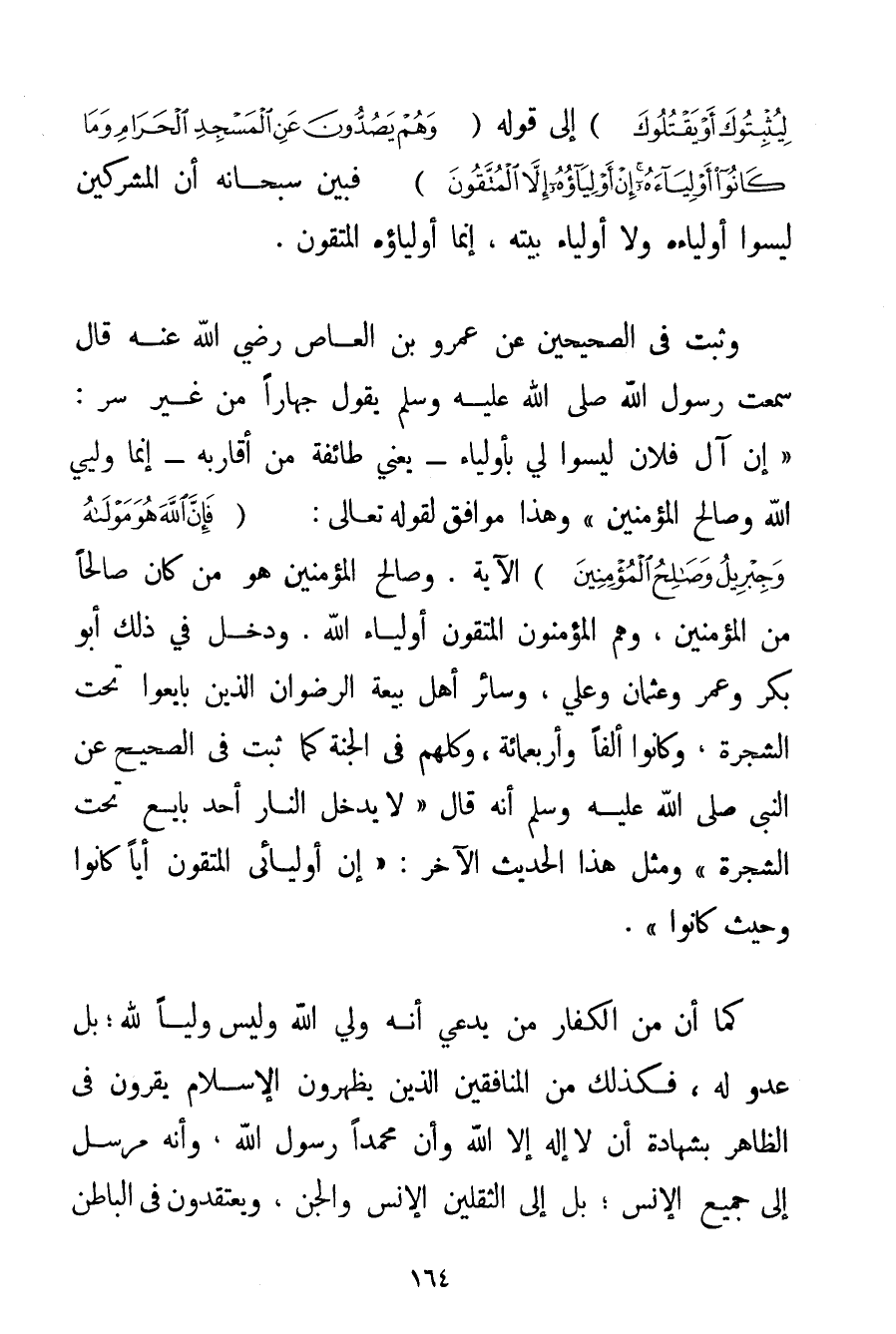 وَمَا كَانُوا أَوْلِيَاءَهُ إنْ أَوْلِيَاؤُهُ إلَّا الْمُتَّقُونَ} فَبَيَّنَ سُبْحَانَهُ أَنَّ الْمُشْرِكِينَ لَيْسُوا أَوْلِيَاءَهُ وَلَا أَوْلِيَاءَ بَيْتِهِ إنَّمَا أَوْلِيَاؤُهُ الْمُتَّقُونَ. وَثَبَتَ فِي الصَّحِيحَيْنِ عَنْ عَمْرِو بْنِ العاص رَضِيَ اللَّهُ عَنْهُ قَالَ سَمِعْت رَسُولَ اللَّهِ صَلَّى اللَّهُ عَلَيْهِ وَسَلَّمَ يَقُولُ جِهَارًا مِنْ غَيْرِ سِرٍّ: {إنَّ آلَ فُلَانٍ لَيْسُوا لِي بأولياء - يَعْنِي طَائِفَةً مِنْ أَقَارِبِهِ - إنَّمَا وَلِيِّي اللَّهُ وَصَالِحُ الْمُؤْمِنِينَ} وَهَذَا مُوَافِقٌ لِقَوْلِهِ تَعَالَى {فَإِنَّ اللَّهَ هُوَ مَوْلَاهُ وَجِبْرِيلُ وَصَالِحُ الْمُؤْمِنِينَ} الْآيَةَ. وَصَالِحُ الْمُؤْمِنِينَ هُوَ مَنْ كَانَ صَالِحًا مِنْ الْمُؤْمِنِينَ وَهُمْ الْمُؤْمِنُونَ الْمُتَّقُونَ أَوْلِيَاءُ اللَّهِ. وَدَخَلَ فِي ذَلِكَ أَبُو بَكْرٍ وَعُمَرُ وَعُثْمَانُ وَعَلِيٌّ وَسَائِرُ أَهْلِ بَيْعَةِ الرِّضْوَانِ الَّذِينَ بَايَعُوا تَحْتَ الشَّجَرَةِ وَكَانُوا أَلْفًا وَأَرْبَعَمِائَةٍ وَكُلُّهُمْ فِي الْجَنَّةِ كَمَا ثَبَتَ فِي الصَّحِيحِ عَنْ النَّبِيِّ صَلَّى اللَّهُ عَلَيْهِ وَسَلَّمَ أَنَّهُ قَالَ {لَا يَدْخُلُ النَّارَ أَحَدٌ بَايَعَ تَحْتَ الشَّجَرَةِ} وَمِثْلُ هَذَا الْحَدِيثِ الْآخَرِ: {إنَّ أَوْلِيَائِي الْمُتَّقُونَ أَيًّا كَانُوا وَحَيْثُ كَانُوا} . كَمَا أَنَّ مِنْ الْكُفَّارِ مَنْ يَدَّعِي أَنَّهُ وَلِيُّ اللَّهِ وَلَيْسَ وَلِيًّا لِلَّهِ؛ بَلْ عَدُوٌّ لَهُ فَكَذَلِكَ مَنَّ الْمُنَافِقِينَ الَّذِينَ يُظْهِرُونَ الْإِسْلَامَ يُقِرُّونَ فِي الظَّاهِرِ بِشَهَادَةِ أَنْ لَا إلَهَ إلَّا اللَّهُ وَأَنَّ مُحَمَّدًا رَسُولُ اللَّهِ وَأَنَّهُ مُرْسَلٌ إلَى جَمِيعِ الْإِنْسِ؛ بَلْ إلَى الثَّقَلَيْنِ الْإِنْسِ وَالْجِنِّ وَيَعْتَقِدُونَ فِي الْبَاطِنِ
