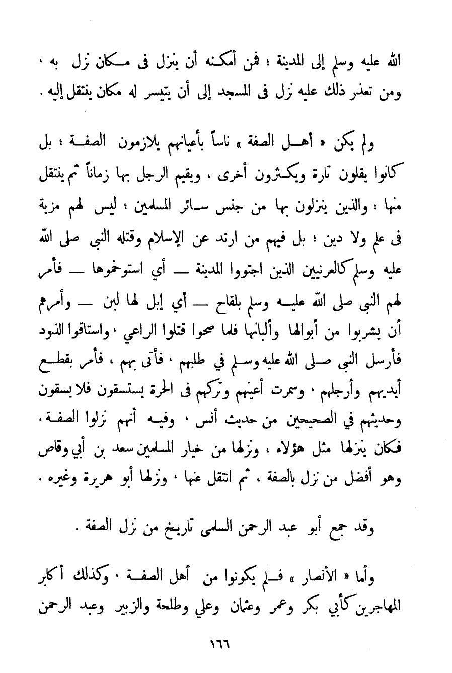 صَلَّى اللَّهُ عَلَيْهِ وَسَلَّمَ إلَى الْمَدِينَةِ؛ فَمَنْ أَمْكَنَهُ أَنْ يَنْزِلَ فِي مَكَانٍ نَزَلَ بِهِ وَمَنْ تَعَذَّرَ ذَلِكَ عَلَيْهِ نَزَلَ فِي الْمَسْجِدِ إلَى أَنْ يَتَيَسَّرَ لَهُ مَكَانٌ يَنْتَقِلُ إلَيْهِ. وَلَمْ يَكُنْ " أَهْلُ الصُّفَّةِ " نَاسًا بِأَعْيَانِهِمْ يُلَازِمُونَ الصُّفَّةَ بَلْ كَانُوا يَقِلُّونَ تَارَةً وَيَكْثُرُونَ أُخْرَى وَيُقِيمُ الرَّجُلُ بِهَا زَمَانًا ثُمَّ يَنْتَقِلُ مِنْهَا: وَاَلَّذِينَ يَنْزِلُونَ بِهَا مِنْ جِنْسِ سَائِرِ الْمُسْلِمِينَ؛ لَيْسَ لَهُمْ مَزِيَّةٌ فِي عِلْمٍ وَلَا دِينٍ؛ بَلْ فِيهِمْ مَنْ ارْتَدَّ عَنْ الْإِسْلَامِ وَقَتَلَهُ النَّبِيُّ صَلَّى اللَّهُ عَلَيْهِ وَسَلَّمَ كالعرنيين الَّذِينَ اجْتَوَوْا الْمَدِينَةَ - أَيْ اسْتَوْخَمُوهَا - فَأَمَرَ لَهُمْ النَّبِيُّ صَلَّى اللَّهُ عَلَيْهِ وَسَلَّمَ بِلَقَاحِ - أَيْ إبِلٍ لَهَا لَبَنٌ - وَأَمَرَهُمْ أَنْ يَشْرَبُوا مِنْ أَبْوَالِهَا وَأَلْبَانِهَا فَلَمَّا صَحُّوا قَتَلُوا الرَّاعِيَ وَاسْتَاقُوا الذَّوْدَ فَأَرْسَلَ النَّبِيُّ صَلَّى اللَّهُ عَلَيْهِ وَسَلَّمَ فِي طَلَبِهِمْ فَأُتِيَ بِهِمْ فَأَمَرَ بِقَطْعِ أَيْدِيهِمْ وَأَرْجُلِهِمْ وَسُمِّرَتْ أَعْيُنُهُمْ وَتَرَكَهُمْ فِي الْحَرَّةِ يَسْتَسْقُونَ فَلَا يُسْقَوْنَ وَحَدِيثُهُمْ فِي الصَّحِيحَيْنِ مِنْ حَدِيثِ أَنَسٍ وَفِيهِ أَنَّهُمْ نَزَلُوا الصُّفَّةَ فَكَانَ يَنْزِلُهَا مِثْلُ هَؤُلَاءِ وَنَزَلَهَا مِنْ خِيَارِ الْمُسْلِمِينَ سَعْدُ بْنُ أَبِي وَقَّاصٍ وَهُوَ أَفْضَلُ مَنْ نَزَلَ بِالصُّفَّةِ ثُمَّ انْتَقَلَ عَنْهَا وَنَزَلَهَا أَبُو هُرَيْرَةَ وَغَيْرُهُ. وَقَدْ جَمَعَ أَبُو عَبْدِ الرَّحْمَنِ السُّلَمِي تَارِيخَ مَنْ نَزَلَ الصُّفَّةَ. وَأَمَّا " الْأَنْصَارُ " فَلَمْ يَكُونُوا مِنْ أَهْلِ الصُّفَّةِ وَكَذَلِكَ أَكَابِرُ الْمُهَاجِرِينَ كَأَبِي بَكْرٍ وَعُمَرَ وَعُثْمَانَ وَعَلِيٍّ وَطَلْحَةَ وَالزُّبَيْرِ وَعَبْدِ الرَّحْمَنِ