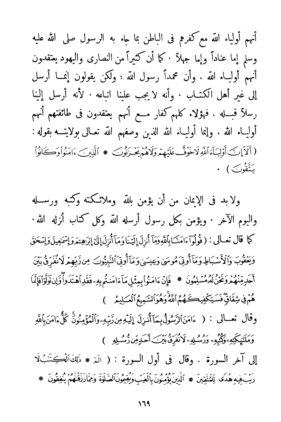 أَنَّهُمْ أَوْلِيَاءُ اللَّهِ مَعَ كُفْرِهِمْ فِي الْبَاطِنِ بِمَا جَاءَ بِهِ الرَّسُولُ صَلَّى اللَّهُ عَلَيْهِ وَسَلَّمَ إمَّا عِنَادًا وَإِمَّا جَهْلًا كَمَا أَنَّ كَثِيرًا مِنْ النَّصَارَى وَالْيَهُودِ يَعْتَقِدُونَ أَنَّهُمْ أَوْلِيَاءُ اللَّهِ وَأَنَّ مُحَمَّدًا رَسُولُ اللَّهِ؛ وَلَكِنْ يَقُولُونَ إنَّمَا أُرْسِلَ إلَى غَيْرِ أَهْلِ الْكِتَابِ وَأَنَّهُ لَا يَجِبُ عَلَيْنَا اتِّبَاعُهُ لِأَنَّهُ أَرْسَلَ إلَيْنَا رُسُلًا قَبْلَهُ فَهَؤُلَاءِ كُلُّهُمْ كُفَّارٌ مَعَ أَنَّهُمْ يَعْتَقِدُونَ فِي طَائِفَتِهِمْ أَنَّهُمْ أَوْلِيَاءُ اللَّهِ وَإِنَّمَا أَوْلِيَاءُ اللَّهِ الَّذِينَ وَصَفَهُمْ اللَّهُ تَعَالَى بِوِلَايَتِهِ بِقَوْلِهِ: {أَلَا إنَّ أَوْلِيَاءَ اللَّهِ لَا خَوْفٌ عَلَيْهِمْ وَلَا هُمْ يَحْزَنُونَ} {الَّذِينَ آمَنُوا وَكَانُوا يَتَّقُونَ} .