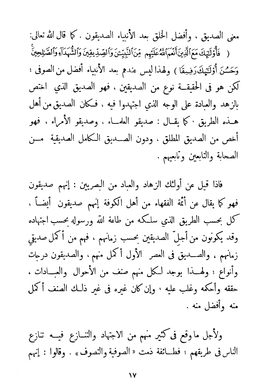 مَعْنَى الصِّدِّيقِ وَأَفْضَلُ الْخَلْقِ بَعْدَ الْأَنْبِيَاءِ الصِّدِّيقُونَ. كَمَا قَالَ اللَّهُ تَعَالَى: {فَأُولَئِكَ مَعَ الَّذِينَ أَنْعَمَ اللَّهُ عَلَيْهِمْ مِنَ النَّبِيِّينَ وَالصِّدِّيقِينَ وَالشُّهَدَاءِ وَالصَّالِحِينَ وَحَسُنَ أُولَئِكَ رَفِيقًا} وَلِهَذَا لَيْسَ عِنْدَهُمْ بَعْدَ الْأَنْبِيَاءِ أَفْضَلُ مِنْ الصُّوفِيِّ؛ لَكِنْ هُوَ فِي الْحَقِيقَةِ نَوْعٌ مِنْ الصِّدِّيقِينَ فَهُوَ الصِّدِّيقُ الَّذِي اخْتَصَّ بِالزُّهْدِ وَالْعِبَادَةِ عَلَى الْوَجْهِ الَّذِي اجْتَهَدُوا فِيهِ فَكَانَ الصِّدِّيقُ مِنْ أَهْلِ هَذِهِ الطَّرِيقِ كَمَا يُقَالُ: صِدِّيقُو الْعُلَمَاءِ وَصِدِّيقُو الْأُمَرَاءِ فَهُوَ أَخَصُّ مِنْ الصِّدِّيقِ الْمُطْلَقِ وَدُونَ الصِّدِّيقِ الْكَامِلِ الصديقية مِنْ الصَّحَابَةِ وَالتَّابِعِينَ وَتَابِعِيهِمْ. فَإِذَا قِيلَ عَنْ أُولَئِكَ الزُّهَّادِ وَالْعُبَّادِ مِنْ الْبَصْرِيِّينَ: إنَّهُمْ صِدِّيقُونَ فَهُوَ كَمَا يُقَالُ عَنْ أَئِمَّةِ الْفُقَهَاءِ مِنْ أَهْلِ الْكُوفَةِ إنَّهُمْ صِدِّيقُونَ أَيْضًا كُلٌّ بِحَسَبِ الطَّرِيقِ الَّذِي سَلَكَهُ مِنْ طَاعَةِ اللَّهِ وَرَسُولِهِ بِحَسَبِ اجْتِهَادِهِ وَقَدْ يَكُونُونَ مِنْ أَجْلِ الصِّدِّيقِينَ بِحَسَبِ زَمَانِهِمْ فَهُمْ مِنْ أَكْمَلِ صِدِّيقِي زَمَانِهِمْ وَالصِّدِّيقُ فِي الْعَصْرِ الْأَوَّلِ أَكْمَلُ مِنْهُمْ وَالصِّدِّيقُونَ دَرَجَاتٌ وَأَنْوَاعٌ؛ وَلِهَذَا يُوجَدُ لِكُلِّ مِنْهُمْ صِنْفٌ مِنْ الْأَحْوَالِ وَالْعِبَادَاتِ حَقَّقَهُ وَأَحْكَمَهُ وَغَلَبَ عَلَيْهِ وَإِنْ كَانَ غَيْرُهُ فِي غَيْرِ ذَلِكَ الصِّنْفِ أَكْمَلَ مِنْهُ وَأَفْضَلَ مِنْهُ. وَلِأَجْلِ مَا وَقَعَ فِي كَثِيرٍ مِنْهُمْ مِنْ الِاجْتِهَادِ وَالتَّنَازُعِ فِيهِ تَنَازَعَ النَّاسُ فِي طَرِيقِهِمْ؛ فَطَائِفَةٌ ذَمَّتْ " الصُّوفِيَّةَ وَالتَّصَوُّفَ ". وَقَالُوا: إنَّهُمْ
