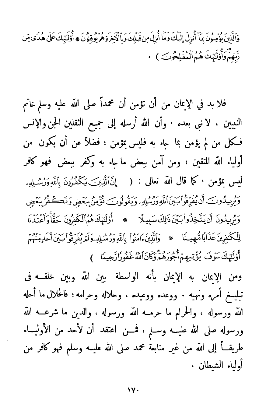 {الَّذِينَ يُؤْمِنُونَ بِالْغَيْبِ وَيُقِيمُونَ الصَّلَاةَ وَمِمَّا رَزَقْنَاهُمْ يُنْفِقُونَ} {وَالَّذِينَ يُؤْمِنُونَ بِمَا أُنْزِلَ إلَيْكَ وَمَا أُنْزِلَ مِنْ قَبْلِكَ وَبِالْآخِرَةِ هُمْ يُوقِنُونَ} {أُولَئِكَ عَلَى هُدًى مِنْ رَبِّهِمْ وَأُولَئِكَ هُمُ الْمُفْلِحُونَ} . فَلَا بُدَّ فِي الْإِيمَانِ مِنْ أَنْ تُؤْمِنَ أَنَّ مُحَمَّدًا صَلَّى اللَّهُ عَلَيْهِ وَسَلَّمَ خَاتَمُ النَّبِيِّينَ لَا نَبِيَّ بَعْدَهُ وَأَنَّ اللَّهَ أَرْسَلَهُ إلَى جَمِيعِ الثَّقَلَيْنِ الْجِنِّ وَالْإِنْسِ فَكُلُّ مَنْ لَمْ يُؤْمِنْ بِمَا جَاءَ بِهِ فَلَيْسَ بِمُؤْمِنِ؛ فَضْلًا عَنْ أَنْ يَكُونَ مِنْ أَوْلِيَاءِ اللَّهِ الْمُتَّقِينَ؛ وَمَنْ آمَنَ بِبَعْضِ مَا جَاءَ بِهِ وَكَفَرَ بِبَعْضِ فَهُوَ كَافِرٌ لَيْسَ بِمُؤْمِنِ كَمَا قَالَ اللَّهُ تَعَالَى: {إنَّ الَّذِينَ يَكْفُرُونَ بِاللَّهِ وَرُسُلِهِ وَيُرِيدُونَ أَنْ يُفَرِّقُوا بَيْنَ اللَّهِ وَرُسُلِهِ وَيَقُولُونَ نُؤْمِنُ بِبَعْضٍ وَنَكْفُرُ بِبَعْضٍ وَيُرِيدُونَ أَنْ يَتَّخِذُوا بَيْنَ ذَلِكَ سَبِيلًا} {أُولَئِكَ هُمُ الْكَافِرُونَ حَقًّا وَأَعْتَدْنَا لِلْكَافِرِينَ عَذَابًا مُهِينًا} {وَالَّذِينَ آمَنُوا بِاللَّهِ وَرُسُلِهِ وَلَمْ يُفَرِّقُوا بَيْنَ أَحَدٍ مِنْهُمْ أُولَئِكَ سَوْفَ يُؤْتِيهِمْ أُجُورَهُمْ وَكَانَ اللَّهُ غَفُورًا رَحِيمًا} وَمِنْ الْإِيمَانِ بِهِ الْإِيمَانُ بِأَنَّهُ الْوَاسِطَةُ بَيْنَ اللَّهِ وَبَيْنَ خَلْقِهِ فِي تَبْلِيغِ أَمْرِهِ وَنَهْيِهِ. وَوَعْدِهِ وَوَعِيدِهِ وَحَلَالِهِ وَحَرَامِهِ؛ فَالْحَلَالُ مَا أَحَلَّهُ اللَّهُ وَرَسُولُهُ وَالْحَرَامُ مَا حَرَّمَهُ اللَّهُ وَرَسُولُهُ وَالدِّينُ مَا شَرَعَهُ اللَّهُ وَرَسُولُهُ صَلَّى اللَّهُ عَلَيْهِ وَسَلَّمَ فَمَنْ اعْتَقَدَ أَنَّ لِأَحَدِ مِنْ الْأَوْلِيَاءِ طَرِيقًا إلَى اللَّهِ مِنْ غَيْرِ مُتَابَعَةِ مُحَمَّدٍ صَلَّى اللَّهُ عَلَيْهِ وَسَلَّمَ فَهُوَ كَافِرٌ مِنْ أَوْلِيَاءِ الشَّيْطَانِ.