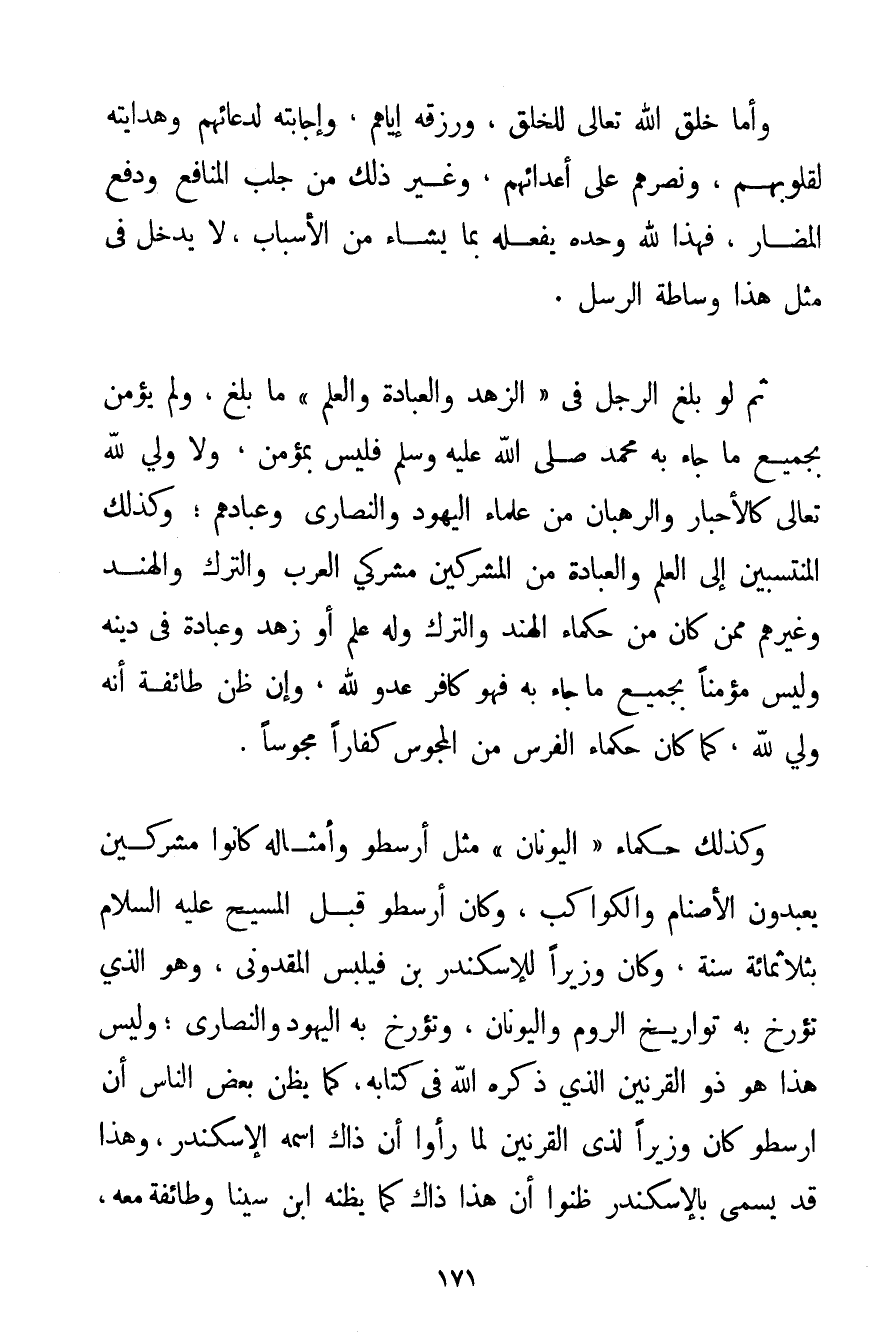 وَكَذَلِكَ حُكَمَاءُ " الْيُونَانِ " مِثْلُ أَرِسْطُو وَأَمْثَالِهِ كَانُوا مُشْرِكِينَ يَعْبُدُونَ الْأَصْنَامَ وَالْكَوَاكِبَ وَكَانَ أَرِسْطُو قَبْلَ الْمَسِيحِ عَلَيْهِ السَّلَامُ بِثَلَاثِمِائَةِ سَنَةٍ وَكَانَ وَزِيرًا لِلْإِسْكَنْدَرِ بْنِ فَيَلْبَس الْمَقْدُونِيِّ وَهُوَ الَّذِي تُؤَرِّخُ بِهِ تَوَارِيخُ الرُّومِ وَالْيُونَانِ وَتُؤَرِّخُ بِهِ الْيَهُودُ وَالنَّصَارَى؛ وَلَيْسَ هَذَا هُوَ ذُو الْقَرْنَيْنِ الَّذِي ذَكَرَهُ اللَّهُ فِي كِتَابِهِ كَمَا يَظُنُّ بَعْضُ النَّاسِ أَنَّ أَرِسْطُو كَانَ وَزِيرًا لِذِي الْقَرْنَيْنِ لَمَّا رَأَوْا أَنَّ ذَاكَ اسْمُهُ الْإِسْكَنْدَرُ وَهَذَا قَدْ يُسَمَّى بِالْإِسْكَنْدَرِ ظَنُّوا أَنَّ هَذَا ذَاكَ كَمَا يَظُنُّهُ ابْنُ سِينَا وَطَائِفَةٌ مَعَهُ