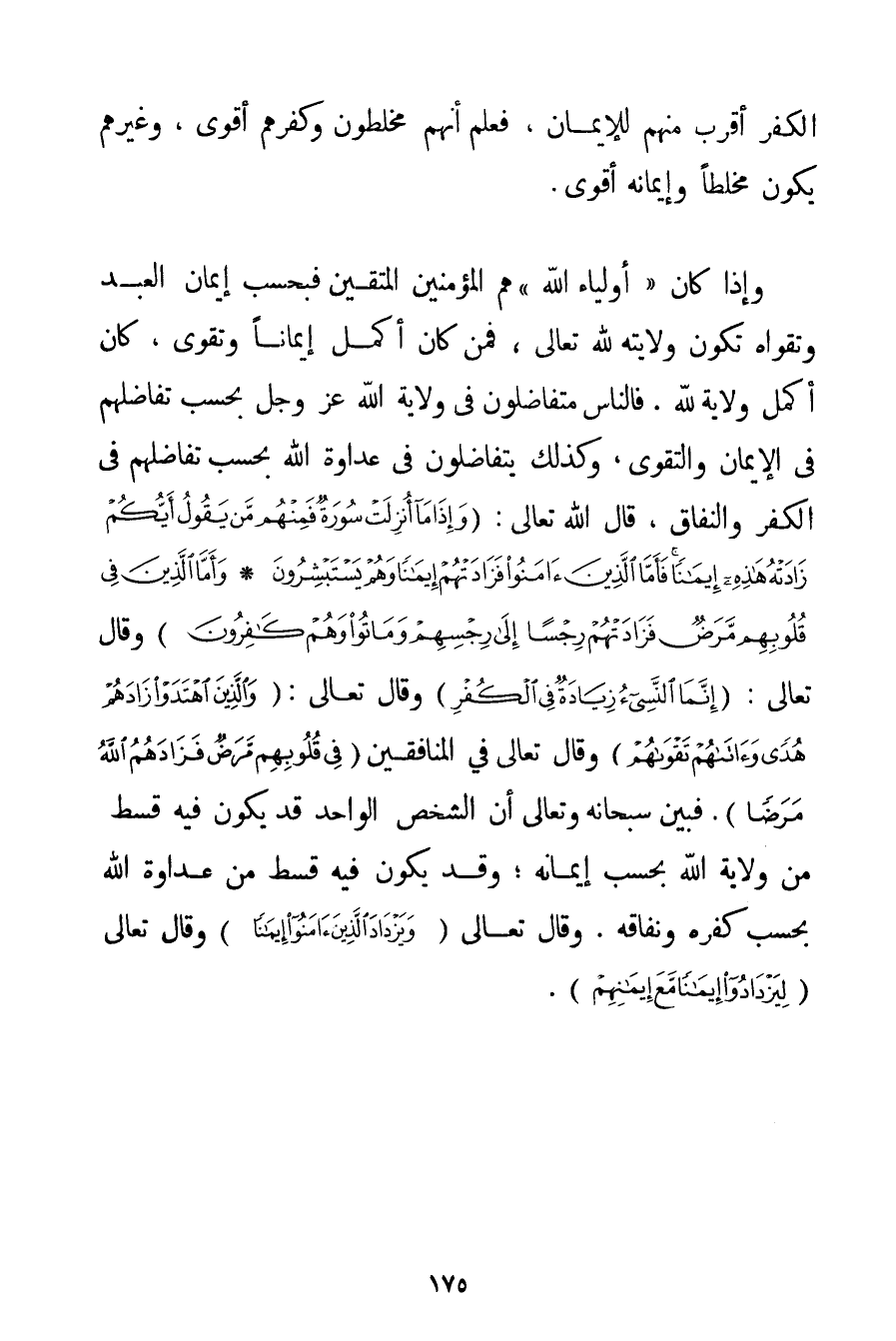 مِنْهُمْ لِلْإِيمَانِ} فَقَدْ جَعَلَ هَؤُلَاءِ إلَى الْكُفْرِ أَقْرَبَ مِنْهُمْ لِلْإِيمَانِ فَعُلِمَ أَنَّهُمْ مخلطون وَكُفْرُهُمْ أَقْوَى وَغَيْرُهُمْ يَكُونُ مُخَلِّطًا وَإِيمَانُهُ أَقْوَى. وَإِذَا كَانَ " أَوْلِيَاءُ اللَّهِ " هُمْ الْمُؤْمِنِينَ الْمُتَّقِينَ فَبِحَسَبِ إيمَانِ الْعَبْدِ وَتَقْوَاهُ تَكُونُ وِلَايَتُهُ لِلَّهِ تَعَالَى فَمَنْ كَانَ أَكْمَلَ إيمَانًا وَتَقْوَى كَانَ أَكْمَلَ وِلَايَةً لِلَّهِ. فَالنَّاسُ مُتَفَاضِلُونَ فِي وِلَايَةِ اللَّهِ عَزَّ وَجَلَّ بِحَسَبِ تَفَاضُلِهِمْ فِي الْإِيمَانِ وَالتَّقْوَى وَكَذَلِكَ يَتَفَاضَلُونَ فِي عَدَاوَةِ اللَّهِ بِحَسَبِ تَفَاضُلِهِمْ فِي الْكُفْرِ وَالنِّفَاقِ قَالَ اللَّهُ تَعَالَى: {وَإِذَا مَا أُنْزِلَتْ سُورَةٌ فَمِنْهُمْ مَنْ يَقُولُ أَيُّكُمْ زَادَتْهُ هَذِهِ إيمَانًا فَأَمَّا الَّذِينَ آمَنُوا فَزَادَتْهُمْ إيمَانًا وَهُمْ يَسْتَبْشِرُونَ} {وَأَمَّا الَّذِينَ فِي قُلُوبِهِمْ مَرَضٌ فَزَادَتْهُمْ رِجْسًا إلَى رِجْسِهِمْ وَمَاتُوا وَهُمْ كَافِرُونَ} وَقَالَ تَعَالَى: {إنَّمَا النَّسِيءُ زِيَادَةٌ فِي الْكُفْرِ} وَقَالَ تَعَالَى: {وَالَّذِينَ اهْتَدَوْا زَادَهُمْ هُدًى وَآتَاهُمْ تَقْوَاهُمْ} وَقَالَ تَعَالَى فِي الْمُنَافِقِينَ {فِي قُلُوبِهِمْ مَرَضٌ فَزَادَهُمُ اللَّهُ مَرَضًا} . فَبَيَّنَ سُبْحَانَهُ وَتَعَالَى أَنَّ الشَّخْصَ الْوَاحِدَ قَدْ يَكُونُ فِيهِ قِسْطٌ مِنْ وِلَايَةِ اللَّهِ بِحَسَبِ إيمَانِهِ؛ وَقَدْ يَكُونُ فِيهِ قِسْطٌ مِنْ عَدَاوَةِ اللَّهِ بِحَسَبِ كُفْرِهِ وَنِفَاقِهِ. وَقَالَ تَعَالَى {وَيَزْدَادَ الَّذِينَ آمَنُوا إيمَانًا} وَقَالَ تَعَالَى {لِيَزْدَادُوا إيمَانًا مَعَ إيمَانِهِمْ} .
