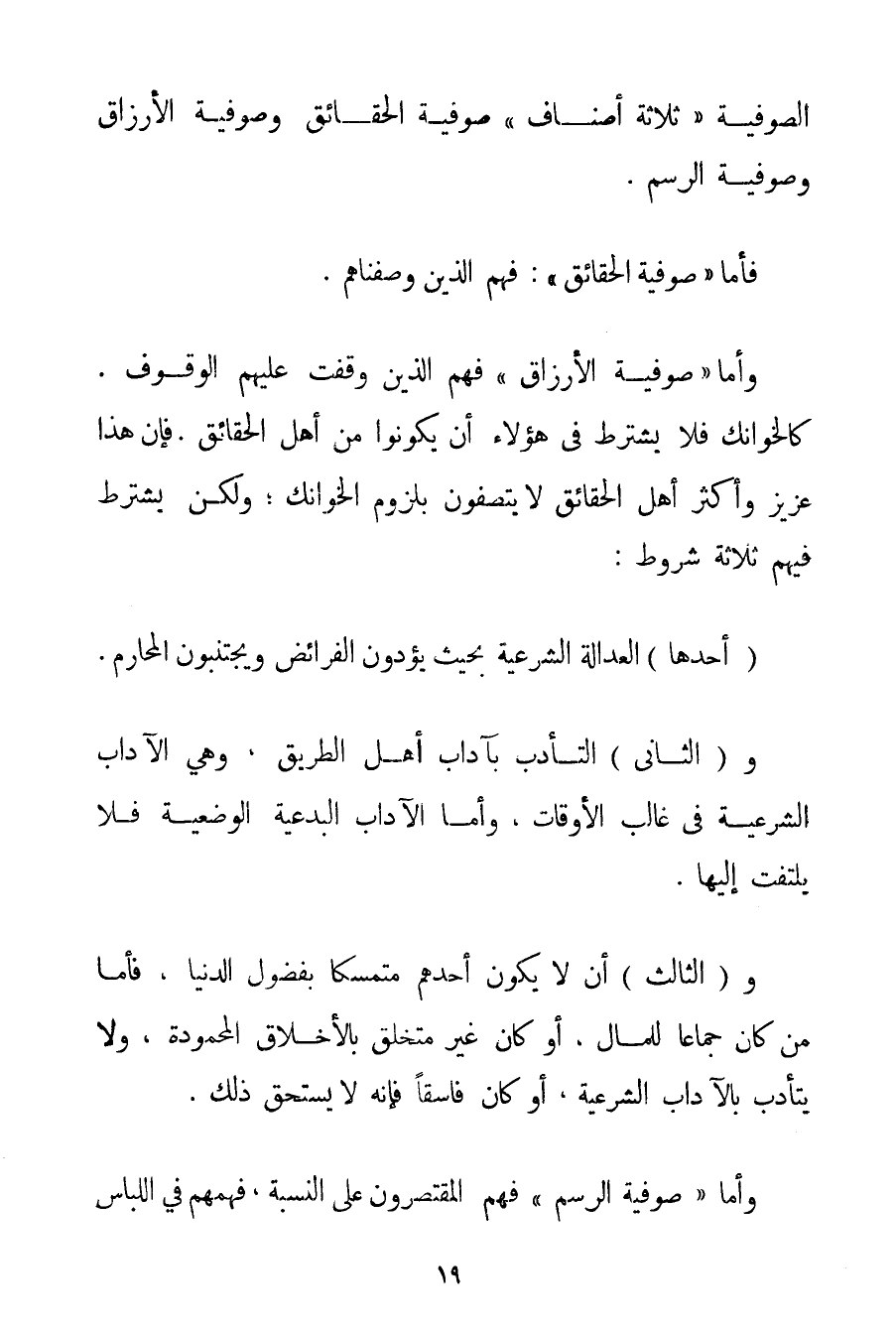 الصُّوفِيَّةُ " ثَلَاثَةَ أَصْنَافٍ " صُوفِيَّةُ الْحَقَائِقِ وَصُوفِيَّةُ الْأَرْزَاقِ وَصُوفِيَّةُ الرَّسْمِ. فَأَمَّا " صُوفِيَّةُ الْحَقَائِقِ ": فَهُمْ الَّذِينَ وَصَفْنَاهُمْ. وَأَمَّا " صُوفِيَّةُ الْأَرْزَاقِ " فَهُمْ الَّذِينَ وُقِفَتْ عَلَيْهِمْ الْوُقُوفُ. كالخوانك فَلَا يُشْتَرَطُ فِي هَؤُلَاءِ أَنْ يَكُونُوا مِنْ أَهْلِ الْحَقَائِقِ. فَإِنَّ هَذَا عَزِيزٌ وَأَكْثَرُ أَهْلِ الْحَقَائِقِ لَا يَتَّصِفُونَ بِلُزُومِ الخوانك؛ وَلَكِنْ يُشْتَرَطُ فِيهِمْ ثَلَاثَةُ شُرُوط: أَحَدُهَا الْعَدَالَةُ الشَّرْعِيَّةُ بِحَيْثُ يُؤَدُّونَ الْفَرَائِضَ وَيَجْتَنِبُونَ الْمَحَارِمَ. وَالثَّانِي التَّأَدُّبُ بِآدَابِ أَهْلِ الطَّرِيقِ وَهِيَ الْآدَابُ الشَّرْعِيَّةُ فِي غَالِبِ الْأَوْقَاتِ وَأَمَّا الْآدَابُ الْبِدْعِيَّةُ الْوَضْعِيَّةُ فَلَا يُلْتَفَتُ إلَيْهَا.