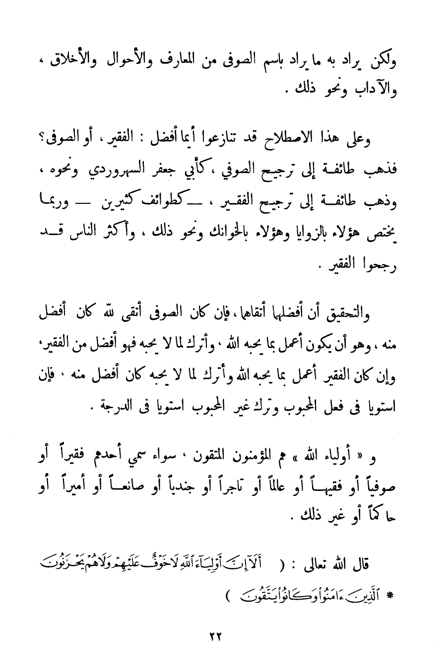 وَلَكِنْ يُرَادُ بِهِ مَا يُرَادُ بِاسْمِ الصُّوفِيِّ مِنْ الْمَعَارِفِ وَالْأَحْوَالِ وَالْأَخْلَاقِ وَالْآدَابِ وَنَحْوِ ذَلِكَ. وَعَلَى هَذَا الِاصْطِلَاحِ قَدْ تَنَازَعُوا أَيُّمَا أَفْضَلُ: الْفَقِيرُ أَوْ الصُّوفِيُّ؟ فَذَهَبَ طَائِفَةٌ إلَى تَرْجِيحِ الصُّوفِيِّ كَأَبِي جَعْفَرٍ السهروردي وَنَحْوِهِ وَذَهَبَ طَائِفَةٌ إلَى تَرْجِيحِ الْفَقِيرِ - كَطَوَائِفَ كَثِيرِينَ - وَرُبَّمَا يَخْتَصُّ هَؤُلَاءِ بِالزَّوَايَا وَهَؤُلَاءِ بالخوانك وَنَحْوِ ذَلِكَ وَأَكْثَرُ النَّاسِ قَدْ رَجَّحُوا الْفَقِيرَ. وَالتَّحْقِيقُ أَنَّ أَفْضَلَهُمَا أَتْقَاهُمَا فَإِنْ كَانَ الصُّوفِيُّ أَتْقَى لِلَّهِ كَانَ أَفْضَلَ مِنْهُ وَهُوَ أَنْ يَكُونَ أَعْمَلَ بِمَا يُحِبُّهُ اللَّهُ وَأَتْرَكَ لِمَا لَا يُحِبُّهُ فَهُوَ أَفْضَلُ مِنْ الْفَقِيرِ وَإِنْ كَانَ الْفَقِيرُ أَعْمَلُ بِمَا يُحِبُّهُ اللَّهُ وَأَتْرَكَ لِمَا لَا يُحِبُّهُ كَانَ أَفْضَلَ مِنْهُ فَإِنْ اسْتَوَيَا فِي فِعْلِ الْمَحْبُوبِ وَتَرْكِ غَيْرِ الْمَحْبُوبِ اسْتَوَيَا فِي الدَّرَجَةِ. وَ " أَوْلِيَاءُ اللَّهِ " هُمْ الْمُؤْمِنُونَ الْمُتَّقُونَ سَوَاءٌ سُمِّيَ أَحَدُهُمْ فَقِيرًا أَوْ صُوفِيًّا أَوْ فَقِيهًا أَوْ عَالِمًا أَوْ تَاجِرًا أَوْ جُنْدِيًّا أَوْ صَانِعًا أَوْ أَمِيرًا أَوْ حَاكِمًا أَوْ غَيْرَ ذَلِكَ. قَالَ اللَّهُ تَعَالَى: {أَلَا إنَّ أَوْلِيَاءَ اللَّهِ لَا خَوْفٌ عَلَيْهِمْ وَلَا هُمْ يَحْزَنُونَ الَّذِينَ آمَنُوا وَكَانُوا يَتَّقُونَ}
