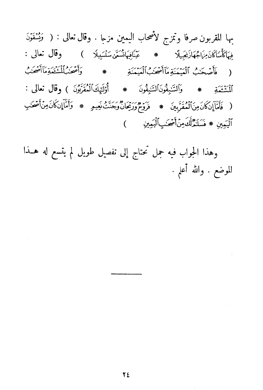 بِهَا الْمُقَرَّبُونَ صِرْفًا وَتُمْزَجُ لِأَصْحَابِ الْيَمِينِ مَزْجًا. وَقَالَ تَعَالَى: {وَيُسْقَوْنَ فِيهَا كَأْسًا كَانَ مِزَاجُهَا زَنْجَبِيلًا} . {عَيْنًا فِيهَا تُسَمَّى سَلْسَبِيلًا} وَقَالَ تَعَالَى: {فَأَصْحَابُ الْمَيْمَنَةِ مَا أَصْحَابُ الْمَيْمَنَةِ} {وَأَصْحَابُ الْمَشْأَمَةِ مَا أَصْحَابُ الْمَشْأَمَةِ} {وَالسَّابِقُونَ السَّابِقُونَ} {أُولَئِكَ الْمُقَرَّبُونَ} وَقَالَ تَعَالَى: {فَأَمَّا إنْ كَانَ مِنَ الْمُقَرَّبِينَ} {فَرَوْحٌ وَرَيْحَانٌ وَجَنَّةُ نَعِيمٍ} {وَأَمَّا إنْ كَانَ مِنْ أَصْحَابِ الْيَمِينِ} {فَسَلَامٌ لَكَ مِنْ أَصْحَابِ الْيَمِينِ} وَهَذَا الْجَوَابُ فِيهِ جُمَلٌ تَحْتَاجُ إلَى تَفْصِيلٍ طَوِيلٍ لَمْ يَتَّسِعْ لَهُ هَذَا الْمَوْضِعُ. وَاَللَّهُ أَعْلَمُ.
