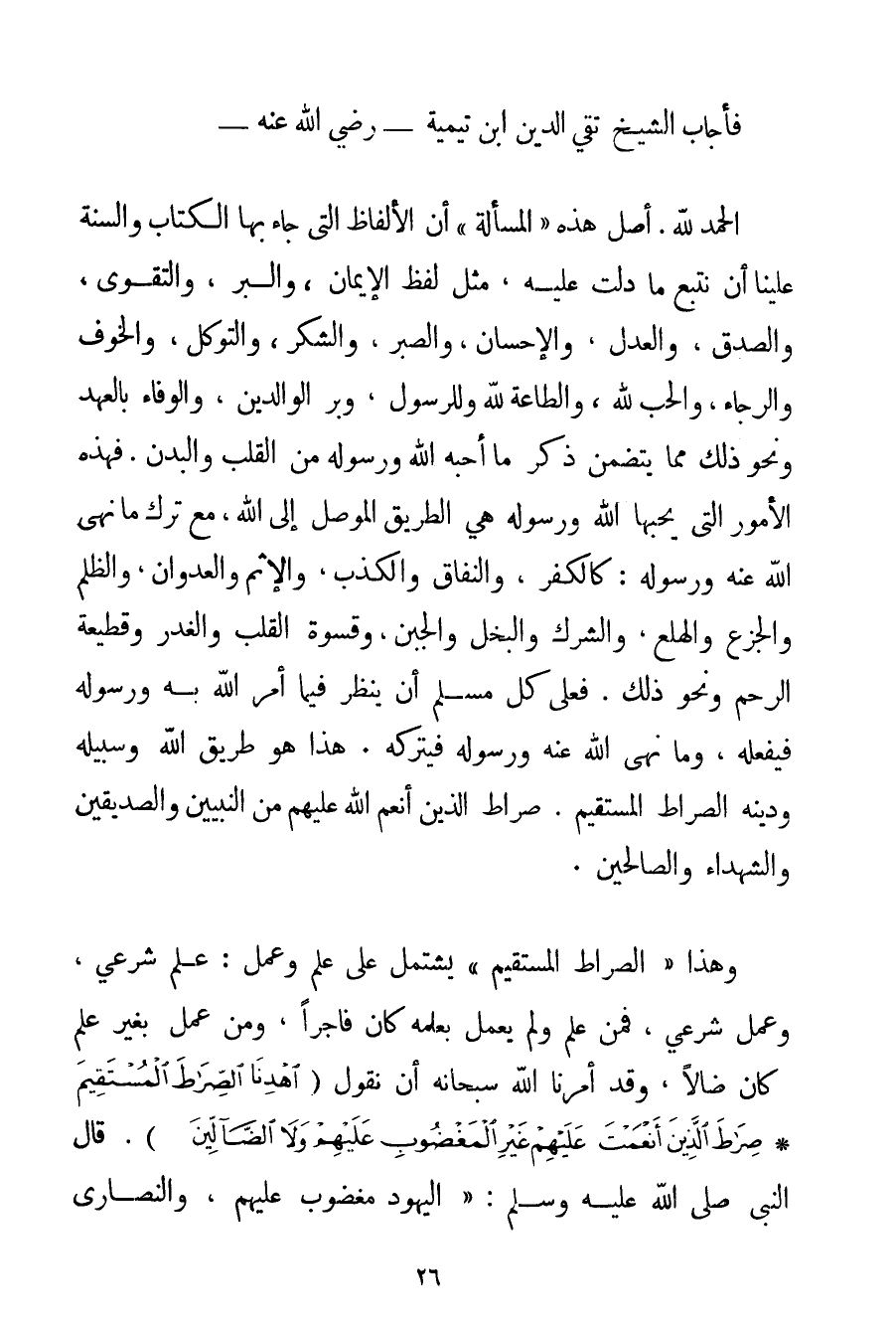 الْحَمْدُ لِلَّهِ، أَصْلُ هَذِهِ " الْمَسْأَلَةِ " أَنَّ الْأَلْفَاظَ الَّتِي جَاءَ بِهَا الْكِتَابُ وَالسُّنَّةُ عَلَيْنَا أَنْ نَتَّبِعَ مَا دَلَّتْ عَلَيْهِ مِثْلُ لَفْظِ الْإِيمَانِ وَالْبِرِّ وَالتَّقْوَى وَالصِّدْقِ وَالْعَدْلِ وَالْإِحْسَانِ وَالصَّبْرِ وَالشُّكْرِ وَالتَّوَكُّلِ وَالْخَوْفِ وَالرَّجَاءِ وَالْحُبِّ لِلَّهِ وَالطَّاعَةِ لِلَّهِ وَلِلرَّسُولِ وَبِرِّ الْوَالِدَيْنِ وَالْوَفَاءِ بِالْعَهْدِ وَنَحْوِ ذَلِكَ مِمَّا يَتَضَمَّنُ ذِكْرَ مَا أَحَبَّهُ اللَّهُ وَرَسُولُهُ مِنْ الْقَلْبِ وَالْبَدَنِ. فَهَذِهِ الْأُمُورُ الَّتِي يُحِبُّهَا اللَّهُ وَرَسُولُهُ هِيَ الطَّرِيقُ الْمُوصِلُ إلَى اللَّهِ مَعَ تَرْكِ مَا نَهَى اللَّهُ عَنْهُ وَرَسُولُهُ: كَالْكُفْرِ وَالنِّفَاقِ وَالْكَذِبِ وَالْإِثْمِ وَالْعُدْوَانِ وَالظُّلْمِ. وَالْجَزَعُ وَالْهَلَعُ وَالشِّرْكُ وَالْبُخْلُ وَالْجُبْنُ وَقَسْوَةُ الْقَلْبِ وَالْغَدْرُ وَقَطِيعَةُ الرَّحِمِ وَنَحْوُ ذَلِكَ. فَعَلَى كُلِّ مُسْلِمٍ أَنْ يَنْظُرَ فِيمَا أَمَرَ اللَّهُ بِهِ وَرَسُولُهُ فَيَفْعَلُهُ وَمَا نَهَى اللَّهُ عَنْهُ وَرَسُولُهُ فَيَتْرُكُهُ. هَذَا هُوَ طَرِيقُ اللَّهِ وَسَبِيلُهُ وَدِينُهُ الصِّرَاطُ الْمُسْتَقِيمُ. صِرَاطُ الَّذِينَ أَنْعَمَ اللَّهُ عَلَيْهِمْ مِنْ النَّبِيِّينَ وَالصِّدِّيقِينَ وَالشُّهَدَاءِ وَالصَّالِحِينَ. وَهَذَا " الصِّرَاطُ الْمُسْتَقِيمُ " يَشْتَمِلُ عَلَى عِلْمٍ وَعَمَلٍ: عِلْمٌ شَرْعِيٌّ وَعَمَلٌ شَرْعِيٌّ فَمَنْ عَلِمَ وَلَمْ يَعْمَلْ بِعِلْمِهِ كَانَ فَاجِرًا وَمَنْ عَمِلَ بِغَيْرِ عِلْمٍ كَانَ ضَالًّا وَقَدْ أَمَرَنَا اللَّهُ سُبْحَانَهُ أَنْ نَقُولَ {اهْدِنَا الصِّرَاطَ الْمُسْتَقِيمَ} {صِرَاطَ الَّذِينَ أَنْعَمْتَ عَلَيْهِمْ غَيْرِ الْمَغْضُوبِ عَلَيْهِمْ وَلَا الضَّالِّينَ} . قَالَ النَّبِيُّ صَلَّى اللَّهُ عَلَيْهِ وَسَلَّمَ {الْيَهُودُ مَغْضُوبٌ عَلَيْهِمْ وَالنَّصَارَى