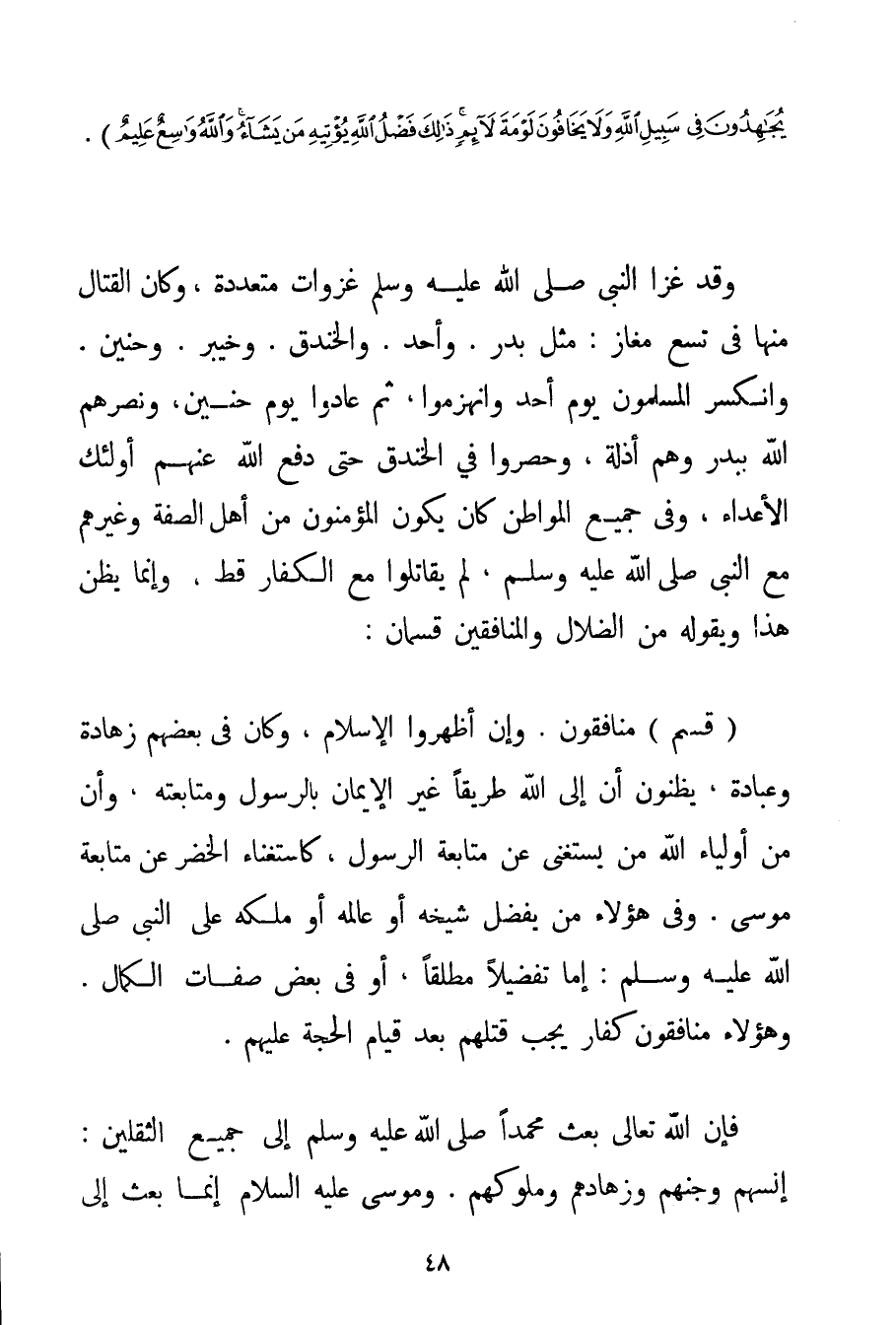 عَلَى الْمُؤْمِنِينَ أَعِزَّةً عَلَى الْكَافِرِينَ يُجَاهِدُونَ فِي سَبِيلِ اللَّهِ وَلَا يَخَافُونَ لَوْمَةَ لَائِمٍ ذَلِكَ فَضْلُ اللَّهِ يُؤْتِيهِ مَنْ يَشَاءُ وَاللَّهُ وَاسِعٌ عَلِيمٌ} . وَقَدْ غَزَا النَّبِيُّ صَلَّى اللَّهُ عَلَيْهِ وَسَلَّمَ غَزَوَاتٍ مُتَعَدِّدَةً وَكَانَ الْقِتَالُ مِنْهَا فِي تِسْعِ مَغَازٍ: مِثْلُ بَدْرٍ. وَأُحُدٍ. وَالْخَنْدَقِ. وَخَيْبَرَ. وَحُنَيْن. وَانْكَسَرَ الْمُسْلِمُونَ يَوْمَ أُحُدٍ وَانْهَزَمُوا ثُمَّ عَادُوا يَوْمَ حنين وَنَصَرَهُمْ اللَّهُ بِبَدْرِ وَهْم أَذِلَّةٌ وَحُصِرُوا فِي الْخَنْدَقِ حَتَّى دَفَعَ اللَّهُ عَنْهُمْ أُولَئِكَ الْأَعْدَاءَ وَفِي جَمِيعِ الْمُوَاطِنِ كَأَنْ يَكُونَ الْمُؤْمِنُونَ مِنْ أَهْلِ الصُّفَّةِ وَغَيْرِهِمْ مَعَ النَّبِيِّ صَلَّى اللَّهُ عَلَيْهِ وَسَلَّمَ لَمْ يُقَاتِلُوا مَعَ الْكُفَّارِ قَطُّ وَإِنَّمَا يَظُنُّ هَذَا وَيَقُولُهُ مِنْ الضُّلَّالِ وَالْمُنَافِقِينَ قِسْمَانِ: (قِسْمٌ مُنَافِقُونَ. وَإِنْ أَظْهَرُوا الْإِسْلَامَ وَكَانَ فِي بَعْضِهِمْ زَهَادَةٌ وَعِبَادَةٌ يَظُنُّونَ أَنَّ إلَى اللَّهِ طَرِيقًا غَيْرَ الْإِيمَانِ بِالرَّسُولِ وَمُتَابَعَتَهُ وَأَنَّ مِنْ أَوْلِيَاءِ اللَّهِ مَنْ يَسْتَغْنِي عَنْ مُتَابَعَةِ الرَّسُولِ كَاسْتِغْنَاءِ الْخَضِرِ عَنْ مُتَابَعَةِ مُوسَى. وَفِي هَؤُلَاءِ مَنْ يُفَضِّلُ شَيْخَهُ أَوْ عَالِمَهُ أَوْ مَلِكَهُ عَلَى النَّبِيِّ صَلَّى اللَّهُ عَلَيْهِ وَسَلَّمَ إمَّا تَفْضِيلًا مُطْلَقًا أَوْ فِي بَعْضِ صِفَاتِ الْكَمَالِ. وَهَؤُلَاءِ مُنَافِقُونَ كُفَّارٌ يَجِبُ قَتْلُهُمْ بَعْدَ قِيَامِ الْحُجَّةِ عَلَيْهِمْ. فَإِنَّ اللَّهَ تَعَالَى بَعَثَ مُحَمَّدًا صَلَّى اللَّهُ عَلَيْهِ وَسَلَّمَ إلَى جَمِيعِ الثَّقَلَيْنِ: إنْسِهِمْ وَجِنِّهِمْ وَزُهَّادِهِمْ وَمُلُوكِهِمْ. وَمُوسَى عَلَيْهِ السَّلَامُ إنَّمَا بُعِثَ إلَى