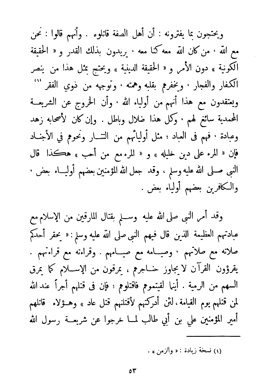 وَيَحْتَجُّونَ بِمَا يَفْتَرُونَهُ: أَنَّ أَهْلَ الصُّفَّةِ قَاتَلُوهُ. وَأَنَّهُمْ قَالُوا: نَحْنُ مَعَ اللَّهِ مَنْ كَانَ اللَّهُ مَعَهُ كُنَّا مَعَهُ يُرِيدُونَ بِذَلِكَ الْقَدَرَ وَ " الْحَقِيقَةَ الْكَوْنِيَّةَ " دُونَ الْأَمْرِ وَ " الْحَقِيقَةَ الدِّينِيَّةَ " وَيَحْتَجُّ بِمِثْلِ هَذَا مَنْ يَنْصُرُ الْكُفَّارَ وَالْفُجَّارَ وَيَخْفِرُهُمْ بِقَلْبِهِ وَهِمَّتِهِ وَتَوَجُّهِهِ مِنْ ذَوِي الْفَقْرِ وَيَعْتَقِدُونَ مَعَ هَذَا أَنَّهُمْ مِنْ أَوْلِيَاءِ اللَّهِ وَأَنَّ الْخُرُوجَ عَنْ الشَّرِيعَةِ الْمُحَمَّدِيَّةِ سَائِغٌ لَهُمْ وَكُلُّ هَذَا ضَلَالٌ وَبَاطِلٌ. وَإِنْ كَانَ لِأَصْحَابِهِ زُهْدٌ وَعِبَادَةٌ فَهُمْ فِي الْعُبَّادِ؛ مِثْلُ أَوْلِيَائِهِمْ مِنْ التَّتَارِ وَنَحْوِهِمْ فِي الْأَجْنَادِ فَإِنَّ {الْمَرْءَ عَلَى دِينِ خَلِيلِهِ} وَ {الْمَرْءَ مَعَ مَنْ أَحَبَّ} هَكَذَا قَالَ النَّبِيُّ صَلَّى اللَّهُ عَلَيْهِ وَسَلَّمَ وَقَدْ جَعَلَ اللَّهُ الْمُؤْمِنِينَ بَعْضَهُمْ أَوْلِيَاءَ بَعْضٍ وَالْكَافِرِينَ بَعْضَهُمْ أَوْلِيَاءَ بَعْضٍ. وَقَدْ أَمَرَ النَّبِيُّ صَلَّى اللَّهُ عَلَيْهِ وَسَلَّمَ بِقِتَالِ الْمَارِقِينَ مِنْ الْإِسْلَامِ مَعَ عِبَادَتِهِمْ الْعَظِيمَةِ الَّذِينَ قَالَ فِيهِمْ النَّبِيُّ صَلَّى اللَّهُ عَلَيْهِ وَسَلَّمَ {يَحْقِرُ أَحَدُكُمْ صَلَاتَهُ مَعَ صَلَاتِهِمْ وَصِيَامَهُ مَعَ صِيَامِهِمْ. وَقِرَاءَتَهُ مَعَ قِرَاءَتِهِمْ. يَقْرَءُونَ الْقُرْآنَ لَا يُجَاوِزُ حَنَاجِرَهُمْ يَمْرُقُونَ مِنْ الْإِسْلَامِ كَمَا يَمْرُقُ السَّهْمُ مِنْ الرَّمِيَّةِ. أَيْنَمَا لَقِيتُمُوهُمْ فَاقْتُلُوهُمْ؛ فَإِنَّ فِي قَتْلِهِمْ أَجْرًا عِنْدَ اللَّهِ لِمَنْ قَتَلَهُمْ يَوْمَ الْقِيَامَةِ لَئِنْ أَدْرَكْتهمْ لَأَقْتُلَنهُمْ قَتْلَ عَادٍ} وَهَؤُلَاءِ قَاتَلَهُمْ أَمِيرُ الْمُؤْمِنِينَ عَلِيُّ بْنُ أَبِي طَالِبٍ لَمَّا خَرَجُوا عَنْ شَرِيعَةِ رَسُولِ اللَّهِ