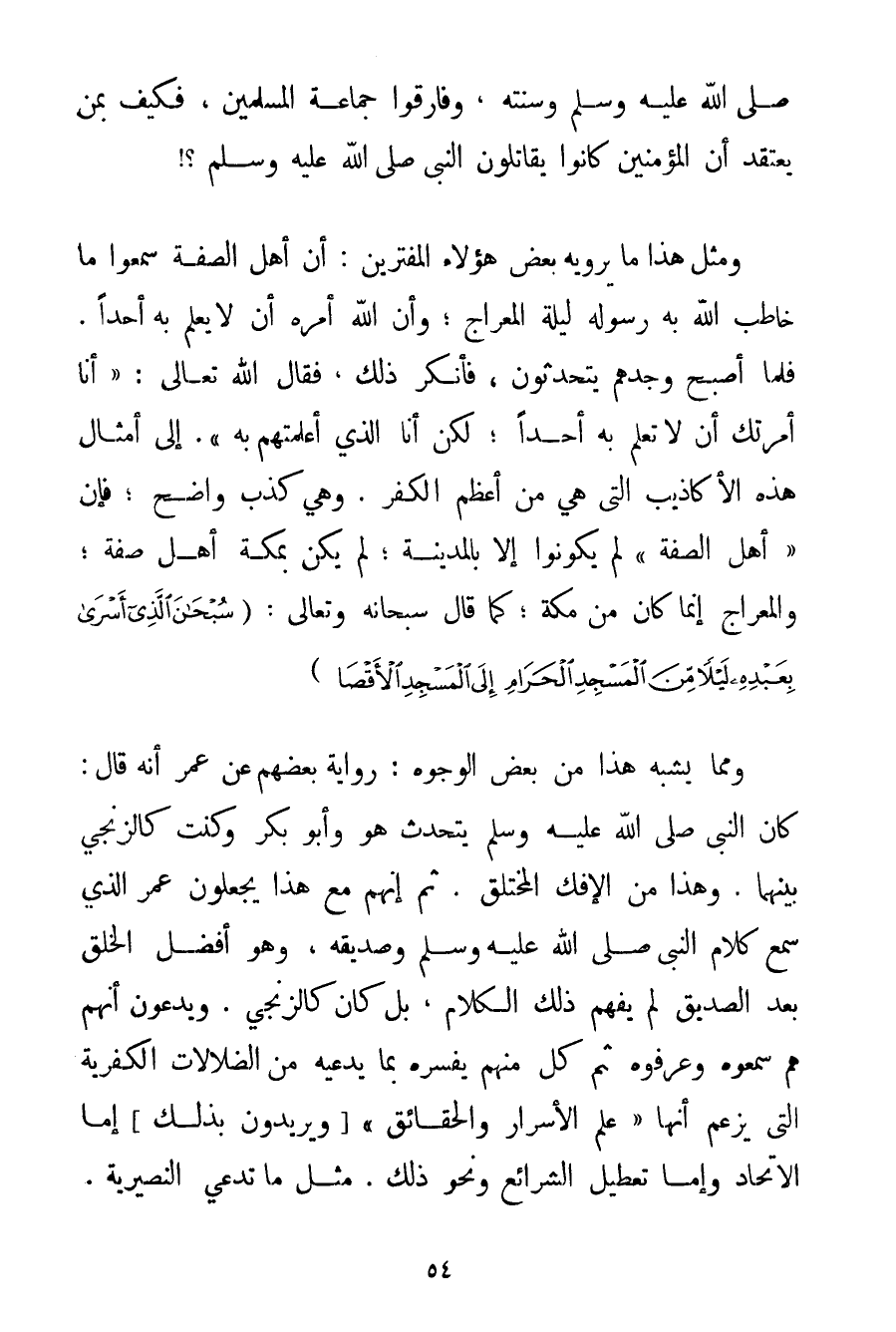 صَلَّى اللَّهُ عَلَيْهِ وَسَلَّمَ وَسُنَّتِهِ وَفَارَقُوا جَمَاعَةَ الْمُسْلِمِينَ فَكَيْفَ بِمَنْ يَعْتَقِدُ أَنَّ الْمُؤْمِنِينَ كَانُوا يُقَاتِلُونَ النَّبِيَّ صَلَّى اللَّهُ عَلَيْهِ وَسَلَّمَ وَمِثْلُ هَذَا مَا يَرْوِيه بَعْضُ هَؤُلَاءِ الْمُفْتَرِينَ: أَنَّ أَهْلَ الصُّفَّةِ سَمِعُوا مَا خَاطَبَ اللَّهُ بِهِ رَسُولَهُ لَيْلَةَ الْمِعْرَاجِ؛ وَأَنَّ اللَّهَ أَمَرَهُ أَنْ لَا يُعْلِمَ بِهِ أَحَدًا. فَلَمَّا أَصْبَحَ وَجَدَهُمْ يَتَحَدَّثُونَ فَأَنْكَرَ ذَلِكَ فَقَالَ اللَّهُ تَعَالَى: أَنَا أَمَرْتُك أَنْ لَا تُعْلِمَ بِهِ أَحَدًا؛ لَكِنْ أَنَا الَّذِي أَعْلَمْتهمْ بِهِ. إلَى أَمْثَالِ هَذِهِ الْأَكَاذِيبِ الَّتِي هِيَ مِنْ أَعْظَمِ الْكُفْرِ. وَهِيَ كَذِبٌ وَاضِحٌ؛ فَإِنَّ " أَهْلَ الصُّفَّةِ " لَمْ يَكُونُوا إلَّا بِالْمَدِينَةِ؛ لَمْ يَكُنْ بِمَكَّةَ أَهْلُ صُفَّةٍ؛ وَالْمِعْرَاجُ إنَّمَا كَانَ مِنْ مَكَّةَ؛ كَمَا قَالَ سُبْحَانَهُ وَتَعَالَى: {سُبْحَانَ الَّذِي أَسْرَى بِعَبْدِهِ لَيْلًا مِنَ الْمَسْجِدِ الْحَرَامِ إلَى الْمَسْجِدِ الْأَقْصَى} وَمِمَّا يُشْبِهُ هَذَا مِنْ بَعْضِ الْوُجُوهِ: رِوَايَةُ بَعْضِهِمْ عَنْ عُمَرَ أَنَّهُ قَالَ: كَانَ النَّبِيُّ صَلَّى اللَّهُ عَلَيْهِ وَسَلَّمَ يَتَحَدَّثُ هُوَ وَأَبُو بَكْرٍ وَكُنْت كَالزِّنْجِيِّ بَيْنَهُمَا. وَهَذَا مِنْ الْإِفْكِ الْمُخْتَلَقِ. ثُمَّ إنَّهُمْ مَعَ هَذَا يَجْعَلُونَ عُمَرَ الَّذِي سَمِعَ كَلَامَ النَّبِيِّ صَلَّى اللَّهُ عَلَيْهِ وَسَلَّمَ وَصَدِيقِهِ وَهُوَ أَفْضَلُ الْخَلْقِ بَعْدَ الصِّدِّيقِ لَمْ يَفْهَمْ ذَلِكَ الْكَلَامَ بَلْ كَانَ كَالزِّنْجِيِّ. وَيَدَّعُونَ أَنَّهُمْ هُمْ سَمِعُوهُ وَعَرَفُوهُ ثُمَّ كُلٌّ مِنْهُمْ يُفَسِّرُهُ بِمَا يَدَّعِيه مِنْ الضَّلَالَاتِ الكفرية الَّتِي يُزْعَمُ أَنَّهَا " عِلْمُ الْأَسْرَارِ وَالْحَقَائِقِ " وَيُرِيدُونَ بِذَلِكَ إمَّا الِاتِّحَادَ وَإِمَّا تَعْطِيلَ الشَّرَائِعِ وَنَحْوَ ذَلِكَ. مِثْلُ مَا تَدَّعِي النُصَيْرِيَة.
