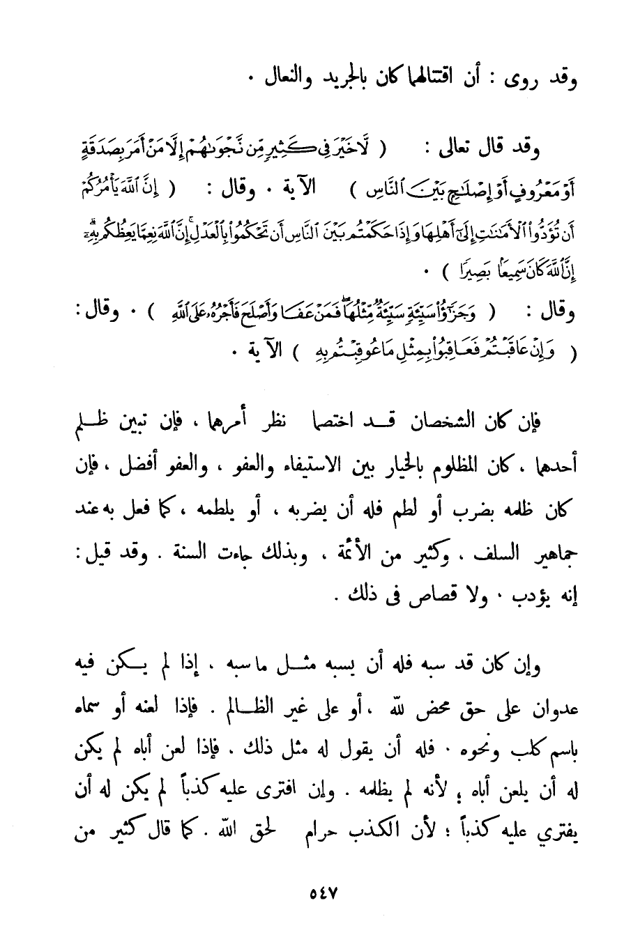 وَقَدْ رُوِيَ: أَنَّ اقْتِتَالَهُمَا كَانَ بِالْجَرِيدِ وَالنِّعَالِ. وَقَدْ قَالَ تَعَالَى: {لَا خَيْرَ فِي كَثِيرٍ مِنْ نَجْوَاهُمْ إلَّا مَنْ أَمَرَ بِصَدَقَةٍ أَوْ مَعْرُوفٍ أَوْ إصْلَاحٍ بَيْنَ النَّاسِ} الْآيَةَ. وَقَالَ: {إنَّ اللَّهَ يَأْمُرُكُمْ أَنْ تُؤَدُّوا الْأَمَانَاتِ إلَى أَهْلِهَا وَإِذَا حَكَمْتُمْ بَيْنَ النَّاسِ أَنْ تَحْكُمُوا بِالْعَدْلِ إنَّ اللَّهَ نِعِمَّا يَعِظُكُمْ بِهِ إنَّ اللَّهَ كَانَ سَمِيعًا بَصِيرًا} . وَقَالَ: {وَجَزَاءُ سَيِّئَةٍ سَيِّئَةٌ مِثْلُهَا فَمَنْ عَفَا وَأَصْلَحَ فَأَجْرُهُ عَلَى اللَّهِ} . وَقَالَ: {وَإِنْ عَاقَبْتُمْ فَعَاقِبُوا بِمِثْلِ مَا عُوقِبْتُمْ بِهِ} الْآيَةَ. فَإِنْ كَانَ الشَّخْصَانِ قَدْ اخْتَصَمَا نَظَرَ أَمْرَهُمَا فَإِنْ تَبَيَّنَ ظُلْمُ أَحَدِهِمَا كَانَ الْمَظْلُومُ بِالْخِيَارِ بَيْنَ الِاسْتِيفَاءِ وَالْعَفْوِ وَالْعَفْوُ أَفْضَلُ فَإِنْ كَانَ ظُلْمُهُ بِضَرْبِ أَوْ لَطْمٍ فَلَهُ أَنْ يَضْرِبَهُ أَوْ يَلْطِمَهُ كَمَا فَعَلَ بِهِ عِنْدَ جَمَاهِيرِ السَّلَفِ وَكَثِيرٍ مِنْ الْأَئِمَّةِ وَبِذَلِكَ جَاءَتْ السُّنَّةُ. وَقَدْ قِيلَ: إنَّهُ يُؤَدَّبُ وَلَا قِصَاصَ فِي ذَلِكَ. وَإِنْ كَانَ قَدْ سَبَّهُ فَلَهُ أَنْ يَسُبَّهُ مِثْلَ مَا سَبَّهُ إذَا لَمْ يَكُنْ فِيهِ عُدْوَانٌ عَلَى حَقٍّ مَحْضٍ لِلَّهِ أَوْ عَلَى غَيْرِ الظَّالِمِ. فَإِذَا لَعَنَهُ أَوْ سَمَّاهُ بِاسْمِ كَلْبٍ وَنَحْوِهِ فَلَهُ أَنْ يَقُولَ لَهُ مِثْلَ ذَلِكَ فَإِذَا لَعَنَ أَبَاهُ لَمْ يَكُنْ لَهُ أَنْ يَلْعَنَ أَبَاهُ؛ لِأَنَّهُ لَمْ يَظْلِمْهُ. وَإِنْ افْتَرَى عَلَيْهِ كَذِبًا لَمْ يَكُنْ لَهُ أَنْ يَفْتَرِيَ عَلَيْهِ كَذِبًا؛ لِأَنَّ الْكَذِبَ حَرَامٌ لِحَقِّ اللَّهِ. كَمَا قَالَ كَثِيرٌ