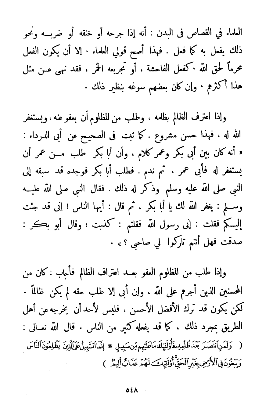 مِنْ الْعُلَمَاءِ فِي الْقِصَاصِ فِي الْبَدَنِ: أَنَّهُ إذَا جَرَحَهُ أَوْ خَنَقَهُ أَوْ ضَرَبَهُ وَنَحْوَ ذَلِكَ يَفْعَلُ بِهِ كَمَا فَعَلَ. فَهَذَا أَصَحُّ قَوْلَيْ الْعُلَمَاءِ إلَّا أَنْ يَكُونَ الْفِعْلُ مُحَرَّمًا لِحَقِّ اللَّهِ كَفِعْلِ الْفَاحِشَةِ أَوْ تَجْرِيعِهِ الْخَمْرَ فَقَدْ نَهَى عَنْ مِثْلِ هَذَا أَكْثَرُهُمْ وَإِنْ كَانَ بَعْضُهُمْ سَوَّغَهُ بِنَظِيرِ ذَلِكَ. وَإِذَا اعْتَرَفَ الظَّالِمُ بِظُلْمِهِ وَطَلَبَ مِنْ الْمَظْلُومِ أَنْ يَعْفُوَ عَنْهُ وَيَسْتَغْفِرَ اللَّهَ لَهُ فَهَذَا حَسَنٌ مَشْرُوعٌ. كَمَا ثَبَتَ فِي الصَّحِيحِ عَنْ أَبِي الدَّرْدَاءِ: {أَنَّهُ كَانَ بَيْنَ أَبِي بَكْرٍ وَعُمَرَ كَلَامٌ وَأَنَّ أَبَا بَكْرٍ طَلَبَ مِنْ عُمَرَ أَنْ يَسْتَغْفِرَ لَهُ فَأَبَى عُمَرُ ثُمَّ نَدِمَ. فَطَلَبَ أَبَا بَكْرٍ فَوَجَدَهُ قَدْ سَبَقَهُ إلَى النَّبِيِّ صَلَّى اللَّهُ عَلَيْهِ وَسَلَّمَ وَذَكَرَ لَهُ ذَلِكَ. فَقَالَ النَّبِيُّ صَلَّى اللَّهُ عَلَيْهِ وَسَلَّمَ يَغْفِرُ اللَّهُ لَك يَا أَبَا بَكْرٍ ثُمَّ قَالَ: أَيُّهَا النَّاسُ؛ إنِّي قَدْ جِئْت إلَيْكُمْ فَقُلْت: إنِّي رَسُولُ اللَّهِ فَقُلْتُمْ: كَذَبْت؛ وَقَالَ أَبُو بَكْرٍ: صَدَقْت فَهَلْ أَنْتُمْ تَارِكُو لِي صَاحِبِي} ؟ ". وَإِذَا طَلَبَ مِنْ الْمَظْلُومِ الْعَفْوَ بَعْدَ اعْتِرَافِ الظَّالِمِ فَأَجَابَ: كَانَ مِنْ الْمُحْسِنِينَ الَّذِينَ أَجْرُهُمْ عَلَى اللَّهِ وَإِنْ أَبَى إلَّا طَلَبَ حَقِّهِ لَمْ يَكُنْ ظَالِمًا. لَكِنْ يَكُونُ قَدْ تَرَكَ الْأَفْضَلَ الْأَحْسَنَ فَلَيْسَ لِأَحَدِ أَنْ يُخْرِجَهُ عَنْ أَهْلِ الطَّرِيقِ بِمُجَرَّدِ ذَلِكَ كَمَا قَدْ يَفْعَلُهُ كَثِيرٌ مِنْ النَّاسِ. قَالَ اللَّهُ تَعَالَى: {وَلَمَنِ انْتَصَرَ بَعْدَ ظُلْمِهِ فَأُولَئِكَ مَا عَلَيْهِمْ مِنْ سَبِيلٍ} {إنَّمَا السَّبِيلُ عَلَى الَّذِينَ يَظْلِمُونَ النَّاسَ وَيَبْغُونَ فِي الْأَرْضِ بِغَيْرِ الْحَقِّ أُولَئِكَ لَهُمْ عَذَابٌ