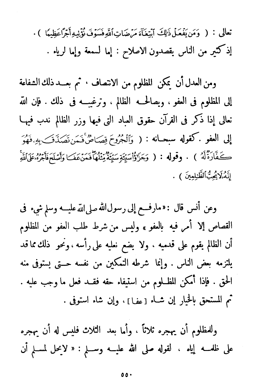 تَعَالَى: {وَمَنْ يَفْعَلْ ذَلِكَ ابْتِغَاءَ مَرْضَاةِ اللَّهِ فَسَوْفَ نُؤْتِيهِ أَجْرًا عَظِيمًا} . إذْ كَثِيرٌ مِنْ النَّاسِ يَقْصِدُونَ الْإِصْلَاحَ: إمَّا لِسُمْعَةِ وَإِمَّا لِرِيَاءِ. وَمِنْ الْعَدْلِ أَنْ يُمَكَّنَ الْمَظْلُومُ مِنْ الِانْتِصَافِ ثُمَّ بَعْدَ ذَلِكَ الشَّفَاعَةُ إلَى الْمَظْلُومِ فِي الْعَفْوِ وَيُصَالِحُهُ الظَّالِمُ وَتَرْغِيبُهُ فِي ذَلِكَ. فَإِنَّ اللَّهَ تَعَالَى إذَا ذَكَرَ فِي الْقُرْآنِ حُقُوقَ الْعِبَادِ الَّتِي فِيهَا وِزْرُ الظَّالِمِ نَدَبَ فِيهَا إلَى الْعَفْوِ. كَقَوْلِهِ سُبْحَانَهُ: {وَالْجُرُوحَ قِصَاصٌ فَمَنْ تَصَدَّقَ بِهِ فَهُوَ كَفَّارَةٌ لَهُ} . وَقَوْلُهُ: {وَجَزَاءُ سَيِّئَةٍ سَيِّئَةٌ مِثْلُهَا فَمَنْ عَفَا وَأَصْلَحَ فَأَجْرُهُ عَلَى اللَّهِ إنَّهُ لَا يُحِبُّ الظَّالِمِينَ} . وَعَنْ أَنَسٍ قَالَ: {مَا رُفِعَ إلَى رَسُولِ اللَّهِ صَلَّى اللَّهُ عَلَيْهِ وَسَلَّمَ شَيْءٌ فِي الْقِصَاصِ إلَّا أَمَرَ فِيهِ بِالْعَفْوِ} " وَلَيْسَ مِنْ شَرْطِ طَلَبِ الْعَفْوِ مِنْ الْمَظْلُومِ أَنَّ الظَّالِمَ يَقُومُ عَلَى قَدَمَيْهِ وَلَا يَضَعُ نَعْلَيْهِ عَلَى رَأْسِهِ وَنَحْوِ ذَلِكَ مِمَّا قَدْ يَلْتَزِمُهُ بَعْضُ النَّاسِ. وَإِنَّمَا شَرْطُهُ التَّمْكِينُ مِنْ نَفْسِهِ حَتَّى يُسْتَوْفَى مِنْهُ الْحَقُّ. فَإِذَا أَمْكَنَ الْمَظْلُومُ مِنْ اسْتِيفَاءِ حَقِّهِ فَقَدْ فَعَلَ مَا وَجَبَ عَلَيْهِ. ثُمَّ الْمُسْتَحِقُّ بِالْخِيَارِ إنْ شَاءَ عَفَا وَإِنْ شَاءَ اسْتَوْفَى. وَلِلْمَظْلُومِ أَنْ يَهْجُرَهُ ثَلَاثًا وَأَمَّا بَعْدَ الثَّلَاثِ فَلَيْسَ لَهُ أَنْ يَهْجُرَهُ عَلَى ظُلْمِهِ إيَّاهُ لِقَوْلِهِ صَلَّى اللَّهُ عَلَيْهِ وَسَلَّمَ {لَا يَحِلُّ لِمُسْلِمِ أَنْ