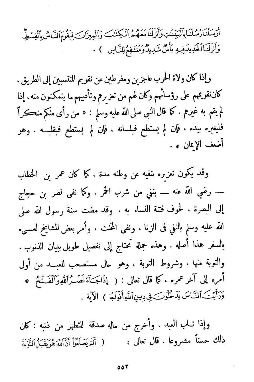 {لَقَدْ أَرْسَلْنَا رُسُلَنَا بِالْبَيِّنَاتِ وَأَنْزَلْنَا مَعَهُمُ الْكِتَابَ وَالْمِيزَانَ لِيَقُومَ النَّاسُ بِالْقِسْطِ وَأَنْزَلْنَا الْحَدِيدَ فِيهِ بَأْسٌ شَدِيدٌ وَمَنَافِعُ لِلنَّاسِ} . وَإِذَا كَانَ وُلَاةُ الْحَرْبِ عَاجِزِينَ وَمُفَرِّطِينَ عَنْ تَقْوِيمِ الْمُنْتَسِبِينَ إلَى الطَّرِيقِ كَانَ تَقْوِيمُهُمْ عَلَى رُؤَسَائِهِمْ وَكَانَ لَهُمْ مِنْ تَعْزِيرِهِمْ وَتَأْدِيبِهِمْ مَا يَتَمَكَّنُونَ مِنْهُ إذَا لَمْ يَقُمْ بِهِ غَيْرُهُمْ. كَمَا قَالَ النَّبِيُّ صَلَّى اللَّهُ عَلَيْهِ وَسَلَّمَ {مَنْ رَأَى مِنْكُمْ مُنْكَرًا فَلْيُغَيِّرْهُ بِيَدِهِ فَإِنْ لَمْ يَسْتَطِعْ فَبِلِسَانِهِ فَإِنْ لَمْ يَسْتَطِعْ فَبِقَلْبِهِ. وَهُوَ أَضْعَفُ الْإِيمَانِ} ". وَقَدْ يَكُونُ تَعْزِيرُهُ بِنَفْيِهِ عَنْ وَطَنِهِ مُدَّةً كَمَا كَانَ عُمَرُ بْنُ الْخَطَّابِ - رَضِيَ اللَّهُ عَنْهُ - يَنْفِي مِنْ شُرْبِ الْخَمْرِ. وَكَمَا نُفِيَ نَصْرُ بْنُ حَجَّاجٍ إلَى الْبَصْرَةِ لِخَوْفِ فِتْنَةِ النِّسَاءِ بِهِ وَقَدْ مَضَتْ سُنَّةُ رَسُولِ اللَّهِ صَلَّى اللَّهُ عَلَيْهِ وَسَلَّمَ بِالنَّفْيِ فِي الزِّنَا وَنَفْيِ الْمُخَنَّثِ وَأَمْرِ بَعْضِ الْمَشَايِخِ لِلْمُسِيءِ بِالسَّفَرِ هَذَا أَصْلُهُ. وَهَذِهِ جُمْلَةٌ تَحْتَاجُ إلَى تَفْصِيلٍ طَوِيلٍ بِبَيَانِ الذُّنُوبِ وَالتَّوْبَةِ مِنْهَا وَشُرُوطِ التَّوْبَةِ وَهُوَ حَالٌ مُسْتَصْحِبٌ لِلْعَبْدِ مِنْ أَوَّلِ أَمْرِهِ إلَى آخِرِ عُمْرِهِ كَمَا قَالَ تَعَالَى: {إذَا جَاءَ نَصْرُ اللَّهِ وَالْفَتْحُ} {وَرَأَيْتَ النَّاسَ يَدْخُلُونَ فِي دِينِ اللَّهِ أَفْوَاجًا} الْآيَةَ. وَإِذَا تَابَ الْعَبْدُ وَأَخْرَجَ مِنْ مَالِهِ صَدَقَةً لِلتَّطَهُّرِ مِنْ ذَنْبِهِ: كَانَ ذَلِكَ حَسَنًا مَشْرُوعًا. قَالَ تَعَالَى: {أَلَمْ يَعْلَمُوا أَنَّ اللَّهَ هُوَ يَقْبَلُ التَّوْبَةَ