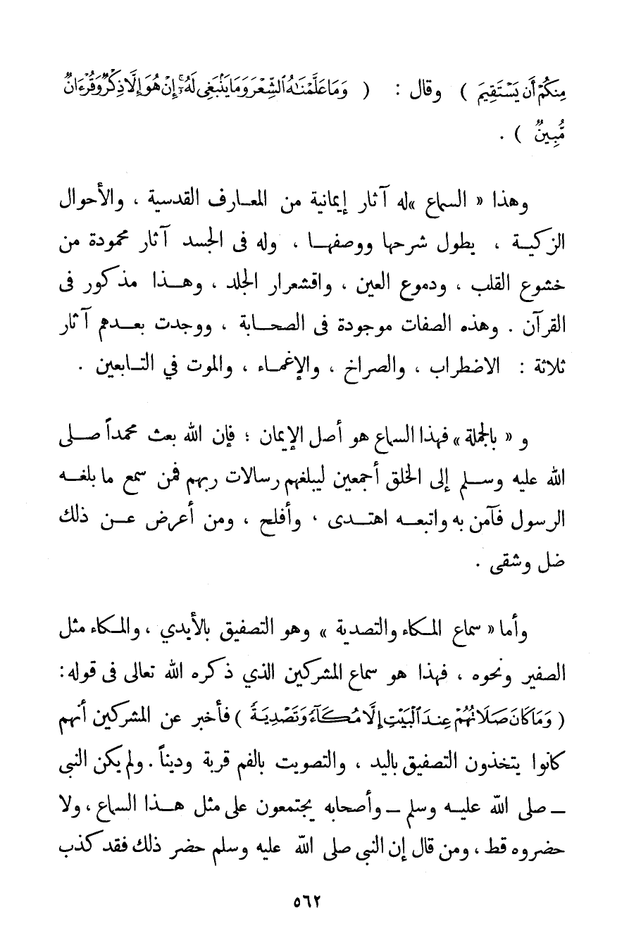 مِنْكُمْ أَنْ يَسْتَقِيمَ} وَقَالَ: {وَمَا عَلَّمْنَاهُ الشِّعْرَ وَمَا يَنْبَغِي لَهُ إنْ هُوَ إلَّا ذِكْرٌ وَقُرْآنٌ مُبِينٌ} . وَهَذَا " السَّمَاعُ " لَهُ آثَارٌ إيمَانِيَّةٌ مِنْ الْمَعَارِفِ الْقُدْسِيَّةِ وَالْأَحْوَالِ الزَّكِيَّةِ يَطُولُ شَرْحُهَا وَوَصْفُهَا وَلَهُ فِي الْجَسَدِ آثَارٌ مَحْمُودَةٌ مِنْ خُشُوعِ الْقَلْبِ وَدُمُوعِ الْعَيْنِ وَاقْشِعْرَارِ الْجِلْدِ وَهَذَا مَذْكُورٌ فِي الْقُرْآنِ. وَهَذِهِ الصِّفَاتُ مَوْجُودَةٌ فِي الصَّحَابَةِ وَوُجِدَتْ بَعْدَهُمْ آثَارٌ ثَلَاثَةٌ: الِاضْطِرَابُ وَالصُّرَاخُ وَالْإِغْمَاءُ وَالْمَوْتُ فِي التَّابِعِينَ. وَ " بِالْجُمْلَةِ " فَهَذَا السَّمَاعُ هُوَ أَصْلُ الْإِيمَانِ؛ فَإِنَّ اللَّهَ بَعَثَ مُحَمَّدًا صَلَّى اللَّهُ عَلَيْهِ وَسَلَّمَ إلَى الْخَلْقِ أَجْمَعِينَ لِيُبَلِّغَهُمْ رِسَالَاتِ رَبِّهِمْ فَمَنْ سَمِعَ مَا بَلَّغَهُ الرَّسُولُ فَآمَنَ بِهِ وَاتَّبَعَهُ اهْتَدَى وَأَفْلَحَ وَمَنْ أَعْرَضَ عَنْ ذَلِكَ ضَلَّ وَشَقِيَ.