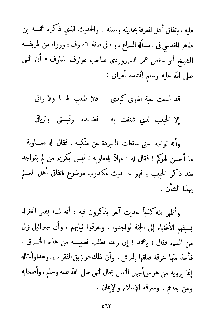 عَلَيْهِ بِاتِّفَاقِ أَهْلِ الْمَعْرِفَةِ بِحَدِيثِهِ وَسُنَّتِهِ. وَالْحَدِيثُ الَّذِي ذَكَرَهُ مُحَمَّدُ بْنُ طَاهِرٍ المقدسي فِي " مَسْأَلَةِ السَّمَاعِ " وَ " فِي صِفَةِ التَّصَوُّفِ " وَرَوَاهُ مِنْ طَرِيقِهِ الشَّيْخُ أَبُو حَفْصٍ عُمَرُ السهروردي صَاحِبُ عَوَارِفِ الْمَعَارِفِ {أَنَّ النَّبِيَّ صَلَّى اللَّهُ عَلَيْهِ وَسَلَّمَ أَنْشَدَهُ أَعْرَابِيٌّ:
