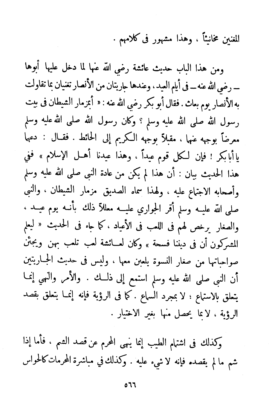 الْمُغَنِّينَ مَخَانِيث وَهَذَا مَشْهُورٌ فِي كَلَامِهِمْ. وَمِنْ هَذَا الْبَابِ حَدِيثُ {عَائِشَةَ رَضِيَ اللَّهُ عَنْهَا لَمَّا دَخَلَ عَلَيْهَا أَبُوهَا - رَضِيَ اللَّهُ عَنْهُ - فِي أَيَّامِ الْعِيدِ وَعِنْدَهَا جَارِيَتَانِ مِنْ الْأَنْصَارِ تُغَنِّيَانِ بِمَا تَقَاوَلَتْ بِهِ الْأَنْصَارُ يَوْمَ بُعَاثٍ. فَقَالَ أَبُو بَكْرٍ رَضِيَ اللَّهُ عَنْهُ أَبِمِزْمَارِ الشَّيْطَانِ فِي بَيْتِ رَسُولِ اللَّهِ صَلَّى اللَّهُ عَلَيْهِ وَسَلَّمَ؟ وَكَانَ رَسُولُ اللَّهِ صَلَّى اللَّهُ عَلَيْهِ وَسَلَّمَ مُعْرِضًا بِوَجْهِهِ عَنْهُمَا مُقْبِلًا بِوَجْهِهِ الْكَرِيمِ إلَى الْحَائِطِ. فَقَالَ: دَعْهُمَا يَا أَبَا بَكْرٍ فَإِنَّ لِكُلِّ قَوْمٍ عِيدًا وَهَذَا عِيدُنَا أَهْلَ الْإِسْلَامِ} فَفِي هَذَا الْحَدِيثِ بَيَانُ: أَنَّ هَذَا لَمْ يَكُنْ مِنْ عَادَةِ النَّبِيِّ صَلَّى اللَّهُ عَلَيْهِ وَسَلَّمَ وَأَصْحَابِهِ الِاجْتِمَاعُ عَلَيْهِ وَلِهَذَا سَمَّاهُ الصِّدِّيقُ مِزْمَارَ الشَّيْطَانِ وَالنَّبِيُّ صَلَّى اللَّهُ عَلَيْهِ وَسَلَّمَ أَقَرَّ الْجَوَارِيَ عَلَيْهِ مُعَلِّلًا ذَلِكَ بِأَنَّهُ يَوْمُ عِيدٍ وَالصِّغَارُ يُرَخَّصُ لَهُمْ فِي اللَّعِبِ فِي الْأَعْيَادِ كَمَا جَاءَ فِي الْحَدِيثِ {لِيَعْلَمَ الْمُشْرِكُونَ أَنَّ فِي دِينِنَا فُسْحَةً} " وَكَانَ لِعَائِشَةَ لُعَبٌ تَلْعَبُ بِهِنَّ وَيَجِئْنَ صَوَاحِبَاتُهَا مِنْ صِغَارِ النِّسْوَةِ يَلْعَبْنَ مَعَهَا وَلَيْسَ فِي حَدِيثِ الْجَارِيَتَيْنِ أَنَّ النَّبِيَّ صَلَّى اللَّهُ عَلَيْهِ وَسَلَّمَ اسْتَمَعَ إلَى ذَلِكَ. وَالْأَمْرُ وَالنَّهْيُ إنَّمَا يَتَعَلَّقُ بِالِاسْتِمَاعِ؛ لَا بِمُجَرَّدِ السَّمَاعِ. كَمَا فِي الرُّؤْيَةِ فَإِنَّهُ إنَّمَا يَتَعَلَّقُ بِقَصْدِ الرُّؤْيَةِ لَا بِمَا يَحْصُلُ مِنْهَا بِغَيْرِ الِاخْتِيَارِ. وَكَذَلِكَ فِي اشْتِمَامِ الطَّيِّبِ إنَّمَا يُنْهَى الْمُحْرِمُ عَنْ قَصْدِ الشَّمِّ فَأَمَّا إذَا شَمَّ مَا لَمْ يَقْصِدْهُ فَإِنَّهُ لَا شَيْءَ عَلَيْهِ. وَكَذَلِكَ فِي مُبَاشَرَةِ الْمُحَرَّمَاتِ كَالْحَوَاسِّ
