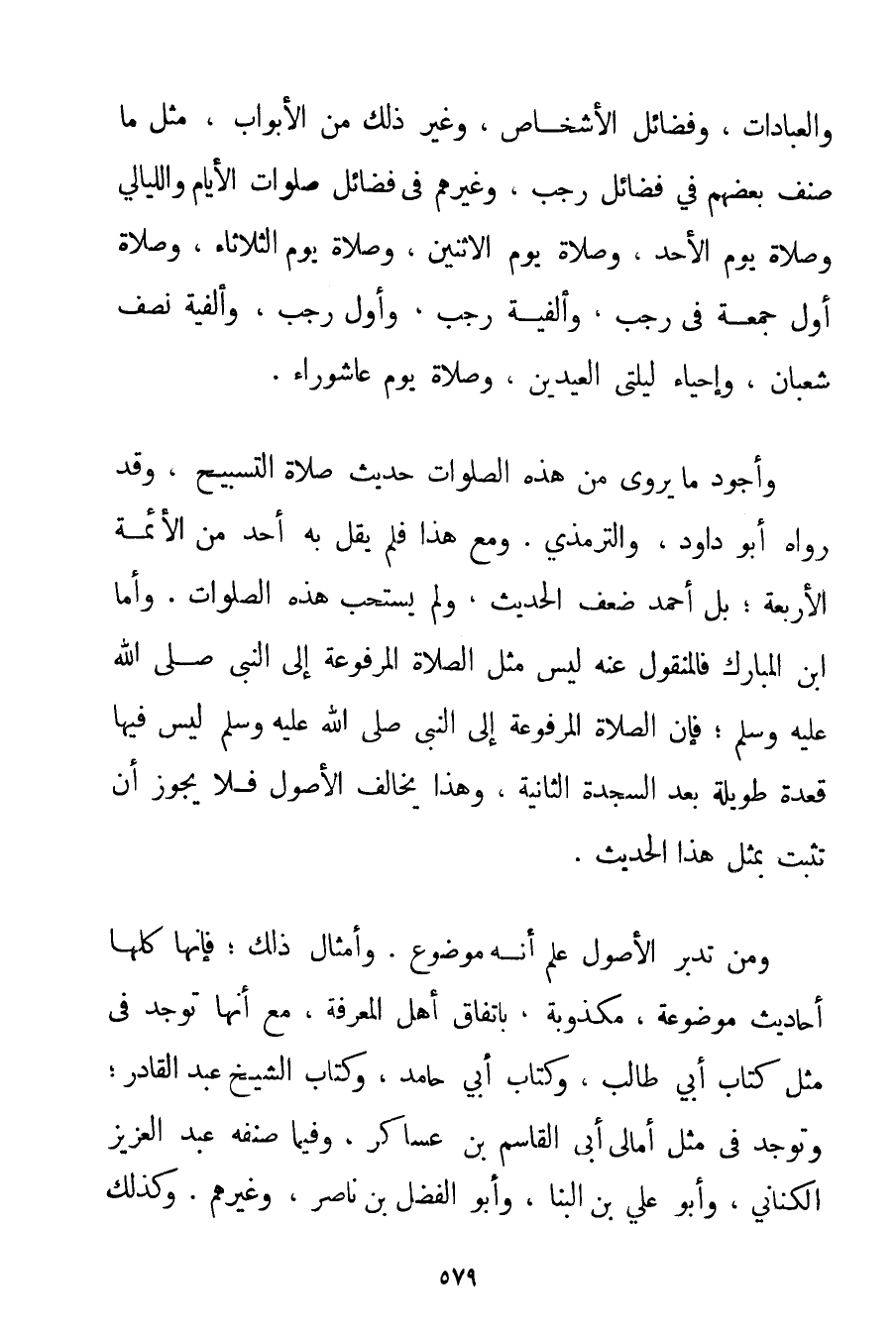 وَالْعِبَادَاتِ وَفَضَائِلِ الْأَشْخَاصِ وَغَيْر ذَلِكَ مِنْ الْأَبْوَابِ مِثْلَ مَا صَنَّفَ بَعْضُهُمْ فِي فَضَائِلِ رَجَبٍ وَغَيْرِهِمْ فِي فَضَائِلِ صَلَوَاتِ الْأَيَّامِ وَاللَّيَالِي وَصَلَاةِ يَوْمِ الْأَحَدِ وَصَلَاةِ يَوْمِ الِاثْنَيْنِ وَصَلَاةِ يَوْمِ الثُّلَاثَاءَ وَصَلَاةِ أَوَّلِ جُمُعَةٍ فِي رَجَبٍ وَأَلْفِيَّةِ رَجَبٍ وَأَوَّلِ رَجَبٍ وَأَلْفِيَّةِ نِصْفِ شَعْبَانَ وَإِحْيَاءِ لَيْلَتَيْ الْعِيدَيْنِ وَصَلَاةِ يَوْمِ عَاشُورَاءَ. وَأَجْوَدُ مَا يُرْوَى مِنْ هَذِهِ الصَّلَوَاتِ حَدِيثُ صَلَاةِ التَّسْبِيحِ وَقَدْ رَوَاهُ أَبُو دَاوُد وَالتِّرْمِذِي. وَمَعَ هَذَا فَلَمْ يَقُلْ بِهِ أَحَدٌ مِنْ الْأَئِمَّةِ الْأَرْبَعَةِ؛ بَلْ أَحْمَدُ ضَعَّفَ الْحَدِيثَ وَلَمْ يَسْتَحِبَّ هَذِهِ الصَّلَوَاتِ. وَأَمَّا ابْنُ الْمُبَارَكِ فَالْمَنْقُولُ عَنْهُ لَيْسَ مِثْلَ الصَّلَاةِ الْمَرْفُوعَةِ إلَى النَّبِيِّ صَلَّى اللَّهُ عَلَيْهِ وَسَلَّمَ فَإِنَّ الصَّلَاةَ الْمَرْفُوعَةَ إلَى النَّبِيِّ صَلَّى اللَّهُ عَلَيْهِ وَسَلَّمَ لَيْسَ فِيهَا قَعْدَةٌ طَوِيلَةٌ بَعْدَ السَّجْدَةِ الثَّانِيَةِ وَهَذَا يُخَالِفُ الْأُصُولَ فَلَا يَجُوزُ أَنْ تَثْبُتَ بِمِثْلِ هَذَا الْحَدِيثِ. وَمَنْ تَدَبَّرَ الْأُصُولَ عَلِمَ أَنَّهُ مَوْضُوعٌ. وَأَمْثَالِ ذَلِكَ؛ فَإِنَّهَا كُلَّهَا أَحَادِيثُ مَوْضُوعَةٌ مَكْذُوبَةٌ بِاتِّفَاقِ أَهْلِ الْمَعْرِفَةِ مَعَ أَنَّهَا تُوجَدُ فِي مِثْلِ كُتَّابِ أَبِي طَالِبٍ وَكِتَابِ أَبِي حَامِدٍ وَكِتَابِ الشَّيْخِ عَبْدِ الْقَادِرِ؛ وَتُوجَدُ فِي مِثْلِ أَمَالِي أَبِي الْقَاسِمِ بْنِ عَسَاكِرَ وَفِيمَا صَنَّفَهُ عَبْدُ الْعَزِيزِ الْكِنَانِيُّ وَأَبُو عَلِيٍّ بْنُ البنا وَأَبُو الْفَضْلِ بْنُ نَاصِرٍ وَغَيْرُهُمْ. وَكَذَلِكَ