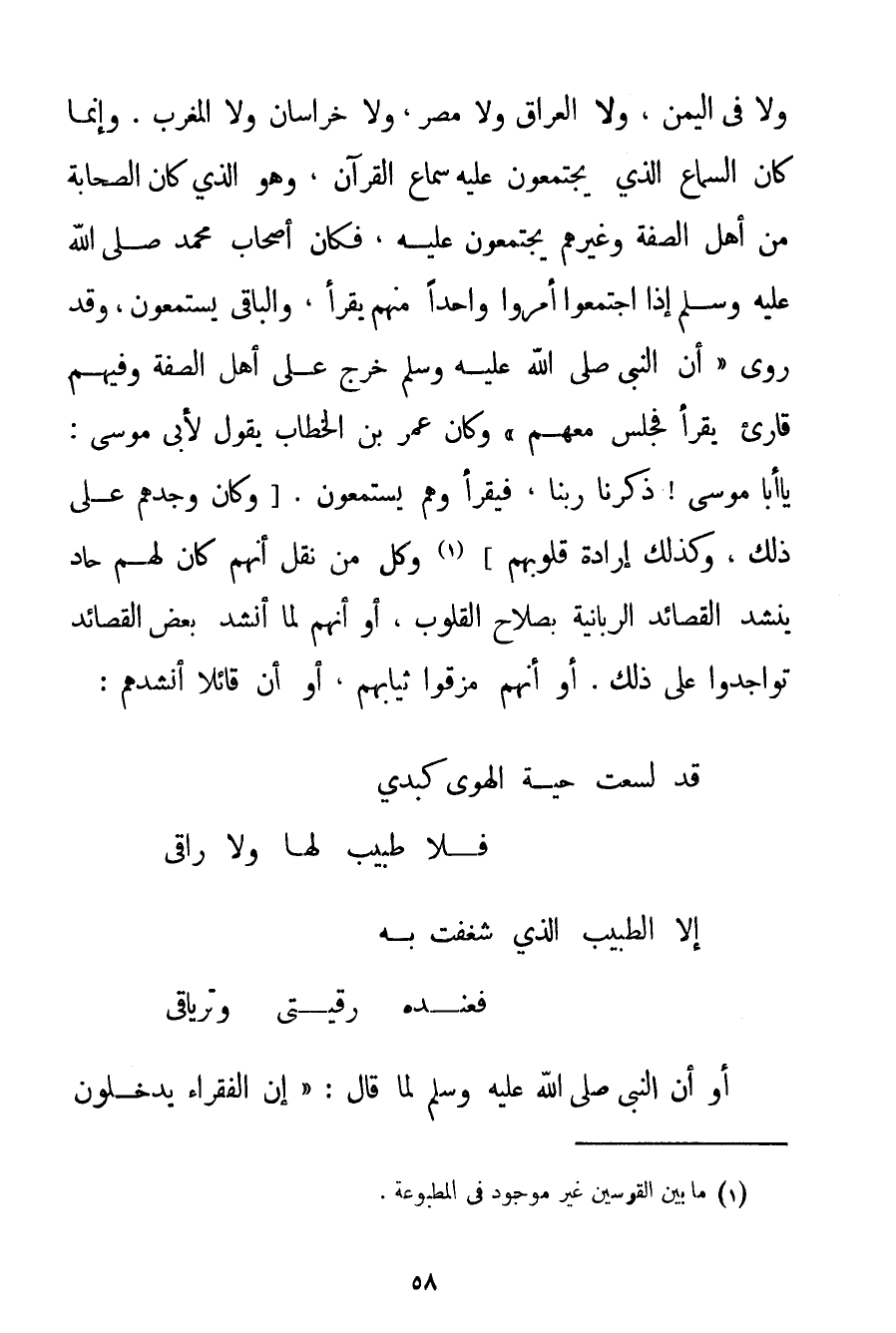 وَلَا فِي الْيَمَنِ وَلَا الْعِرَاقِ وَلَا مِصْرَ وَلَا خُرَاسَانَ وَلَا الْمَغْرِبِ. وَإِنَّمَا كَانَ السَّمَاعُ الَّذِي يَجْتَمِعُونَ عَلَيْهِ سَمَاعُ الْقُرْآنِ وَهُوَ الَّذِي كَانَ الصَّحَابَةُ مِنْ أَهْلِ الصُّفَّةِ وَغَيْرِهِمْ يَجْتَمِعُونَ عَلَيْهِ فَكَانَ أَصْحَابُ مُحَمَّدٍ صَلَّى اللَّهُ عَلَيْهِ وَسَلَّمَ إذَا اجْتَمَعُوا أَمَرُوا وَاحِدًا مِنْهُمْ يَقْرَأُ وَالْبَاقِي يَسْتَمِعُونَ وَقَدْ رُوِيَ {أَنَّ النَّبِيَّ صَلَّى اللَّهُ عَلَيْهِ وَسَلَّمَ خَرَجَ عَلَى أَهْلِ الصُّفَّةِ وَفِيهِمْ قَارِئٌ يَقْرَأُ فَجَلَسَ مَعَهُمْ} وَكَانَ عُمَرُ بْنُ الْخَطَّابِ يَقُولُ لِأَبِي مُوسَى: يَا أَبَا مُوسَى ذَكِّرْنَا رَبَّنَا فَيَقْرَأُ وَهُمْ يَسْتَمِعُونَ. وَكَانَ وَجْدُهُمْ عَلَى ذَلِكَ وَكَذَلِكَ إرَادَةُ قُلُوبِهِمْ وَكُلُّ مَنْ نَقَلَ أَنَّهُمْ كَانَ لَهُمْ حَادٍ يُنْشِدُ الْقَصَائِدَ الرَّبَّانِيَّةَ بِصَلَاحِ الْقُلُوبِ أَوْ أَنَّهُمْ لَمَّا أَنْشَدَ بَعْضَ الْقَصَائِدِ تَوَاجَدُوا عَلَى ذَلِكَ. أَوْ أَنَّهُمْ مَزَّقُوا ثِيَابَهُمْ أَوْ أَنَّ قَائِلًا أَنْشَدَهُمْ: