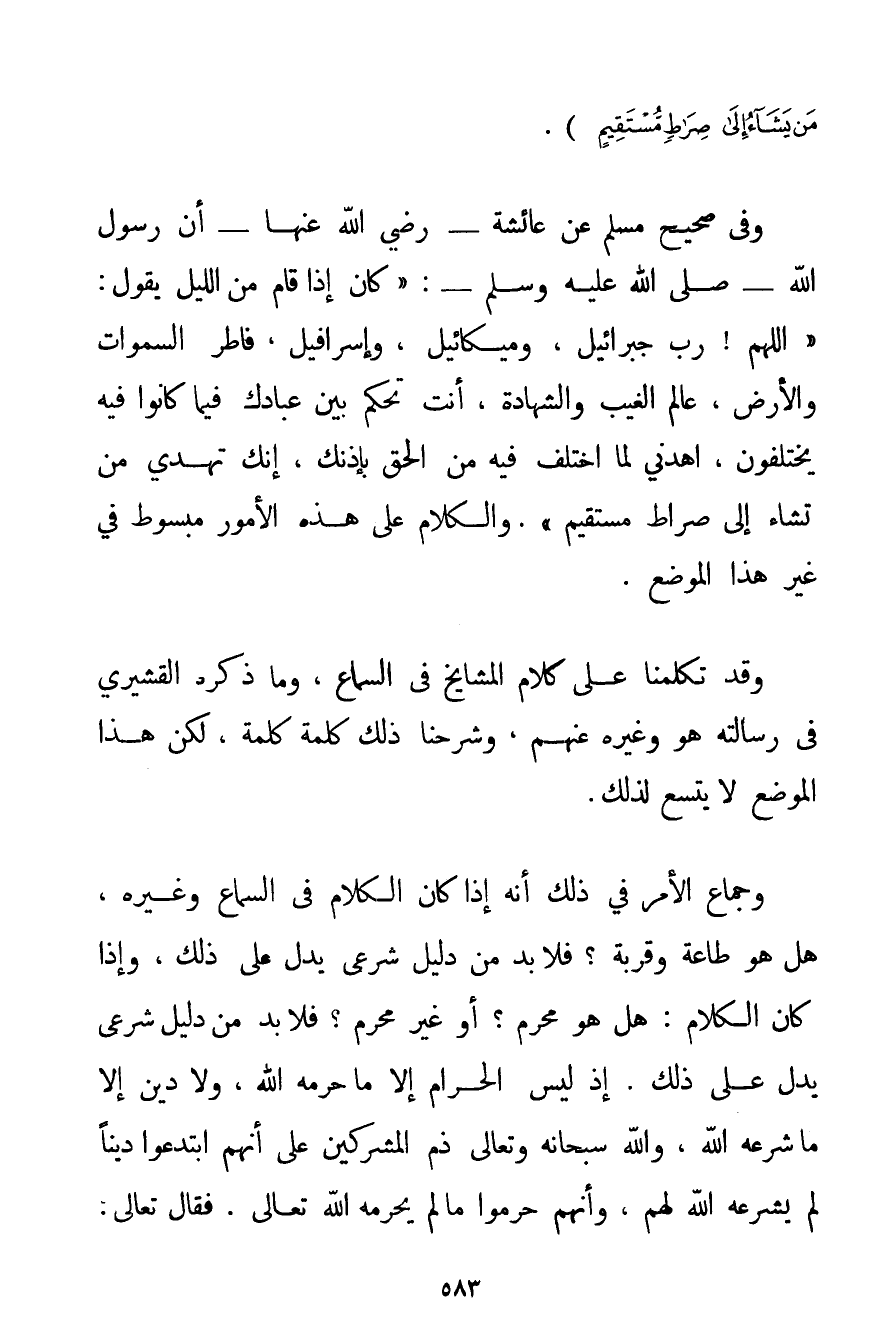 الْحَقِّ بِإِذْنِهِ وَاللَّهُ يَهْدِي مَنْ يَشَاءُ إلَى صِرَاطٍ مُسْتَقِيمٍ} . وَفِي صَحِيحِ مُسْلِمٍ عَنْ عَائِشَةَ - رَضِيَ اللَّهُ عَنْهَا - {أَنَّ رَسُولَ اللَّهِ - صَلَّى اللَّهُ عَلَيْهِ وَسَلَّمَ -: كَانَ إذَا قَامَ مِنْ اللَّيْلِ يَقُولُ: اللَّهُمَّ رَبَّ جبرائيل وميكائيل وَإِسْرَافِيلَ فَاطِرَ السَّمَوَاتِ وَالْأَرْضِ عَالِمَ الْغَيْبِ وَالشَّهَادَةِ أَنْتَ تَحْكُمُ بَيْنَ عِبَادِك فِيمَا كَانُوا فِيهِ يَخْتَلِفُونَ اهْدِنِي لِمَا اُخْتُلِفَ فِيهِ مِنْ الْحَقِّ بِإِذْنِك إنَّك تَهْدِي مَنْ تَشَاءُ إلَى صِرَاطٍ مُسْتَقِيمٍ} . وَالْكَلَامُ عَلَى هَذِهِ الْأُمُورِ مَبْسُوطٌ فِي غَيْرِ هَذَا الْمَوْضِعِ. وَقَدْ تَكَلَّمْنَا عَلَى كَلَامِ الْمَشَايِخِ فِي السَّمَاعِ وَمَا ذَكَرَهُ القشيري فِي رِسَالَتِهِ هُوَ وَغَيْرُهُ عَنْهُمْ وَشَرَحْنَا ذَلِكَ كَلِمَةً كَلِمَةً لَكِنَّ هَذَا الْمَوْضِعَ لَا يَتَّسِعُ لِذَلِكَ. وَجِمَاعُ الْأَمْرِ فِي ذَلِكَ أَنَّهُ إذَا كَانَ الْكَلَامُ فِي السَّمَاعِ وَغَيْرِهِ هَلْ هُوَ طَاعَةٌ وَقُرْبَةٌ؟ فَلَا بُدَّ مِنْ دَلِيلٍ شَرْعِيٍّ يَدُلُّ عَلَى ذَلِكَ وَإِذَا كَانَ الْكَلَامُ: هَلْ هُوَ مُحَرَّمٌ؟ أَوْ غَيْرُ مُحَرَّمٍ؟ فَلَا بُدَّ مِنْ دَلِيلٍ شَرْعِيٍّ يَدُلُّ عَلَى ذَلِكَ. إذْ لَيْسَ الْحَرَامُ إلَّا مَا حَرَّمَهُ اللَّهُ وَلَا دِينَ إلَّا مَا شَرَعَهُ اللَّهُ وَاَللَّهُ سُبْحَانَهُ وَتَعَالَى ذَمَّ الْمُشْرِكِينَ عَلَى أَنَّهُمْ ابْتَدَعُوا دِينًا لَمْ يَشْرَعْهُ اللَّهُ لَهُمْ وَأَنَّهُمْ حَرَّمُوا مَا لَمْ يُحَرِّمْهُ اللَّهُ تَعَالَى. فَقَالَ تَعَالَى: