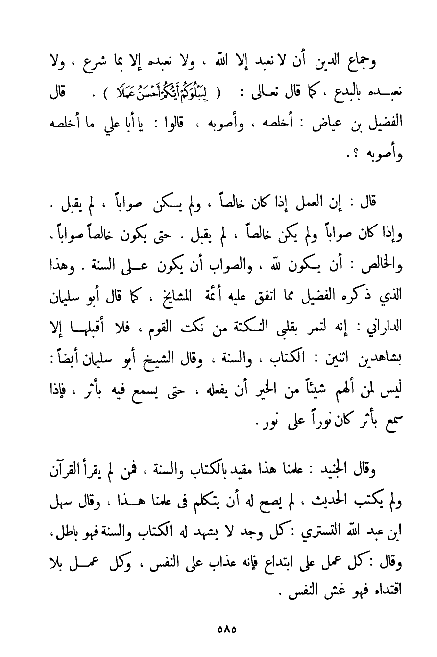 وَجِمَاعُ الدِّينِ أَنْ لَا نَعْبُدَ إلَّا اللَّهَ وَلَا نَعْبُدُهُ إلَّا بِمَا شَرَعَ وَلَا نَعْبُدُهُ بِالْبِدَعِ كَمَا قَالَ تَعَالَى: {لِيَبْلُوَكُمْ أَيُّكُمْ أَحْسَنُ عَمَلًا} . قَالَ الْفُضَيْل بْنُ عِيَاضٍ: أَخْلَصَهُ وَأَصْوَبَهُ قَالُوا: يَا أَبَا عَلِيٍّ مَا أَخْلَصُهُ وَأَصْوَبُهُ؟ . قَالَ: إنَّ الْعَمَلَ إذَا كَانَ خَالِصًا وَلَمْ يَكُنْ صَوَابًا لَمْ يُقْبَلْ. وَإِذَا كَانَ صَوَابًا وَلَمْ يَكُنْ خَالِصًا لَمْ يُقْبَلْ. حَتَّى يَكُونَ خَالِصًا صَوَابًا وَالْخَالِصُ: أَنْ يَكُونَ لِلَّهِ وَالصَّوَابُ أَنْ يَكُونَ عَلَى السُّنَّةِ. وَهَذَا الَّذِي ذَكَرَهُ الْفُضَيْل مِمَّا اتَّفَقَ عَلَيْهِ أَئِمَّةُ الْمَشَايِخِ كَمَا قَالَ أَبُو سُلَيْمَانَ الداراني: إنَّهُ لَتَمُرُّ بِقَلْبِي النُّكْتَةُ مِنْ نُكَتِ الْقَوْمِ فَلَا أَقْبَلُهَا إلَّا بِشَاهِدَيْنِ اثْنَيْنِ: الْكِتَابِ وَالسُّنَّةِ وَقَالَ الشَّيْخُ أَبُو سُلَيْمَانَ أَيْضًا: لَيْسَ لِمَنْ أُلْهِمُ شَيْئًا مِنْ الْخَيْرِ أَنْ يَفْعَلَهُ حَتَّى يَسْمَعَ فِيهِ بِأَثَرِ فَإِذَا سَمِعَ بِأَثَرٍ كَانَ نُورًا عَلَى نُورٍ. وَقَالَ الْجُنَيْد: عِلْمُنَا هَذَا مُقَيَّدٌ بِالْكِتَابِ وَالسُّنَّةِ فَمَنْ لَمْ يَقْرَأْ الْقُرْآنَ وَلَمْ يَكْتُبْ الْحَدِيثَ لَمْ يَصِحَّ لَهُ أَنَّ يَتَكَلَّمَ فِي عِلْمِنَا هَذَا وَقَالَ سَهْلٌ بْنُ عَبْدِ اللَّهِ التستري: كُلُّ وَجْدٍ لَا يَشْهَدُ لَهُ الْكِتَابُ وَالسُّنَّةُ فَهُوَ بَاطِلٌ وَقَالَ: كُلُّ عَمَلٍ عَلَى ابْتِدَاعٍ فَإِنَّهُ عَذَابٌ عَلَى النَّفْسِ وَكُلُّ عَمَلٍ بِلَا اقْتِدَاءٍ فَهُوَ غِشُّ النَّفْسِ.