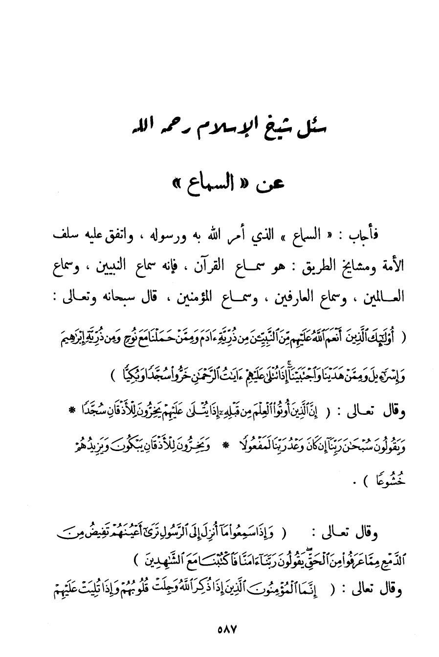 " السَّمَاعُ " الَّذِي أَمَرَ اللَّهُ بِهِ وَرَسُولُهُ وَاتَّفَقَ عَلَيْهِ سَلَفُ الْأُمَّةِ وَمَشَايِخُ الطَّرِيقِ: هُوَ سَمَاعُ الْقُرْآنِ فَإِنَّهُ سَمَاعُ النَّبِيِّينَ وَسَمَاعُ الْعَالَمِينَ وَسَمَاعُ الْعَارِفِينَ وَسَمَاعُ الْمُؤْمِنِينَ قَالَ سُبْحَانَهُ وَتَعَالَى: {أُولَئِكَ الَّذِينَ أَنْعَمَ اللَّهُ عَلَيْهِمْ مِنَ النَّبِيِّينَ مِنْ ذُرِّيَّةِ آدَمَ وَمِمَّنْ حَمَلْنَا مَعَ نُوحٍ وَمِنْ ذُرِّيَّةِ إبْرَاهِيمَ وَإِسْرَائِيلَ وَمِمَّنْ هَدَيْنَا وَاجْتَبَيْنَا إذَا تُتْلَى عَلَيْهِمْ آيَاتُ الرَّحْمَنِ خَرُّوا سُجَّدًا وَبُكِيًّا} وَقَالَ تَعَالَى: {إنَّ الَّذِينَ أُوتُوا الْعِلْمَ مِنْ قَبْلِهِ إذَا يُتْلَى عَلَيْهِمْ يَخِرُّونَ لِلْأَذْقَانِ سُجَّدًا} {وَيَقُولُونَ سُبْحَانَ رَبِّنَا إنْ كَانَ وَعْدُ رَبِّنَا لَمَفْعُولًا} {وَيَخِرُّونَ لِلْأَذْقَانِ يَبْكُونَ وَيَزِيدُهُمْ خُشُوعًا} . وَقَالَ تَعَالَى: {وَإِذَا سَمِعُوا مَا أُنْزِلَ إلَى الرَّسُولِ تَرَى أَعْيُنَهُمْ تَفِيضُ مِنَ الدَّمْعِ مِمَّا عَرَفُوا مِنَ الْحَقِّ يَقُولُونَ رَبَّنَا آمَنَّا فَاكْتُبْنَا مَعَ الشَّاهِدِينَ} وَقَالَ تَعَالَى: {إنَّمَا الْمُؤْمِنُونَ الَّذِينَ إذَا ذُكِرَ اللَّهُ وَجِلَتْ