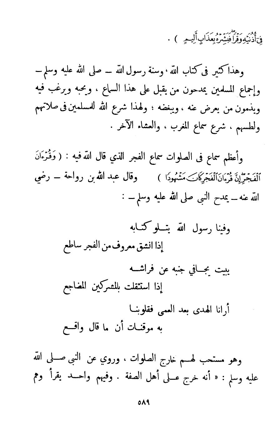 آيَاتُنَا وَلَّى مُسْتَكْبِرًا كَأَنْ لَمْ يَسْمَعْهَا كَأَنَّ فِي أُذُنَيْهِ وَقْرًا فَبَشِّرْهُ بِعَذَابٍ أَلِيمٍ} . وَهَذَا كَثِيرٌ فِي كِتَابِ اللَّهِ وَسُنَّةِ رَسُولِ اللَّهِ - صَلَّى اللَّهُ عَلَيْهِ وَسَلَّمَ - وَإِجْمَاعِ الْمُسْلِمِينَ يَمْدَحُونَ مَنْ يُقْبِلُ عَلَى هَذَا السَّمَاعِ وَيُحِبُّهُ وَيَرْغَبُ فِيهِ وَيَذُمُّونَ مَنْ يُعْرِضُ عَنْهُ وَيُبْغِضُهُ؛ وَلِهَذَا شَرَعَ اللَّهُ لِلْمُسْلِمِينَ فِي صَلَاتِهِمْ وَلَطَسَّهُمْ (1) شَرَعَ سَمَاعَ الْمَغْرِبِ وَالْعِشَاءِ الْآخَرِ. وَأَعْظَمُ سَمَاعٍ فِي الصَّلَوَاتِ سَمَاعُ الْفَجْرِ الَّذِي قَالَ اللَّهُ فِيهِ: {وَقُرْآنَ الْفَجْرِ إنَّ قُرْآنَ الْفَجْرِ كَانَ مَشْهُودًا} وَقَالَ عَبْدُ اللَّهِ بْنُ رَوَاحَةَ - رَضِيَ اللَّهُ عَنْهُ - يَمْدَحُ النَّبِيَّ صَلَّى اللَّهُ عَلَيْهِ وَسَلَّمَ -: