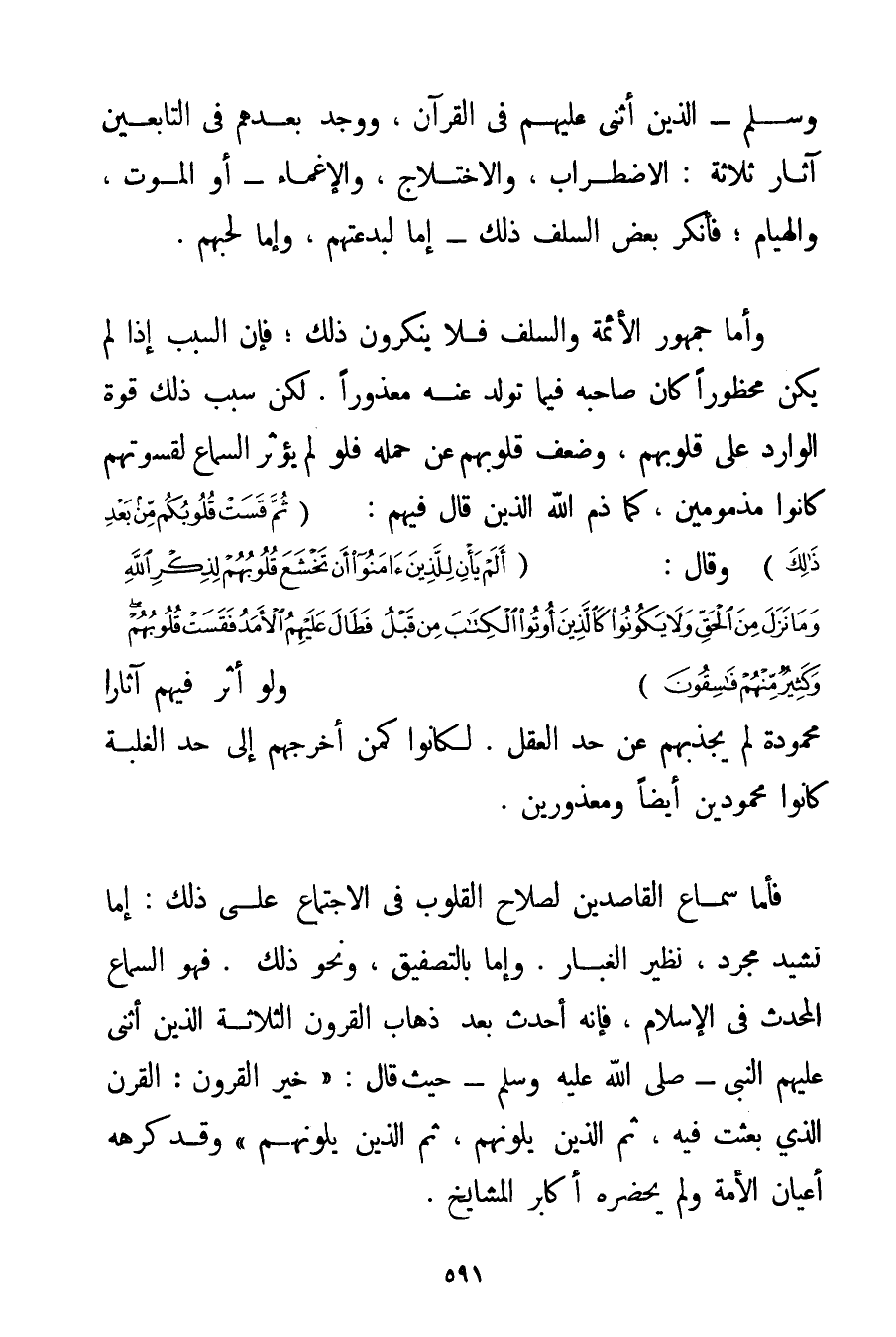 صَلَّى اللَّهُ عَلَيْهِ وَسَلَّمَ وسلم الَّذِينَ أَثْنَى عَلَيْهِمْ فِي الْقُرْآنِ وَوُجِدَ بَعْدَهُمْ فِي التَّابِعِينَ آثَارٌ ثَلَاثَةٌ: الِاضْطِرَابُ وَالِاخْتِلَاجُ وَالْإِغْمَاءُ - أَوْ الْمَوْتُ وَالْهُيَامُ؛ فَأَنْكَرَ بَعْضُ السَّلَفِ ذَلِكَ - إمَّا لِبِدْعَتِهِمْ وَإِمَّا لِحُبِّهِمْ. وَأَمَّا جُمْهُورُ الْأَئِمَّةِ وَالسَّلَفِ فَلَا يُنْكِرُونَ ذَلِكَ؛ فَإِنَّ السَّبَبَ إذَا لَمْ يَكُنْ مَحْظُورًا كَانَ صَاحِبُهُ فِيمَا تَوَلَّدَ عَنْهُ مَعْذُورًا. لَكِنَّ سَبَبَ ذَلِكَ قُوَّةُ الْوَارِدِ عَلَى قُلُوبِهِمْ وَضَعْفُ قُلُوبِهِمْ عَنْ حَمْلِهِ فَلَوْ لَمْ يُؤَثِّرْ السَّمَاعُ لِقَسْوَتِهِمْ كَانُوا مَذْمُومِينَ كَمَا ذَمَّ اللَّهُ الَّذِينَ قَالَ فِيهِمْ: {ثُمَّ قَسَتْ قُلُوبُكُمْ مِنْ بَعْدِ ذَلِكَ} وَقَالَ: {أَلَمْ يَأْنِ لِلَّذِينَ آمَنُوا أَنْ تَخْشَعَ قُلُوبُهُمْ لِذِكْرِ اللَّهِ وَمَا نَزَلَ مِنَ الْحَقِّ وَلَا يَكُونُوا كَالَّذِينَ أُوتُوا الْكِتَابَ مِنْ قَبْلُ فَطَالَ عَلَيْهِمُ الْأَمَدُ فَقَسَتْ قُلُوبُهُمْ وَكَثِيرٌ مِنْهُمْ فَاسِقُونَ} وَلَوْ أَثَّرَ فِيهِمْ آثَارًا مَحْمُودَةً لَمْ يَجْذِبْهُمْ عَنْ حَدِّ الْعَقْلِ. لَكَانُوا كَمَنْ أَخْرَجَهُمْ إلَى حَدِّ الْغَلَبَةِ كَانُوا مَحْمُودِينَ أَيْضًا وَمَعْذُورِينَ.
