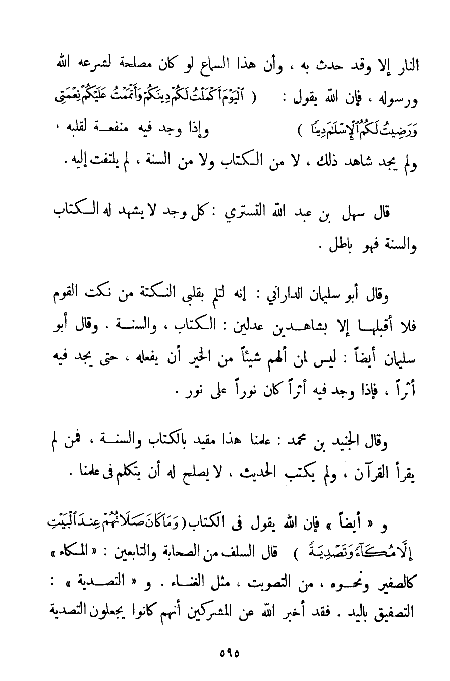 النَّارِ إلَّا وَقَدْ حَدَّثَ بِهِ وَأَنَّ هَذَا السَّمَاعَ لَوْ كَانَ مَصْلَحَةً لَشَرَعَهُ اللَّهُ وَرَسُولُهُ فَإِنَّ اللَّهَ يَقُولُ: {الْيَوْمَ أَكْمَلْتُ لَكُمْ دِينَكُمْ وَأَتْمَمْتُ عَلَيْكُمْ نِعْمَتِي وَرَضِيتُ لَكُمُ الْإِسْلَامَ دِينًا} وَإِذَا وَجَدَ فِيهِ مَنْفَعَةً لِقَلْبِهِ وَلَمْ يَجِدْ شَاهِدَ ذَلِكَ لَا مِنْ الْكِتَابِ وَلَا مِنْ السُّنَّةِ لَمْ يَلْتَفِتْ إلَيْهِ. قَالَ سَهْلُ بْنُ عَبْدِ اللَّهِ التستري: كُلُّ وَجْدٍ لَا يَشْهَدُ لَهُ الْكِتَابُ وَالسُّنَّةُ فَهُوَ بَاطِلٌ. وَقَالَ أَبُو سُلَيْمَانَ الداراني: إنَّهُ لَتَلُمُّ بِقَلْبِي النُّكْتَةُ مِنْ نُكَتِ الْقَوْمِ فَلَا أَقْبَلُهَا إلَّا بِشَاهِدَيْنِ عَدْلَيْنِ: الْكِتَابِ وَالسُّنَّةِ. وَقَالَ أَبُو سُلَيْمَانَ أَيْضًا: لَيْسَ لِمَنْ أُلْهِمَ شَيْئًا مِنْ الْخَيْرِ أَنْ يَفْعَلَهُ حَتَّى يَجِدَ فِيهِ أَثَرًا فَإِذَا وَجَدَ فِيهِ أَثَرًا كَانَ نُورًا عَلَى نُورٍ. وَقَالَ الْجُنَيْد بْنُ مُحَمَّدٍ: عِلْمُنَا هَذَا مُقَيَّدٌ بِالْكِتَابِ وَالسُّنَّةِ فَمَنْ لَمْ يَقْرَأْ الْقُرْآنَ وَلَمْ يَكْتُبْ الْحَدِيثَ لَا يَصْلُحُ لَهُ أَنْ يَتَكَلَّمَ فِي عِلْمِنَا. وَ " أَيْضًا " فَإِنَّ اللَّهَ يَقُولُ فِي الْكِتَابِ {وَمَا كَانَ صَلَاتُهُمْ عِنْدَ الْبَيْتِ إلَّا مُكَاءً وَتَصْدِيَةً} قَالَ السَّلَفُ مِنْ الصَّحَابَةِ وَالتَّابِعِينَ: " الْمُكَاءُ " كَالصَّفِيرِ وَنَحْوِهِ مِنْ التَّصْوِيتِ مِثْلِ الْغِنَاءِ. وَ " التَّصْدِيَةِ ": التَّصْفِيقُ بِالْيَدِ. فَقَدْ أَخْبَرَ اللَّهُ عَنْ الْمُشْرِكِينَ أَنَّهُمْ كَانُوا يَجْعَلُونَ التَّصْدِيَةَ