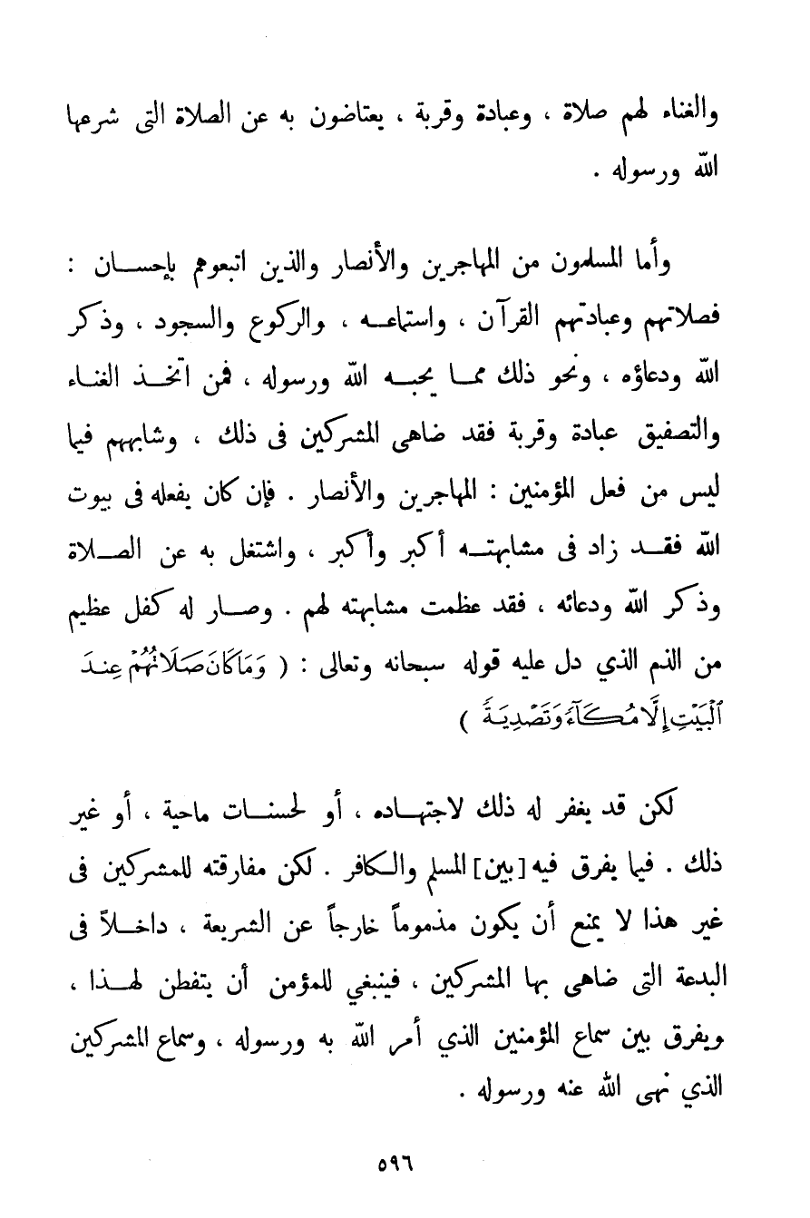وَالْغِنَاءَ لَهُمْ صَلَاةً وَعِبَادَةً وَقُرْبَةً يعتاضون بِهِ عَنْ الصَّلَاةِ الَّتِي شَرَعَهَا اللَّهُ وَرَسُولُهُ. وَأَمَّا الْمُسْلِمُونَ مِنْ الْمُهَاجِرِينَ وَالْأَنْصَارِ وَاَلَّذِينَ اتَّبَعُوهُمْ بِإِحْسَانِ: فَصَلَاتُهُمْ وَعِبَادَتُهُمْ الْقُرْآنُ وَاسْتِمَاعُهُ وَالرُّكُوعُ وَالسُّجُودُ وَذِكْرُ اللَّهِ وَدُعَاؤُهُ وَنَحْوُ ذَلِكَ مِمَّا يُحِبُّهُ اللَّهُ وَرَسُولُهُ فَمَنْ اتَّخَذَ الْغِنَاءَ وَالتَّصْفِيقَ عِبَادَةً وَقُرْبَةً فَقَدْ ضَاهَى الْمُشْرِكِينَ فِي ذَلِكَ وَشَابَهَهُمْ فِيمَا لَيْسَ مِنْ فِعْلِ الْمُؤْمِنِينَ: الْمُهَاجِرِينَ وَالْأَنْصَارِ. فَإِنْ كَانَ يَفْعَلُهُ فِي بُيُوتِ اللَّهِ فَقَدْ زَادَ فِي مُشَابَهَتِهِ أَكْبَرَ وَأَكْبَرَ وَاشْتَغَلَ بِهِ عَنْ الصَّلَاةِ وَذِكْرِ اللَّهِ وَدُعَائِهِ فَقَدْ عَظُمَتْ مُشَابَهَتُهُ لَهُمْ. وَصَارَ لَهُ كِفْلٌ عَظِيمٌ مِنْ الذَّمِّ الَّذِي دَلَّ عَلَيْهِ قَوْلُهُ سُبْحَانَهُ وَتَعَالَى: {وَمَا كَانَ صَلَاتُهُمْ عِنْدَ الْبَيْتِ إلَّا مُكَاءً وَتَصْدِيَةً} لَكِنْ قَدْ يُغْفَرُ لَهُ ذَلِكَ لِاجْتِهَادِهِ أَوْ لِحَسَنَاتِ مَاحِيَةٍ أَوْ غَيْرِ ذَلِكَ. فِيمَا يُفَرِّقُ فِيهِ بَيْنَ الْمُسْلِمِ وَالْكَافِرِ. لَكِنْ مُفَارَقَتُهُ لِلْمُشْرِكِينَ فِي غَيْرِ هَذَا لَا يَمْنَعُ أَنْ يَكُونَ مَذْمُومًا خَارِجًا عَنْ الشَّرِيعَةِ دَاخِلًا فِي الْبِدْعَةِ الَّتِي ضَاهَى بِهَا الْمُشْرِكِينَ فَيَنْبَغِي لِلْمُؤْمِنِ أَنْ يَتَفَطَّنَ لَهُ لِهَذَا وَيُفَرِّقَ بَيْنَ سَمَاعِ الْمُؤْمِنِينَ الَّذِي أَمَرَ اللَّهُ بِهِ وَرَسُولُهُ وَسَمَاعِ الْمُشْرِكِينَ الَّذِي نَهَى اللَّهُ عَنْهُ وَرَسُولُهُ.