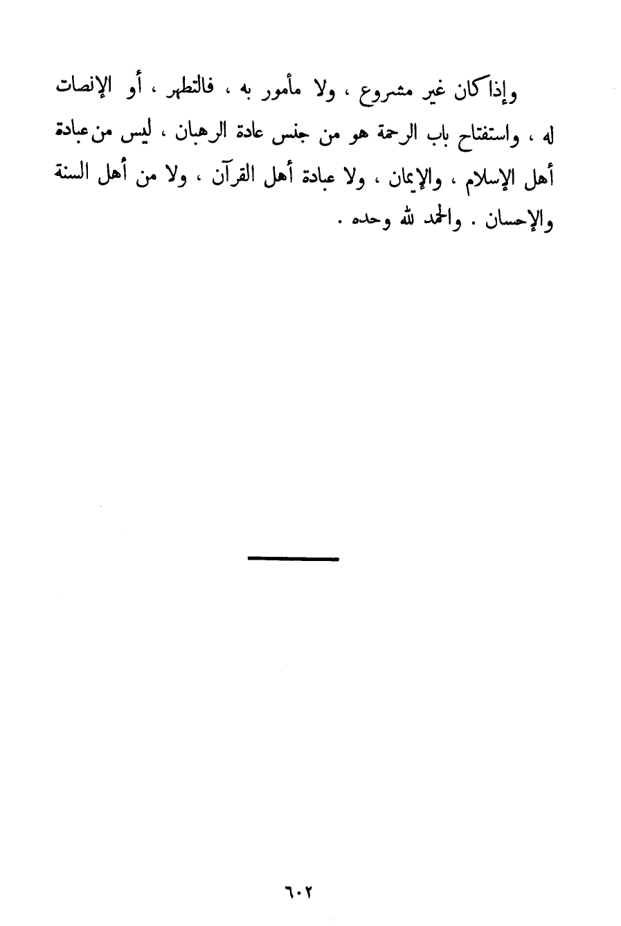 وَإِذَا كَانَ غَيْرَ مَشْرُوعٍ وَلَا مَأْمُورٍ بِهِ فَالتَّطَهُّرُ أَوْ الْإِنْصَاتُ لَهُ وَاسْتِفْتَاحُ بَابِ الرَّحْمَةِ هُوَ مِنْ جِنْسِ عَادَةِ الرُّهْبَانِ لَيْسَ مِنْ عِبَادَةِ أَهْلِ الْإِسْلَامِ وَالْإِيمَانِ وَلَا عِبَادَةِ أَهْلِ الْقُرْآنِ وَلَا مِنْ أَهْلِ السُّنَّةِ وَالْإِحْسَانِ. وَالْحَمْدُ لِلَّهِ وَحْدَهُ.
