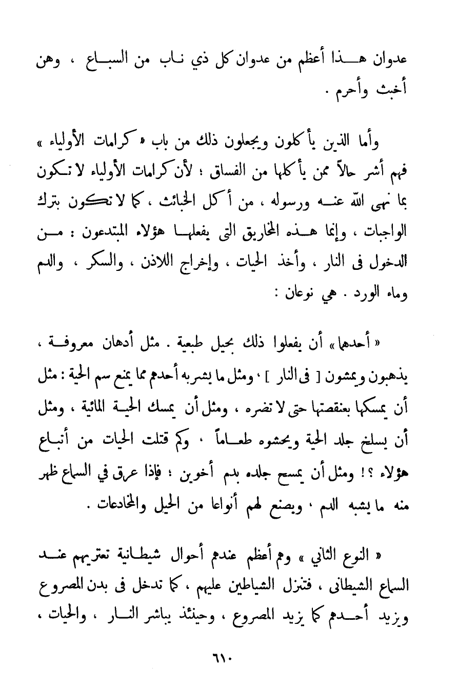 عُدْوَانُ هَذَا أَعْظَمَ مِنْ عُدْوَانِ كُلِّ ذِي نَابٍ مِنْ السِّبَاعِ وَهُنَّ أَخْبَثُ وأحرم. وَأَمَّا الَّذِينَ يَأْكُلُونَ وَيَجْعَلُونَ ذَلِكَ مِنْ بَابِ " كَرَامَاتِ الْأَوْلِيَاءِ " فَهُمْ أَشَرُّ حَالًا مِمَّنْ يَأْكُلُهَا مِنْ الْفُسَّاقِ؛ لِأَنَّ كَرَامَاتِ الْأَوْلِيَاءِ لَا تَكُونُ بِمَا نَهَى اللَّهُ عَنْهُ وَرَسُولُهُ مِنْ أَكْلِ الْخَبَائِثِ كَمَا لَا تَكُونُ بِتَرْكِ الْوَاجِبَاتِ وَإِنَّمَا هَذِهِ المخاريق الَّتِي يَفْعَلُهَا هَؤُلَاءِ الْمُبْتَدِعُونَ: مِنْ الدُّخُولِ فِي النَّارِ وَأَخْذِ الْحَيَّاتِ وَإِخْرَاجِ اللَّاذَنِ وَالسُّكَّرِ وَالدَّمِ وَمَاءِ الْوَرْدِ. هِيَ نَوْعَانِ: " أَحَدُهُمَا " أَنْ يَفْعَلُوا ذَلِكَ بِحِيَلِ طَبْعِيَّةٍ. مِثْلِ أَدْهَانٍ مَعْرُوفَةٍ يَذْهَبُونَ وَيَمْشُونَ فِي النَّارِ وَمِثْلُ مَا يَشْرَبُهُ أَحَدُهُمْ مِمَّا يَمْنَعُ سُمَّ الْحَيَّةِ: مِثْلُ أَنْ يُمْسِكَهَا بعنقصتها حَتَّى لَا تَضُرَّهُ وَمِثْلُ أَنْ يُمْسِكَ الْحَيَّةَ الْمَائِيَّةَ وَمِثْلُ أَنْ يَسْلُخَ جِلْدَ الْحَيَّةِ وَيَحْشُوَهُ طَعَامًا وَكَمْ قَتَلَتْ الْحَيَّاتُ مِنْ أَتْبَاعِ هَؤُلَاءِ وَمِثْلُ أَنْ يَمْسَحَ جِلْدَهُ بِدَمِ أَخَوَيْنِ؛ فَإِذَا عَرِقَ فِي السَّمَاعِ ظَهَرَ مِنْهُ مَا يُشْبِهُ الدَّمَ وَيَصْنَعُ لَهُمْ أَنْوَاعًا مِنْ الْحِيَلِ وَالْمُخَادَعَاتِ. " النَّوْعُ الثَّانِي " وَهُمْ أَعْظَمُ: عِنْدَهُمْ أَحْوَالٌ شَيْطَانِيَّةٌ تَعْتَرِيهِمْ عِنْدَ السَّمَاعِ الشَّيْطَانِيِّ فَتَنْزِلُ الشَّيَاطِينُ عَلَيْهِمْ كَمَا تَدْخُلُ فِي بَدَنِ الْمَصْرُوعِ وَيَزِيدُ أَحَدُهُمْ كَمَا يَزِيدُ الْمَصْرُوعُ وَحِينَئِذٍ يُبَاشِرُ النَّارَ وَالْحَيَّاتِ