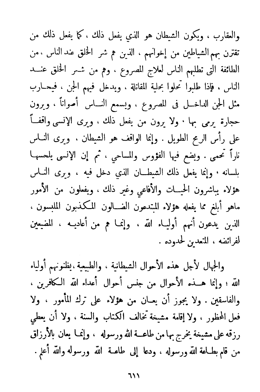 وَالْعَقَارِبَ وَيَكُونُ الشَّيْطَانُ هُوَ الَّذِي يَفْعَلُ ذَلِكَ كَمَا يَفْعَلُ ذَلِكَ مَنْ تَقْتَرِنُ بِهِمْ الشَّيَاطِينُ مِنْ إخْوَانِهِمْ الَّذِينَ هُمْ شَرُّ الْخَلْقِ عِنْدَ النَّاسِ مِنْ الطَّائِفَةِ الَّتِي تَطْلُبُهُمْ النَّاسُ لِعِلَاجِ الْمَصْرُوعِ وَهُمْ مِنْ شَرِّ الْخَلْقِ عِنْدَ النَّاسِ فَإِذَا طَلَبُوا تَحَلَّوْا بِحِلْيَةِ الْمُقَاتِلَةِ وَيَدْخُلُ فِيهِمْ الْجِنُّ فَيُحَارِبُ مِثْلَ الْجِنِّ الدَّاخِلِ فِي الْمَصْرُوعِ وَيَسْمَعُ النَّاسُ أَصْوَاتًا وَيَرَوْنَ حِجَارَةً يُرْمَى بِهَا وَلَا يَرَوْنَ مَنْ يَفْعَلُ ذَلِكَ وَيَرَى الْإِنْسِيَّ وَاقِفًا عَلَى رَأْسِ الرُّمْحِ الطَّوِيلِ. وَإِنَّمَا الْوَاقِفُ هُوَ الشَّيْطَانُ وَيَرَى النَّاسُ نَارًا تُحْمَى. وَيَضَعُ فِيهَا الْفُؤُوسَ وَالْمَسَاحِيَ ثُمَّ إنَّ الْإِنْسِيَّ يَلْحَسُهَا بِلِسَانِهِ وَإِنَّمَا يَفْعَلُ ذَلِكَ الشَّيْطَانُ الَّذِي دَخَلَ فِيهِ وَيَرَى النَّاسُ هَؤُلَاءِ يُبَاشِرُونَ الْحَيَّاتِ وَالْأَفَاعِيَ وَغَيْرَ ذَلِكَ وَيَفْعَلُونَ مِنْ الْأُمُورِ مَا هُوَ أَبْلَغُ مِمَّا يَفْعَلُهُ هَؤُلَاءِ الْمُبْتَدِعُونَ الضَّالُّونَ الْمُكَذِّبُونَ الْمُلَبِّسُونَ الَّذِينَ يَدَّعُونَ أَنَّهُمْ أَوْلِيَاءُ اللَّهِ وَإِنَّمَا هُمْ مِنْ أَعَادِيهِ الْمُضَيِّعِينَ لِفَرَائِضِهِ الْمُتَعَدِّينَ لِحُدُودِهِ. وَالْجُهَّالِ لِأَجْلِ هَذِهِ الْأَحْوَالِ الشَّيْطَانِيَّةِ وَالطَّبِيعِيَّةِ يَظُنُّوهُمْ أَوْلِيَاءَ اللَّهِ؛ وَإِنَّمَا هَذِهِ الْأَحْوَالُ مِنْ جِنْسِ أَحْوَالِ أَعْدَاءِ اللَّهِ الْكَافِرِينَ وَالْفَاسِقِينَ. وَلَا يَجُوزُ أَنْ يُعَانَ مِنْ هَؤُلَاءِ عَلَى تَرْكِ الْمَأْمُورِ وَلَا فِعْلِ الْمَحْظُورِ وَلَا إقَامَةِ مَشْيَخَةٍ تُخَالِفُ الْكِتَابَ وَالسُّنَّةَ وَلَا أَنْ يُعْطِيَ رِزْقَهُ عَلَى مَشْيَخَةٍ يَخْرُجُ بِهَا مِنْ طَاعَةِ اللَّهِ وَرَسُولِهِ وَإِنَّمَا يُعَانُ بِالْأَرْزَاقِ مَنْ قَامَ بِطَاعَةِ اللَّهِ وَرَسُولِهِ وَدَعَا إلَى طَاعَةِ اللَّهِ وَرَسُولِهِ وَاَللَّهُ أَعْلَمُ.