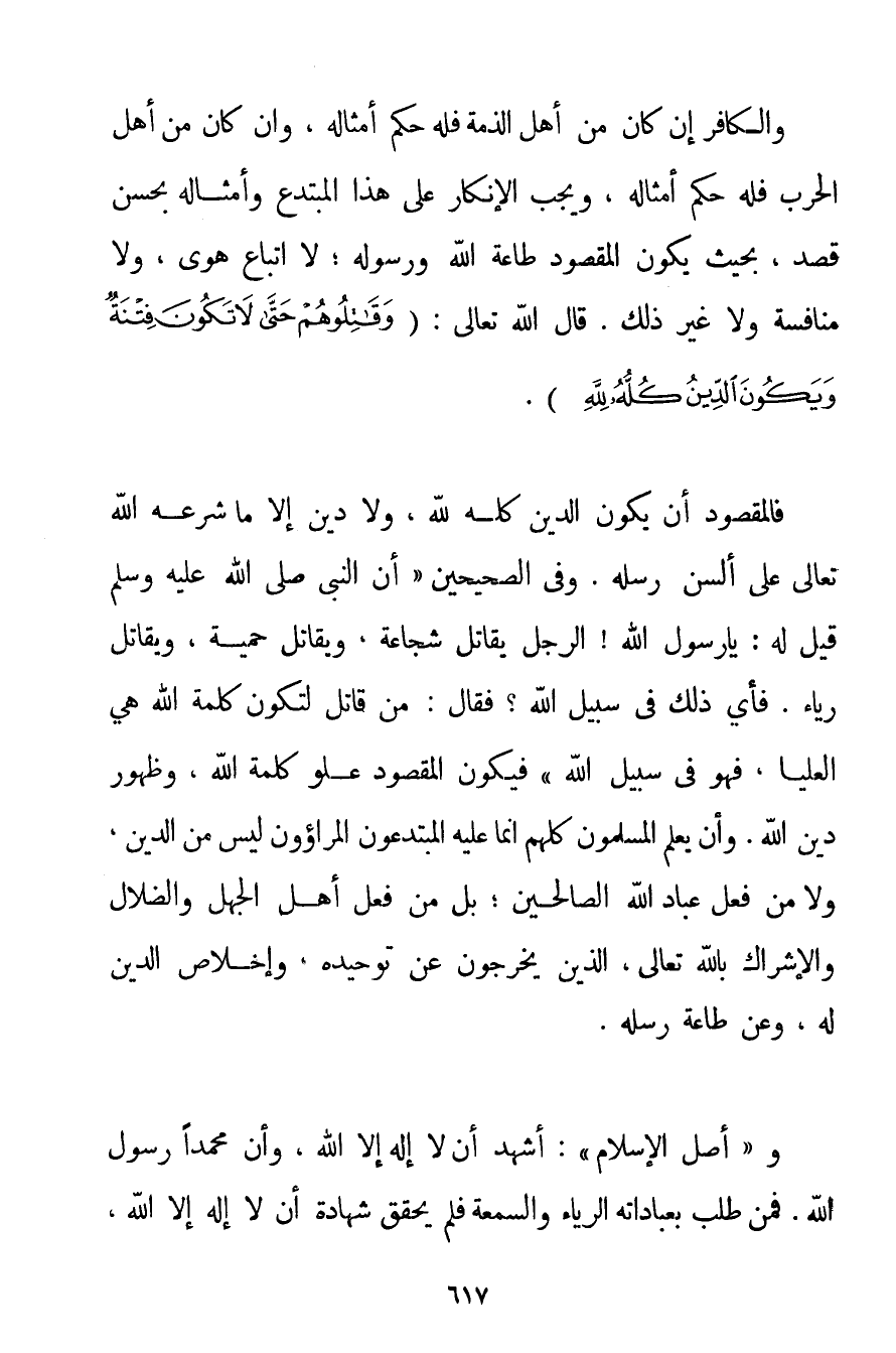 وَالْكَافِرُ إنْ كَانَ مِنْ أَهْلِ الذِّمَّةِ فَلَهُ حُكْمُ أَمْثَالِهِ وَإِنْ كَانَ مِنْ أَهْلِ الْحَرْبِ فَلَهُ حُكْمُ أَمْثَالِهِ وَيَجِبُ الْإِنْكَارُ عَلَى هَذَا الْمُبْتَدِعِ وَأَمْثَالِهِ بِحُسْنِ قَصْدٍ بِحَيْثُ يَكُونُ الْمَقْصُودُ طَاعَةَ اللَّهِ وَرَسُولِهِ؛ لَا اتِّبَاعَ هَوًى وَلَا مُنَافَسَةَ وَلَا غَيْرَ ذَلِكَ. قَالَ اللَّهُ تَعَالَى: {وَقَاتِلُوهُمْ حَتَّى لَا تَكُونَ فِتْنَةٌ وَيَكُونَ الدِّينُ كُلُّهُ لِلَّهِ} . فَالْمَقْصُودُ أَنْ يَكُونَ الدِّينُ كُلُّهُ لِلَّهِ وَلَا دِينَ إلَّا مَا شَرَعَهُ اللَّهُ تَعَالَى عَلَى أَلْسُنِ رُسُلِهِ. وَفِي الصَّحِيحَيْنِ {أَنَّ النَّبِيَّ صَلَّى اللَّهُ عَلَيْهِ وَسَلَّمَ قِيلَ لَهُ: يَا رَسُولَ اللَّهِ الرَّجُلُ يُقَاتِلُ شَجَاعَةً وَيُقَاتِلُ حَمِيَّةً وَيُقَاتِلُ رِيَاءً. فَأَيُّ ذَلِكَ فِي سَبِيلِ اللَّهِ؟ فَقَالَ: مَنْ قَاتَلَ لِتَكُونَ كَلِمَةُ اللَّهِ هِيَ الْعُلْيَا فَهُوَ فِي سَبِيلِ اللَّهِ} " فَيَكُونُ الْمَقْصُودُ عُلُوَّ كَلِمَةِ اللَّهِ وَظُهُورَ دِينِ اللَّهِ. وَأَنْ يَعْلَمَ الْمُسْلِمُونَ كُلُّهُمْ أَنَّ مَا عَلَيْهِ الْمُبْتَدِعُونَ الْمُرَاءُونَ لَيْسَ مِنْ الدِّينِ وَلَا مِنْ فِعْلِ عِبَادِ اللَّهِ الصَّالِحِينَ؛ بَلْ مِنْ فِعْلِ أَهْلِ الْجَهْلِ وَالضَّلَالِ وَالْإِشْرَاكِ بِاَللَّهِ تَعَالَى الَّذِينَ يَخْرُجُونَ عَنْ تَوْحِيدِهِ وَإِخْلَاصِ الدِّينِ لَهُ وَعَنْ طَاعَةِ رُسُلِهِ. وَ " أَصْلُ الْإِسْلَامِ ": أَشْهَدُ أَنْ لَا إلَهَ إلَّا اللَّهُ وَأَنَّ مُحَمَّدًا رَسُولُ اللَّهِ. فَمَنْ طَلَبَ بِعِبَادَاتِهِ الرِّيَاءَ وَالسُّمْعَةَ فَلَمْ يُحَقِّقْ شَهَادَةَ أَنْ لَا إلَهَ إلَّا اللَّهُ