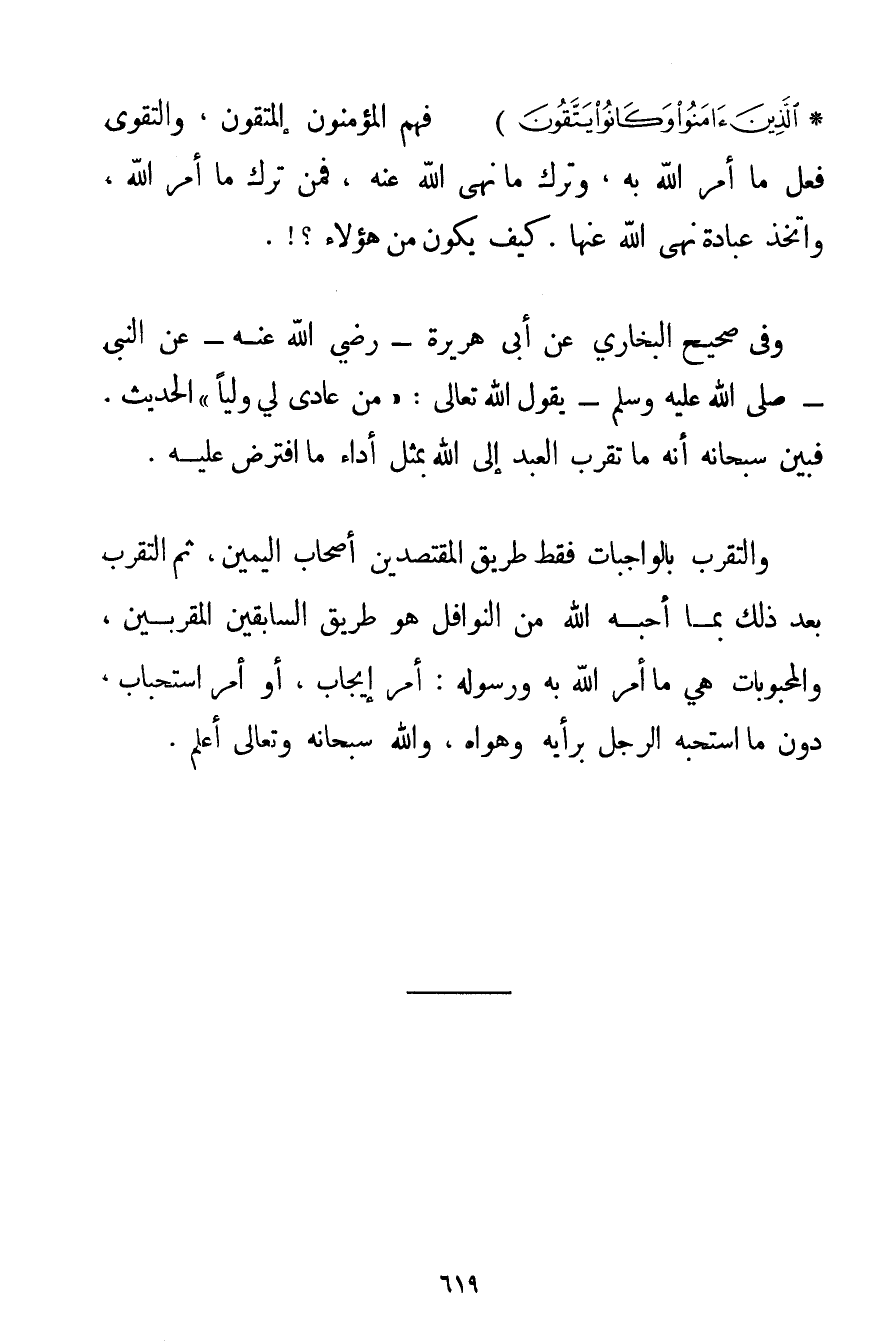 يَحْزَنُونَ} {الَّذِينَ آمَنُوا وَكَانُوا يَتَّقُونَ} فَهُمْ الْمُؤْمِنُونَ الْمُتَّقُونَ وَالتَّقْوَى فِعْلُ مَا أَمَرَ اللَّهُ بِهِ وَتَرْكُ مَا نَهَى اللَّهُ عَنْهُ فَمَنْ تَرَكَ مَا أَمَرَ اللَّهُ وَاِتَّخَذَ عِبَادَةً نَهَى اللَّهُ عَنْهَا. كَيْفَ يَكُونُ مِنْ هَؤُلَاءِ. وَفِي صَحِيحِ الْبُخَارِيِّ عَنْ أَبِي هُرَيْرَةَ - رَضِيَ اللَّهُ عَنْهُ - عَنْ النَّبِيِّ - صَلَّى اللَّهُ عَلَيْهِ وَسَلَّمَ - يَقُولُ اللَّهُ تَعَالَى: {مَنْ عَادَى لِي وَلِيًّا} " الْحَدِيثَ. فَبَيَّنَ سُبْحَانَهُ أَنَّهُ مَا تَقَرَّبَ الْعَبْدُ إلَى اللَّهِ بِمِثْلِ أَدَاءِ مَا افْتَرَضَ عَلَيْهِ. وَالتَّقَرُّبُ بِالْوَاجِبَاتِ فَقَطْ طَرِيقُ الْمُقْتَصِدِينَ أَصْحَابِ الْيَمِينِ ثُمَّ التَّقَرُّبُ بَعْدَ ذَلِكَ بِمَا أَحَبَّهُ اللَّهُ مِنْ النَّوَافِلِ هُوَ طَرِيقُ السَّابِقِينَ الْمُقَرَّبِينَ وَالْمَحْبُوبَاتُ هِيَ مَا أَمَرَ اللَّهُ بِهِ وَرَسُولُهُ: أَمْرَ إيجَابٍ أَوْ أَمْرَ اسْتِحْبَابٍ دُونَ مَا اسْتَحَبَّهُ الرَّجُلُ بِرَأْيِهِ وَهَوَاهُ وَاَللَّهُ سُبْحَانَهُ وَتَعَالَى أَعْلَمُ.